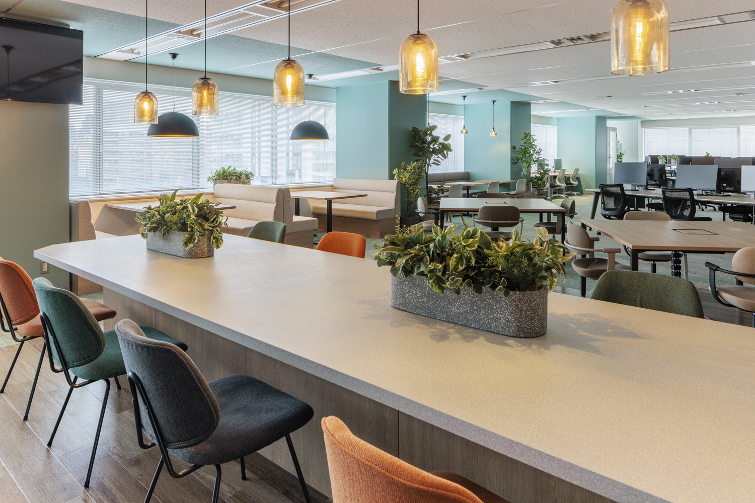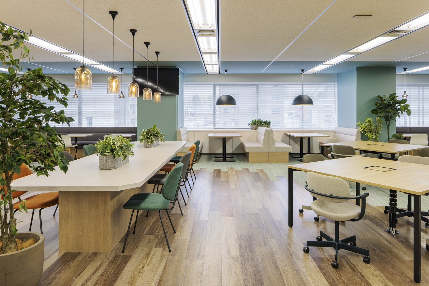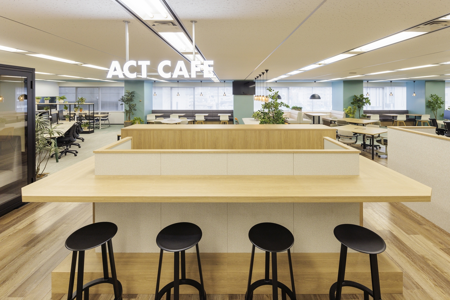 コンセプトは『CODE』。コードを書いてシステムを構築していくように、最適な働き方を選択できるオフィスづくりを目指しました。出社後に自分で働く場所を選び、1日の中で自由に移動することで、自然なコミュニケーションが生まれてチームのつながりも深まるなど様々なアクションが生まれる工夫を各所に落とし込んでいます。ワークスペースは、従来の島型デスクが並んでいた執務室のレイアウトを一新し、中央には多目的に使えるオープンスペースを設置。窓側の上長席が並んでいたエリアは、気分や業務内容に応じて選べるスペースを再構築しました。デスクのレイアウトにも動きを加え、出社したらその日の働き方に合わせて自由に座席を選択できる運用にしています。社員エントランス付近にはカウンター型のコミュニティースペース「ACT CAFE」を新設し、交流と自社カルチャーを感じられる空間に。社員一人ひとりがカルチャーの担い手であるという意識を育み、心理的安全性を高める工夫にもつながっています。デザインはIT企業としての先進性と信頼感に、自然で居心地のよさを融合させた空間づくりを目指しました。川の流れをモチーフに、やわらかな色合いや素材で、カフェのような自由な雰囲気と、会話が生まれやすい温かな印象を醸成。執務エリアにはグリーンを多く取り入れ、リラックスしながら集中できる環境を整えています。従来の堅いイメージを払拭し、コミュニケーションのとりやすい、明るい空間を演出しています。