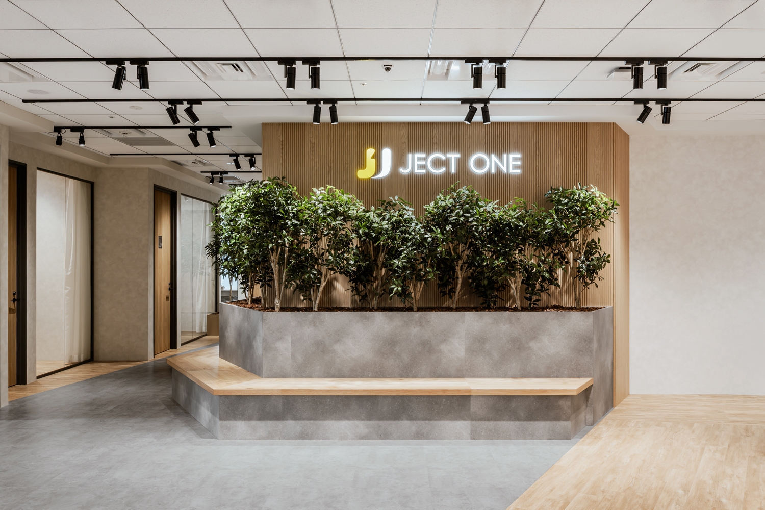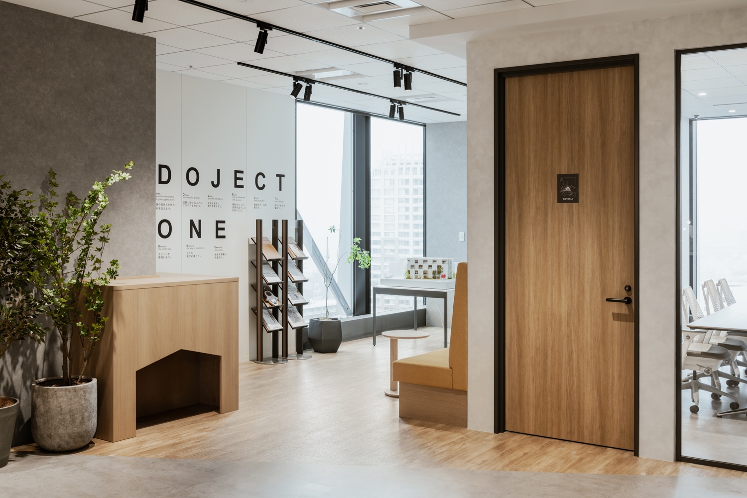コンセプトは『JECT TOWN』。リノベーションを活用し、街を活性化させる業務内容であることから、ジェクトワン様が描く街のイメージを表現しました。 回遊できるメイン動線や不規則な家具の配置、ブランコ型のソファーを配置することでより街らしい風景を演出。事業内容との親和性に加え、オフィス内装との調和を考えたシンプルでスタイリッシュなグラフィックも施しています。会議室のサインは、アルファベット順に「A」から「K」までの文字から始まる駅名をルーム名とし、駅名にちなんだイラストを作成し都市のイメージが伝わるよう工夫しました。イラストは空間に自然に溶け込むよう内装との一体感を意識しながら、ミニマルな線画で統一し、洗練された印象と視認性のバランスにもこだわりました。