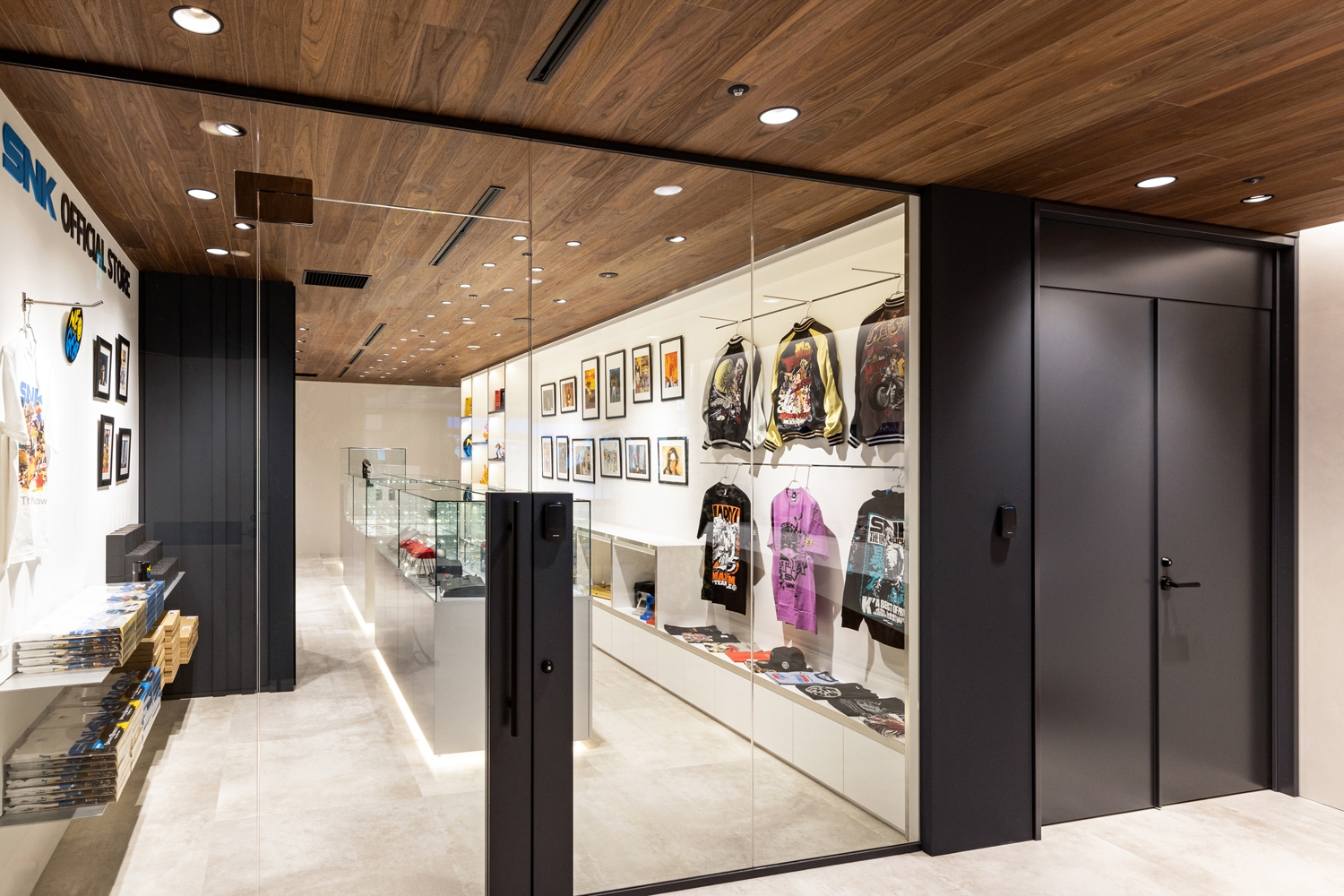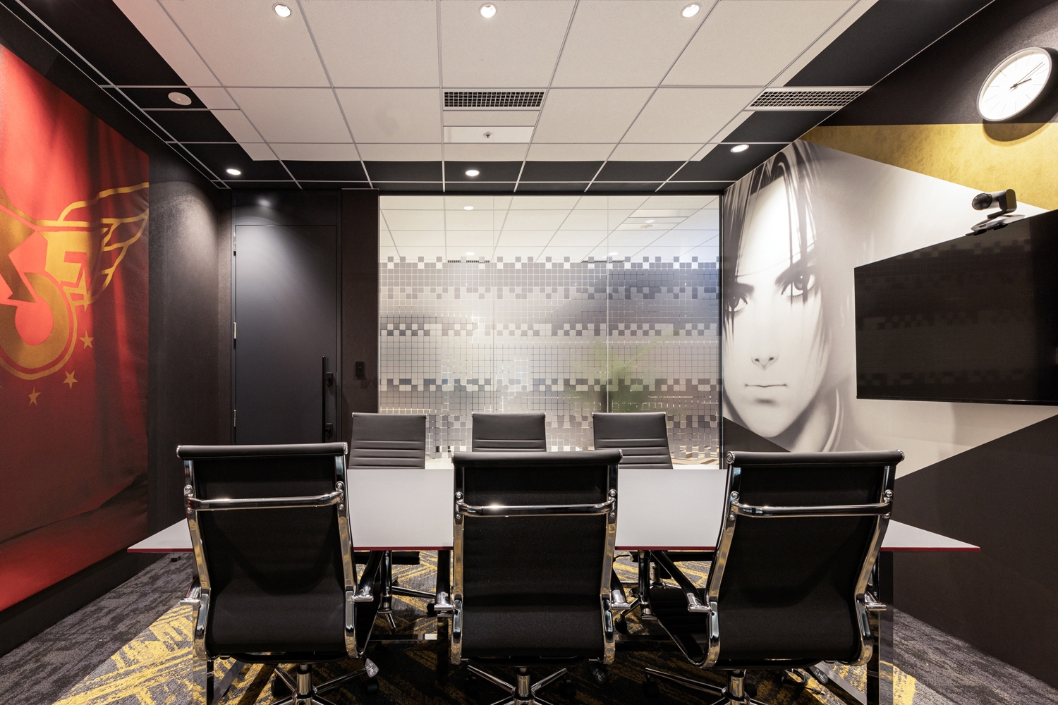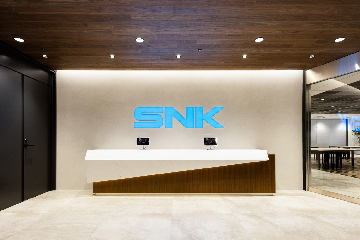 ゲームメーカーであるSNK様のオフィス移転プロジェクト。『RUSH』のコンセプトのもと、これからの世界に“RUSH”をかける本拠地となるオフィスを構築しました。多くのファンや海外の方も訪れる世界のSNK本社として、常に新しさを感じていただけるよう、SNK様ご協力のもとすべての会議室にゲームのメインキャラクターをあしらい、それぞれのキャラクターが引き立つよう世界観をデザインしました。一方エントランスはシンプルに信頼感を演出しています。イベントスペースには巨大モニターを設置し、フレキシブルにレイアウトが組める家具や植栽を配置しました。天井や壁ににドット絵のデザインを取り入れることで懐かしさが残る遊び心のあるデザインにしています。ワークスペースは固定席ながら座席数を最大限確保し、将来的な増員も見越した設計としました。ブランディングを第一に考えた、今後もクオリティの高いエンタテインメントを世界へ発信し続けるオフィスです。