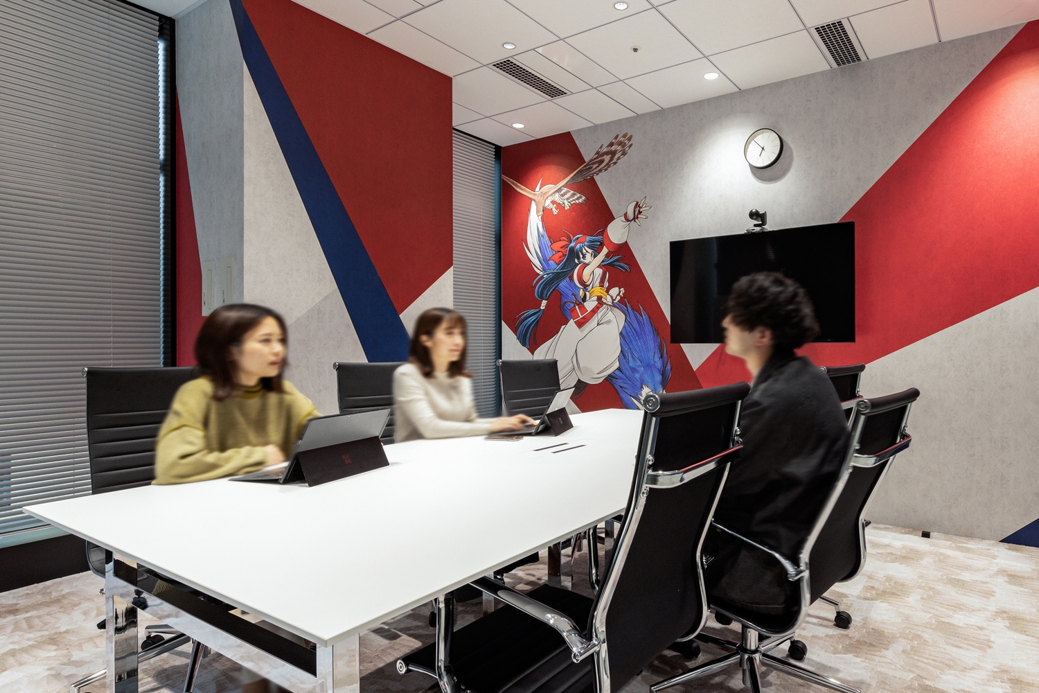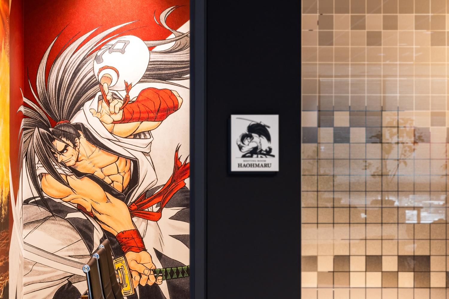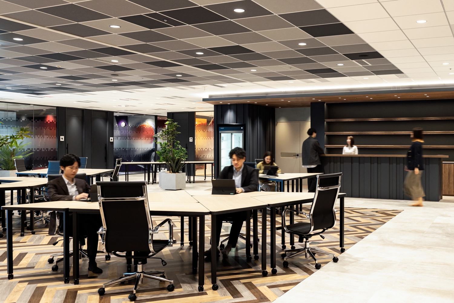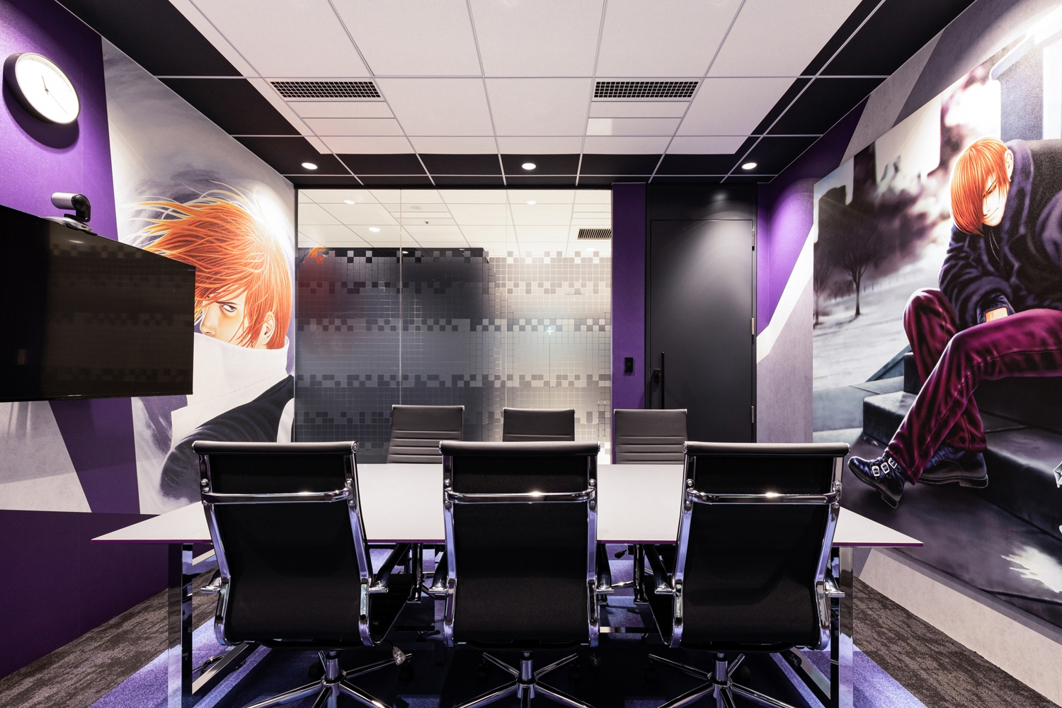 ゲームメーカーであるSNK様のオフィス移転プロジェクト。『RUSH』のコンセプトのもと、これからの世界に“RUSH”をかける本拠地となるオフィスを構築しました。多くのファンや海外の方も訪れる世界のSNK本社として、常に新しさを感じていただけるよう、SNK様ご協力のもとすべての会議室にゲームのメインキャラクターをあしらい、それぞれのキャラクターが引き立つよう世界観をデザインしました。一方エントランスはシンプルに信頼感を演出しています。イベントスペースには巨大モニターを設置し、フレキシブルにレイアウトが組める家具や植栽を配置しました。天井や壁ににドット絵のデザインを取り入れることで懐かしさが残る遊び心のあるデザインにしています。ワークスペースは固定席ながら座席数を最大限確保し、将来的な増員も見越した設計としました。ブランディングを第一に考えた、今後もクオリティの高いエンタテインメントを世界へ発信し続けるオフィスです。