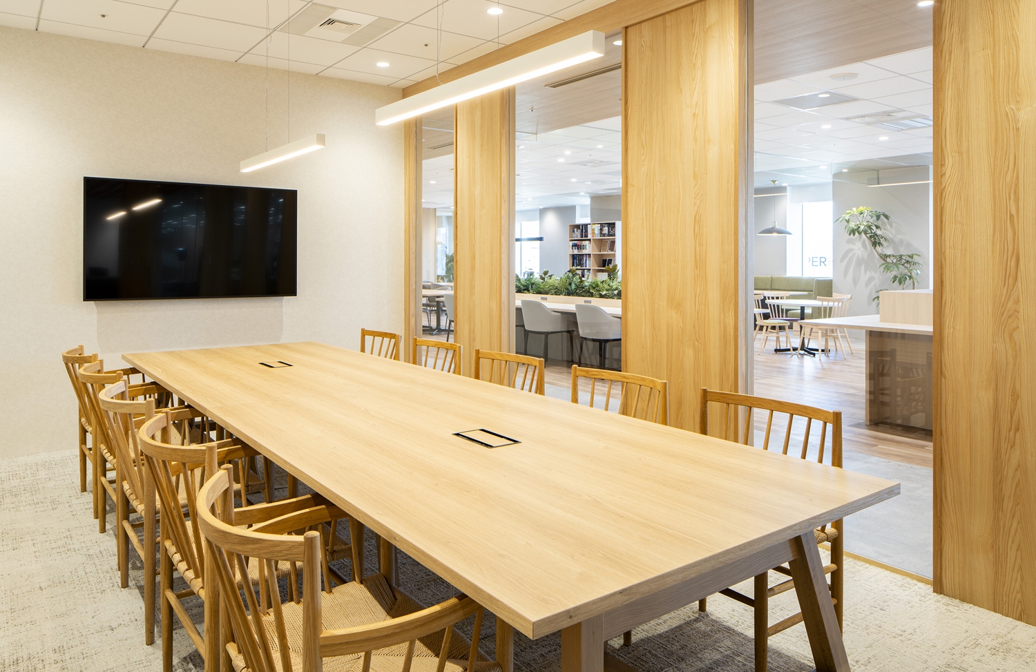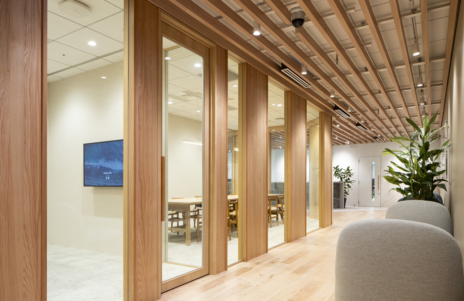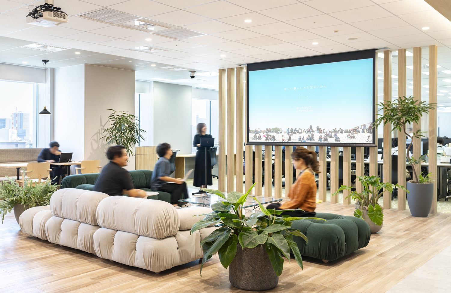 レイアウトは、リフレッシュや打合せなど多目的な用途で人が集まることができるスポットをオフィスの中心に集約。ワークエリアも以前は2ヶ所に分断されていましたが、1つにまとめてコミュニケーションを取りやすくしました。ブランディングにあわせ「住まい」を手がけている会社らしさを感じられるよう、デザインは木素材を多用して温かみのある空間に。木とガラスを交互に配置することで抜け感を出しています。人の動きやコミュニケーションがさまざまな場所から見えるため、どこにいてもつながりを感じることができるオフィスになりました。