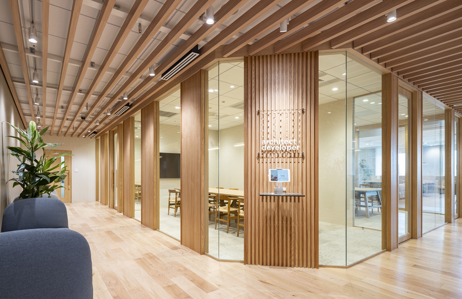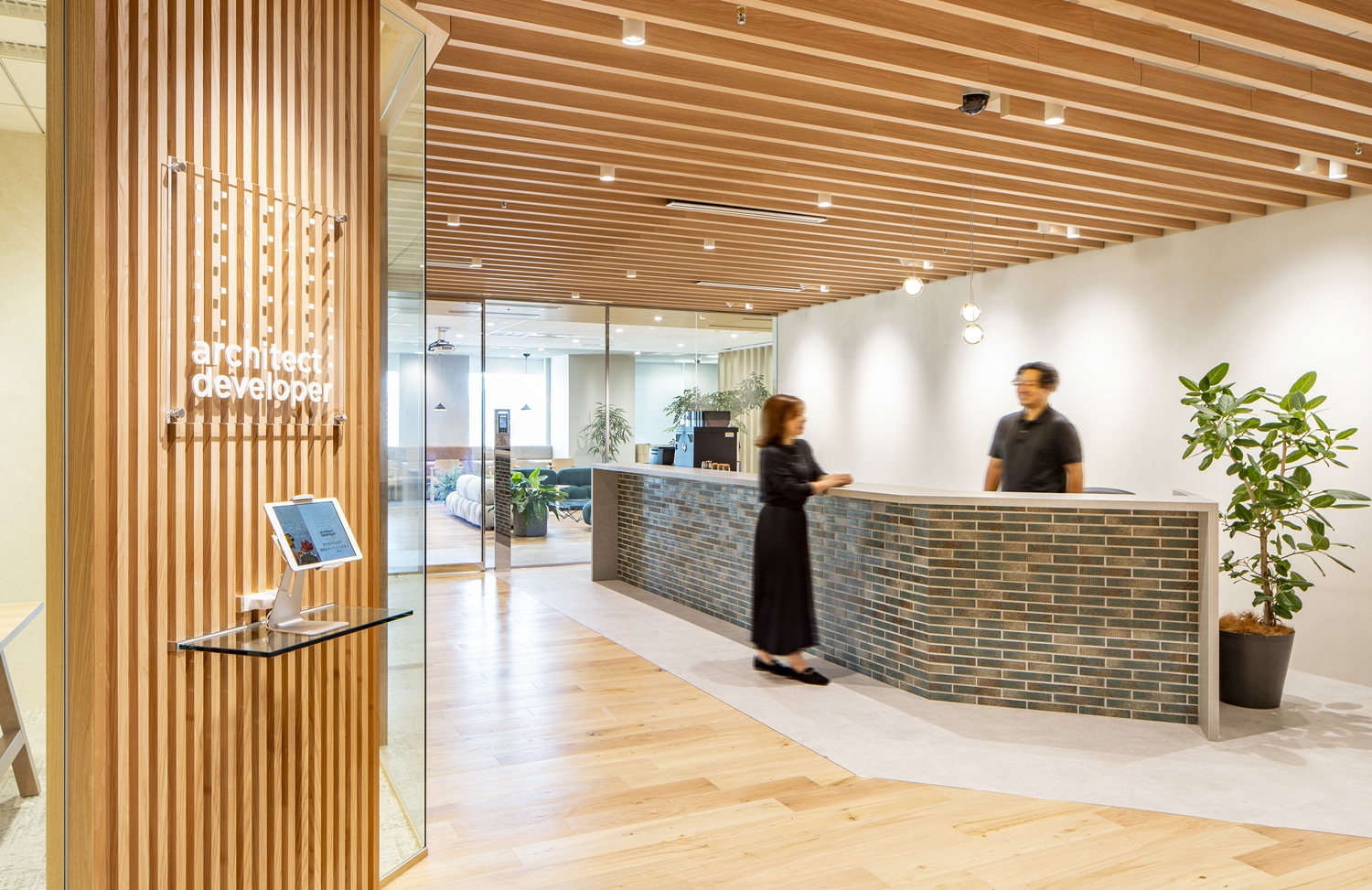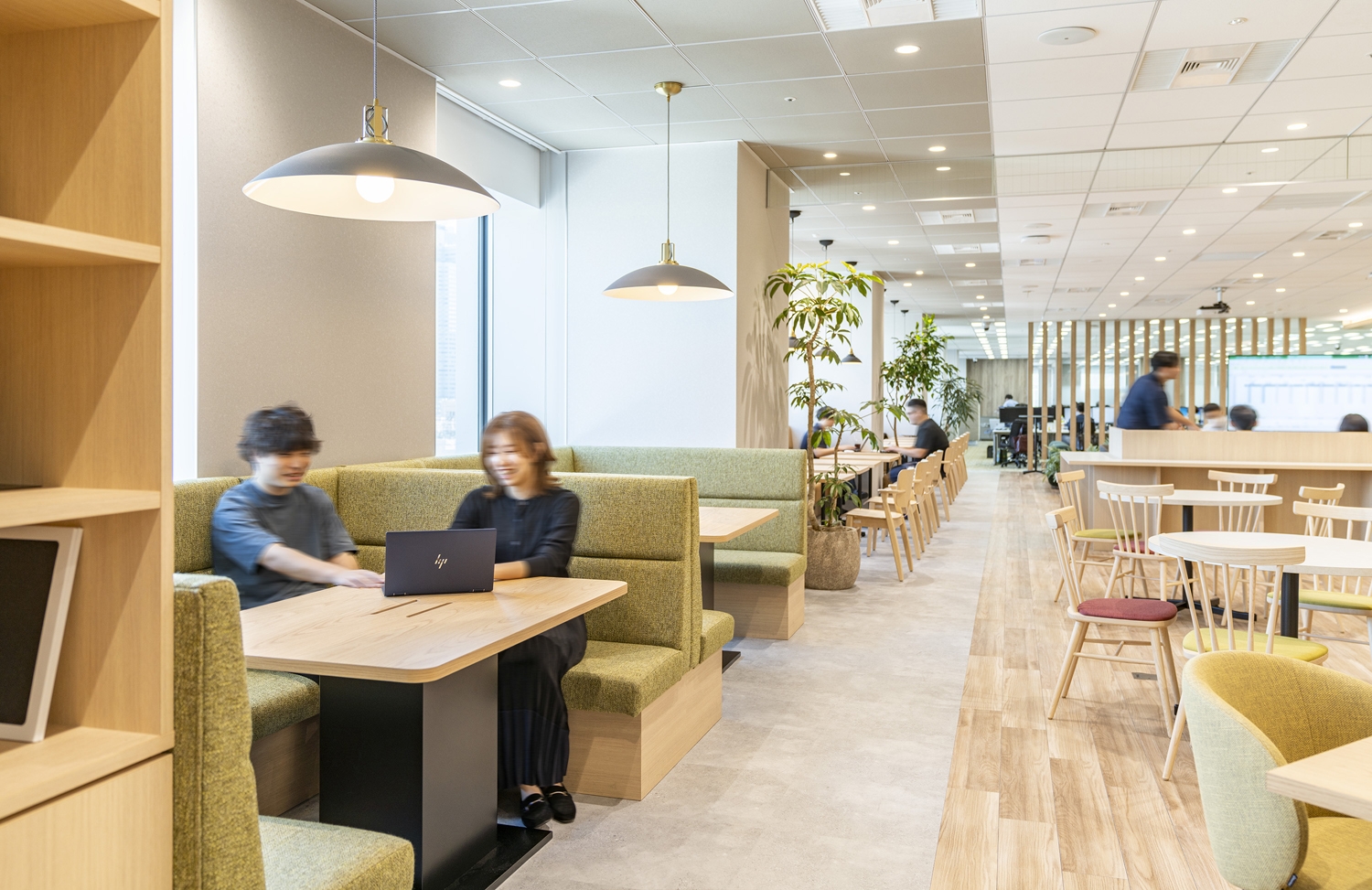 レイアウトは、リフレッシュや打合せなど多目的な用途で人が集まることができるスポットをオフィスの中心に集約。ワークエリアも以前は2ヶ所に分断されていましたが、1つにまとめてコミュニケーションを取りやすくしました。ブランディングにあわせ「住まい」を手がけている会社らしさを感じられるよう、デザインは木素材を多用して温かみのある空間に。木とガラスを交互に配置することで抜け感を出しています。人の動きやコミュニケーションがさまざまな場所から見えるため、どこにいてもつながりを感じることができるオフィスになりました。