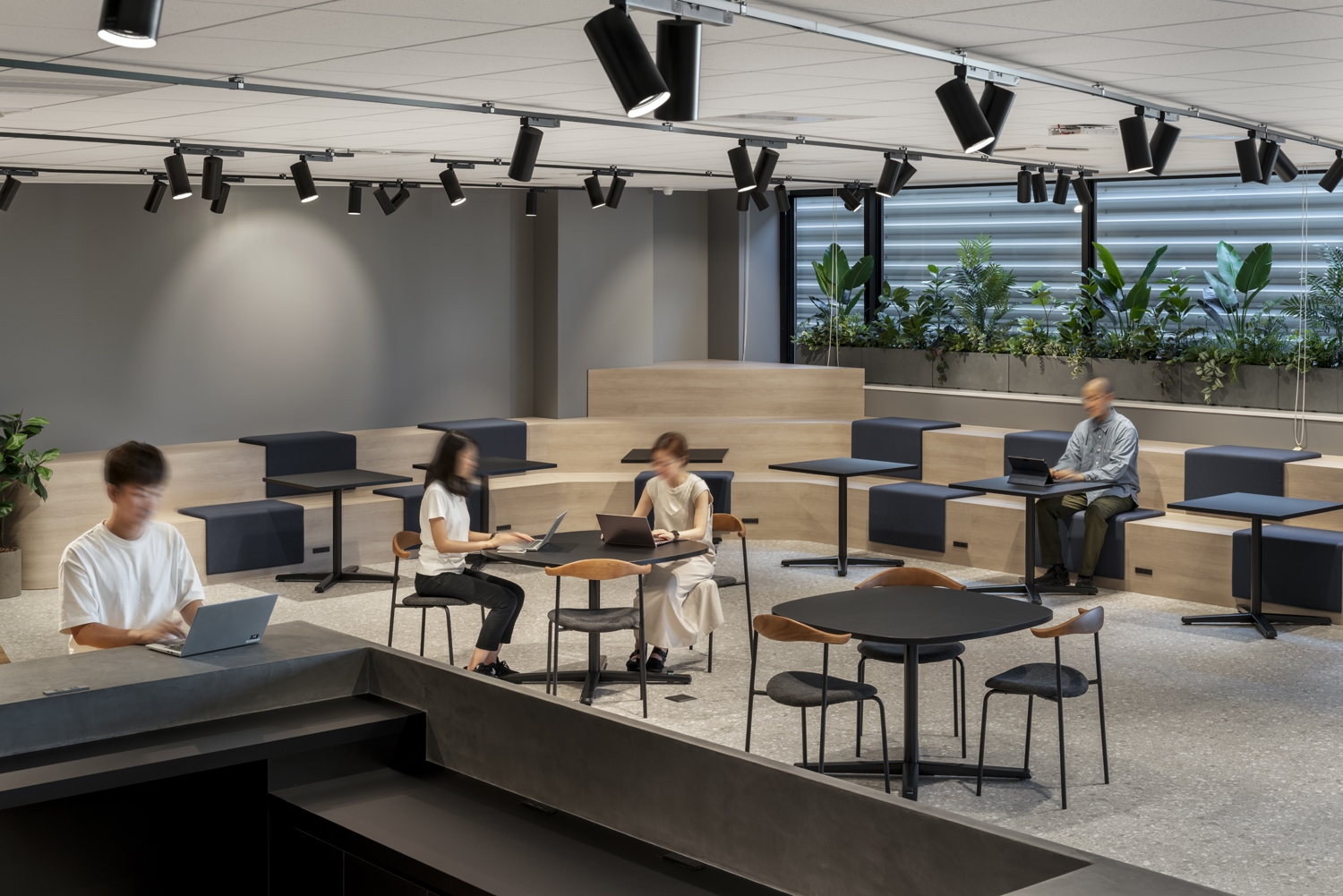 エンジニア職が多く、一人で集中する仕事が多い中でも多様な場所で多くの人とのコミュニケーションを通して新しい発想や視点を得られるようにしたいという要望がありました。コミュニケーションの円滑化を図るため、「ひとつの大きな空間」としてのオフィスデザインを目指しました。
