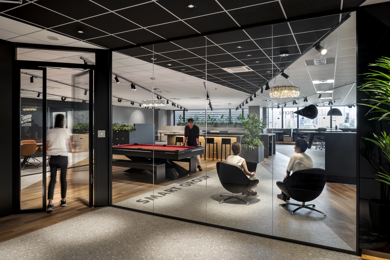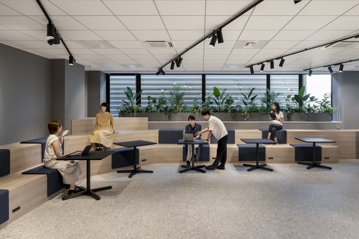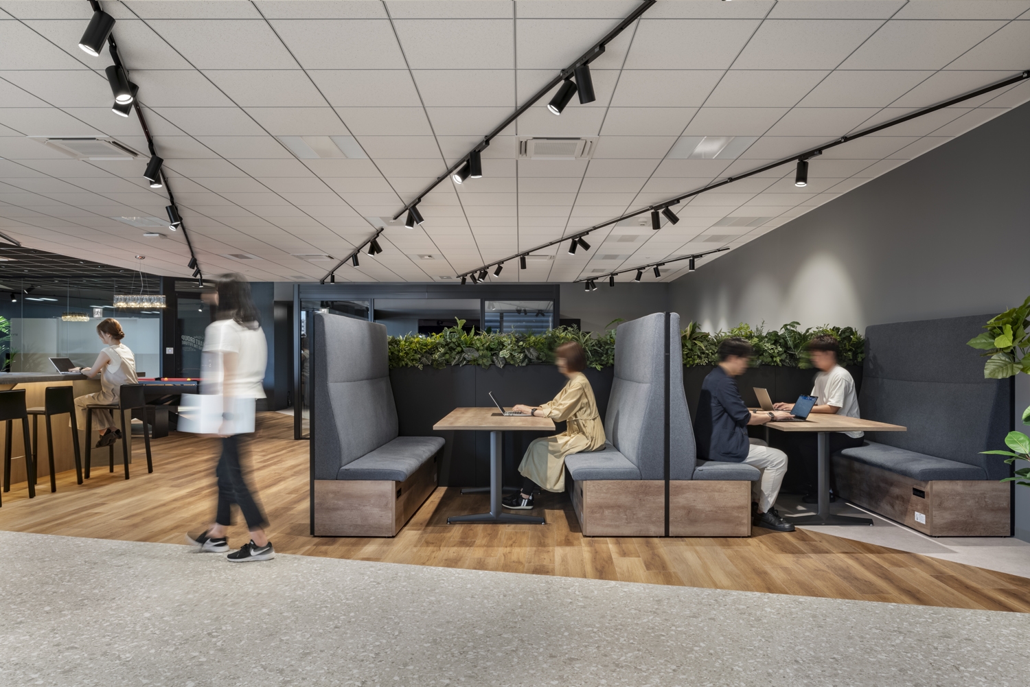 エントランスからオフィスの奥まで視界が抜けるよう、ガラス壁と高さを抑えた家具を採用しました。できる限り間仕切りを設けず開放感を持たせています。一部でフリーアドレス、ABWを採用し、オープンエリアや集中席など多様な席を設け、その日の気分や業務内容に合わせてはたらく場所を選択することができるようにしました。集中とコミュニケーションが同居できる環境をつくることで、静と動のコントラストをもたせ、誰もがはたらきやすいオフィスになっています。