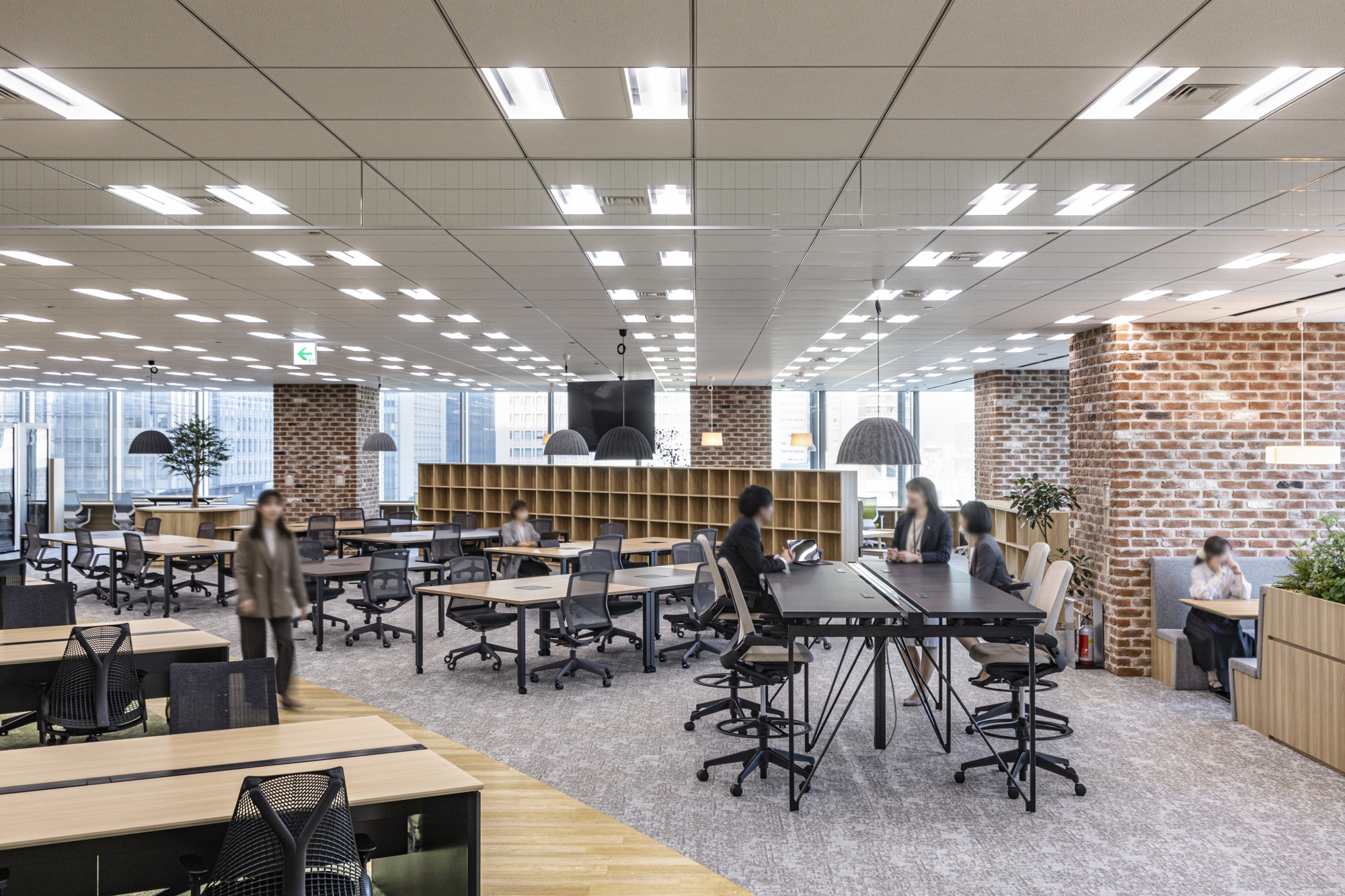 執務エリアは、笑顔であふれるワークスペースを目指し、オフィスのある東京駅の赤レンガから連想したブリックタイルやグリーン柄のカーペットなど楽しさを感じられる色味や素材で構成。エントランスから続く円弧状のメイン動線沿いにベースワークデスクを配置しました。円弧状に配置することで社内の一体感と連続配置した際の単調さを払拭させています。円弧動線の外側には、協業スペース「チームワーク」、さらに外側に集中スペースやリフレッシュ兼コワーキングスペース「リフレッシュワーク」があり、三層のワークスペースで多様な業務に対応できるデザインになっています。