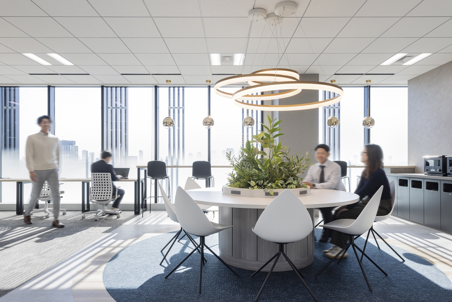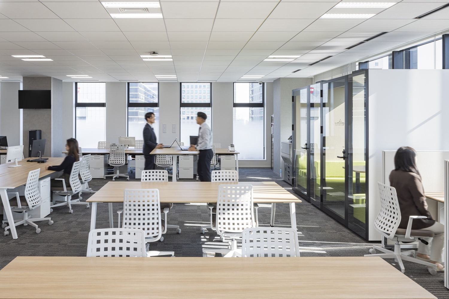 基本的に固定席で運用している中、営業部門はフリーアドレスにて運用。コミュニケーションを活性化させるため、サンプルを広げながらミーティングができるファミレス席や昇降テーブルを導入しました。リフレッシュエリアはワークスペースとしても活用できるよう、カウンター席や円形テーブルにコンセント埋め込み、業務をしながら部署間のコミュニケーションも取れる空間を構築しました。