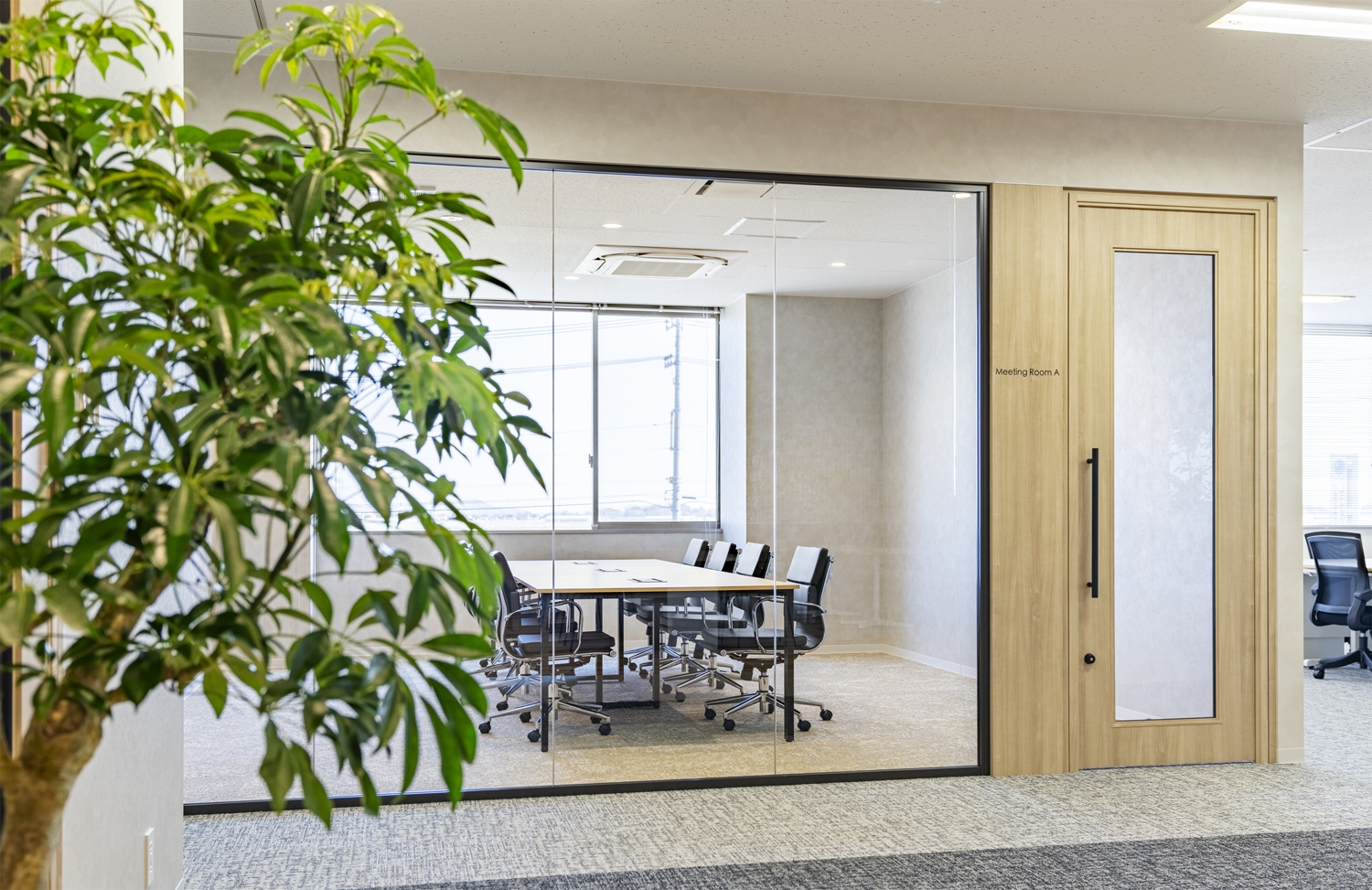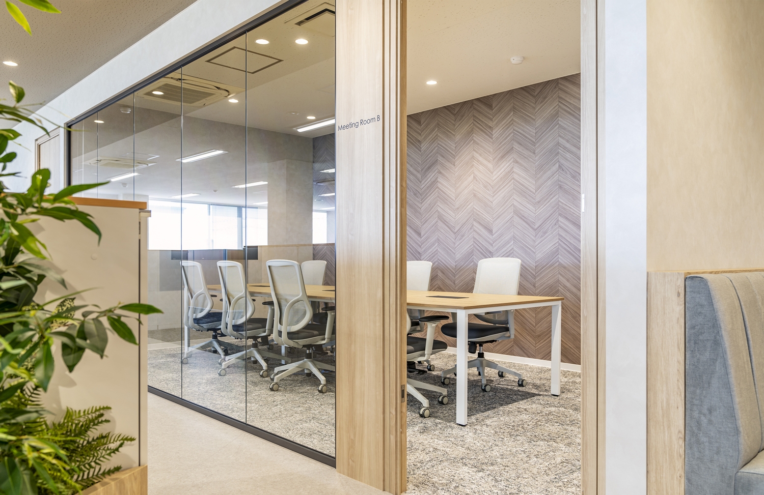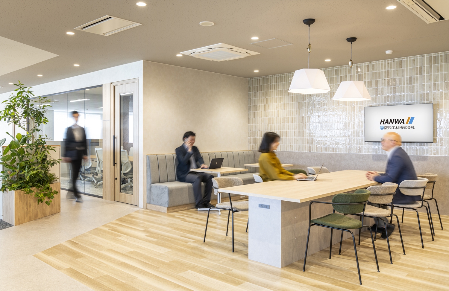 従業員の皆さまが快適にはたらけるよう、デスク間隔を広げてパーソナルスペースを確保しました。フォンブースやリフレッシュエリアの設置により、集中して作業を行う場とリラックスできる場を明確に分けることで、効率的かつ柔軟なはたらき方をサポートしています。デザイン面では、木材や淡い色味のマテリアルを使用し、1階との統一性と明るさを演出。床の貼り分けにより動線を滑らかにし、窓からの眺望を活かしたレイアウトと会議室のガラス間仕切りは、執務空間全体に明るさをもたらしています。ビッグカウンターを備えたリフレッシュエリアでは、休憩と仕事の両立が可能で、コミュニケーションの場としても機能します。