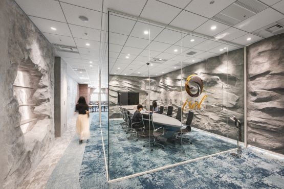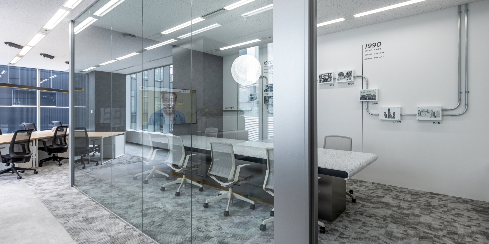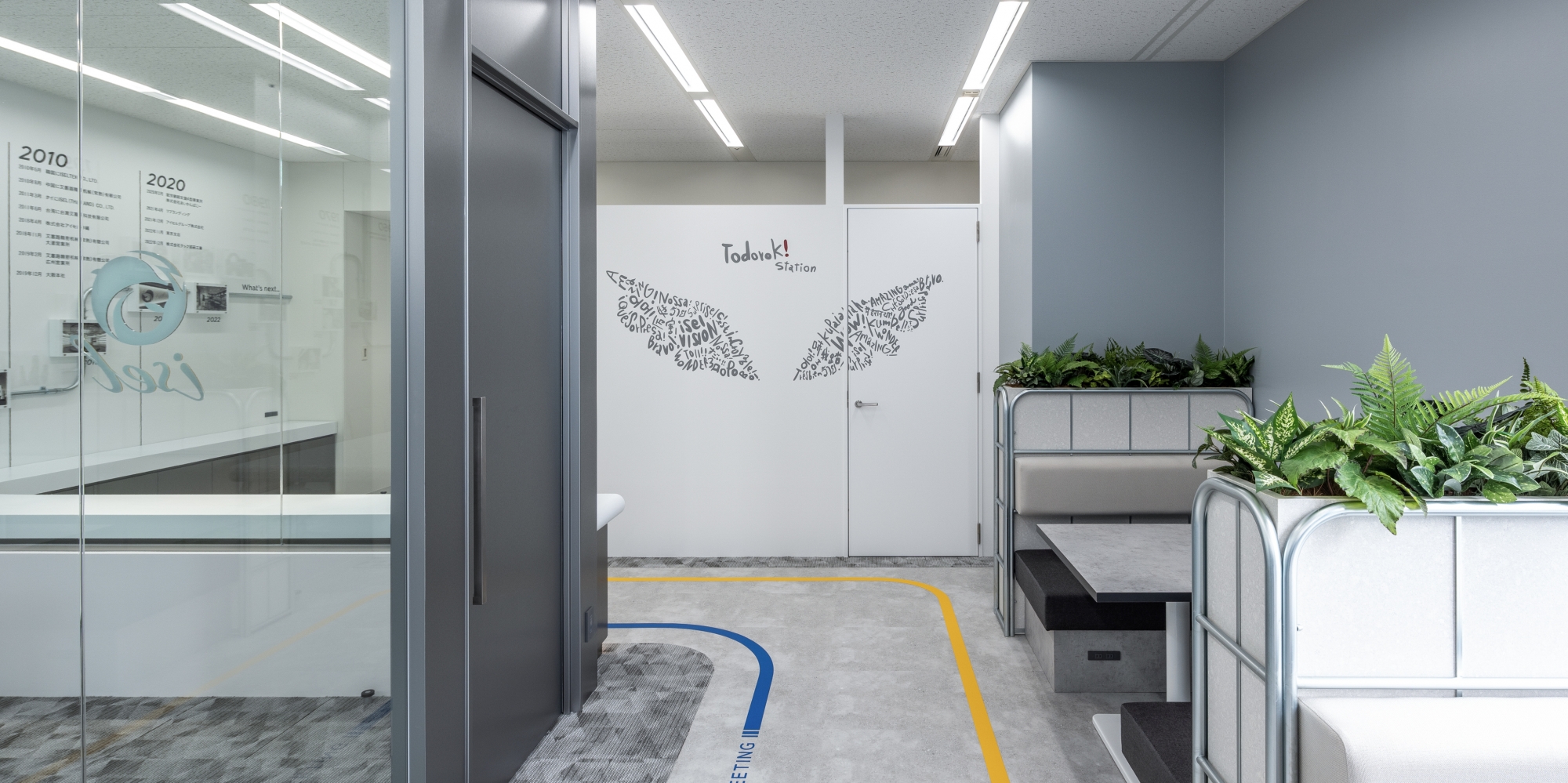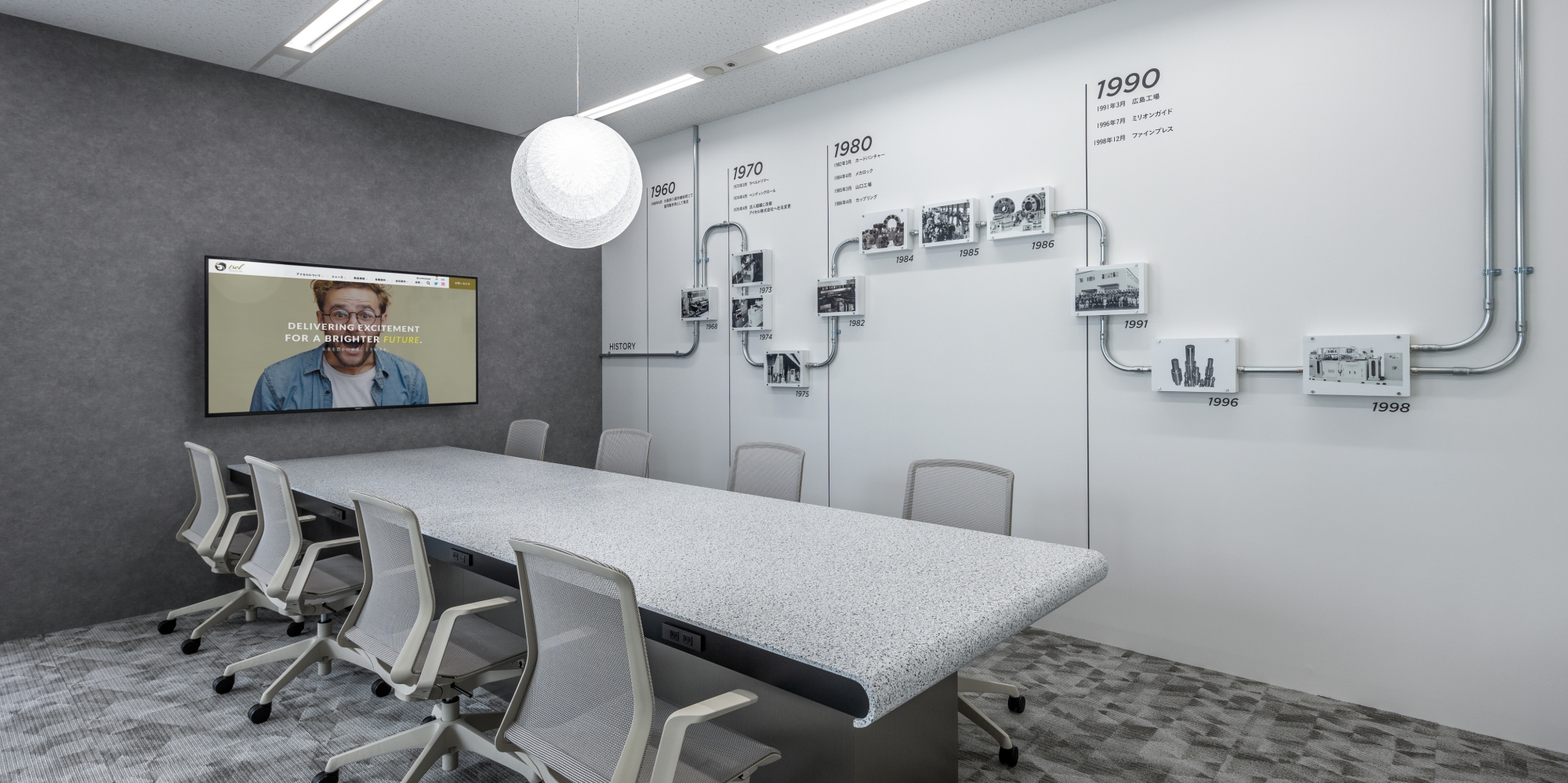 大阪オフィス、東京オフィスに続き、3拠点目となる名古屋オフィス移転プロジェクト。過去から未来へ、ルーツを大切にしながらアイデアをとどろかせる場所としてオフィスをデザインしました。エントランスは未来感と名古屋の工業感をミックスしたデザインにすることで先進的な印象をつくっています。会議室のテーブルやエントランスの棚はベルトコンベアーを意識したオリジナル家具で、断面の形状までこだわりました。印象的なペンダント照明とガラス壁は大阪、東京のオフィスと共通しており、拠点ごとにデザインテーマは違うものの細部で統一感を出しました。ワークスペースの壁面はオフィスのある名古屋の熱田神社をイメージして地層と石垣を施し、過去と未来のニ面性のあるワークプレイスになりました。