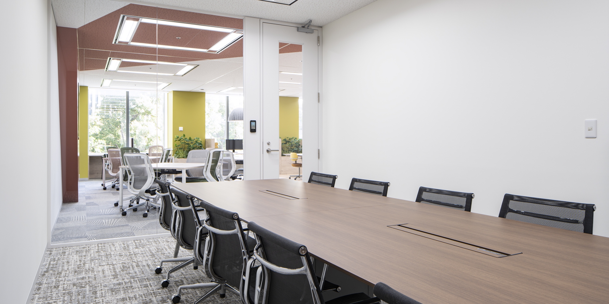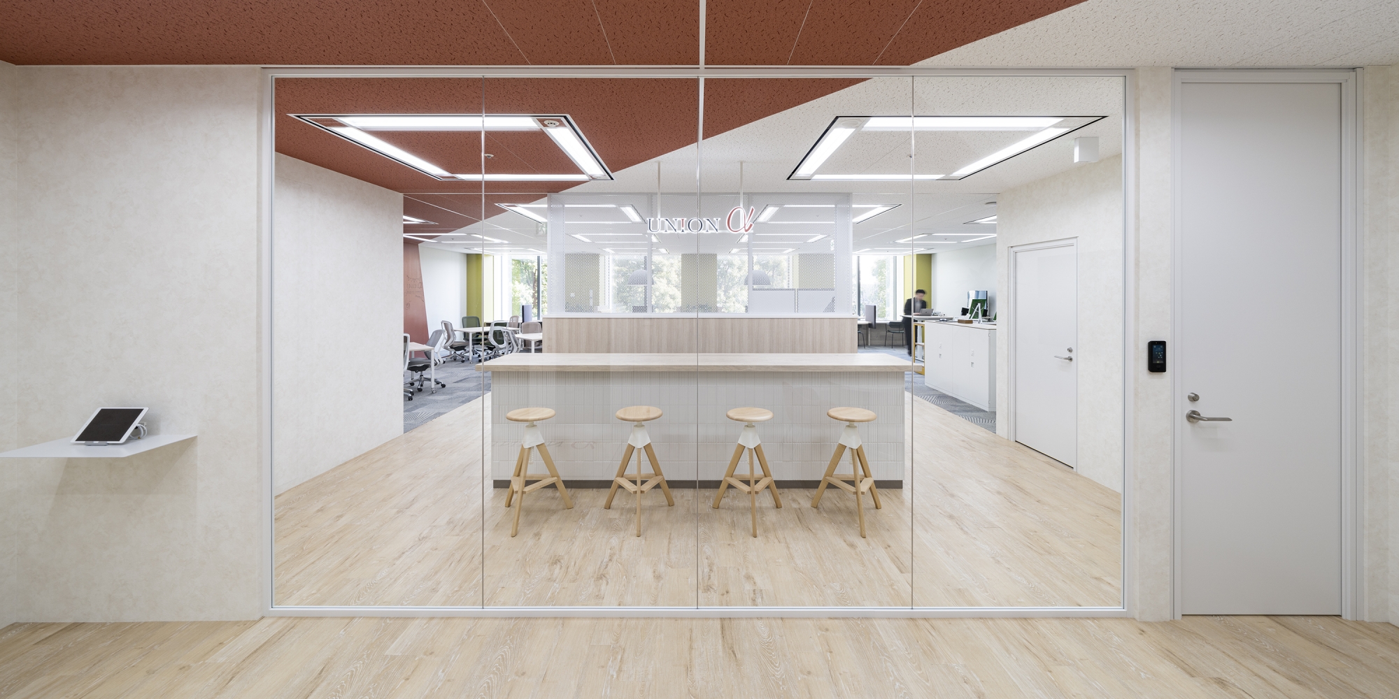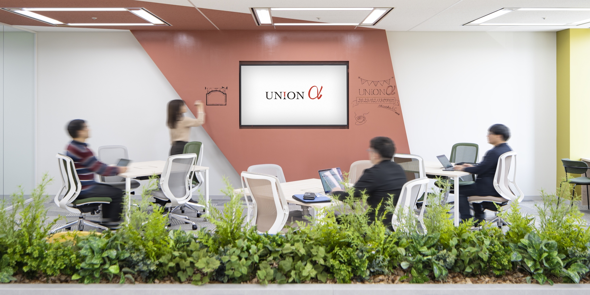 採用強化のために求職者が行きたくなるオフィスをデザインしたいということで、オフィス移転をお手伝いしました。ユニオンアルファ様の「祈りの経営」を体現した、社員一人ひとりが人間的成長を遂げられる環境づくりを目指して「プラスアルファ」をコンセプトにデザインしました。ワークスペースでは、移転前までの固定席での運用から初のフリーアドレスを導入。間仕切りを最小限にすることで空間を広く見せ、壁面モニター側のワークエリアを広く取り大人数での会議にも使用できるなど多用途な使い方ができるようレイアウトしています。また、コーポレートカラーを中心にカラフルな色味を取り入れ、クリエイティビティあふれるオフィスをデザインしました。エントランスとワークスペースを仕切る壁にはガラスを採用し、社内の風通しのよさを開放感で表現することで、ユニオンアルファ様のカルチャーを感じられる空間に仕上げています。