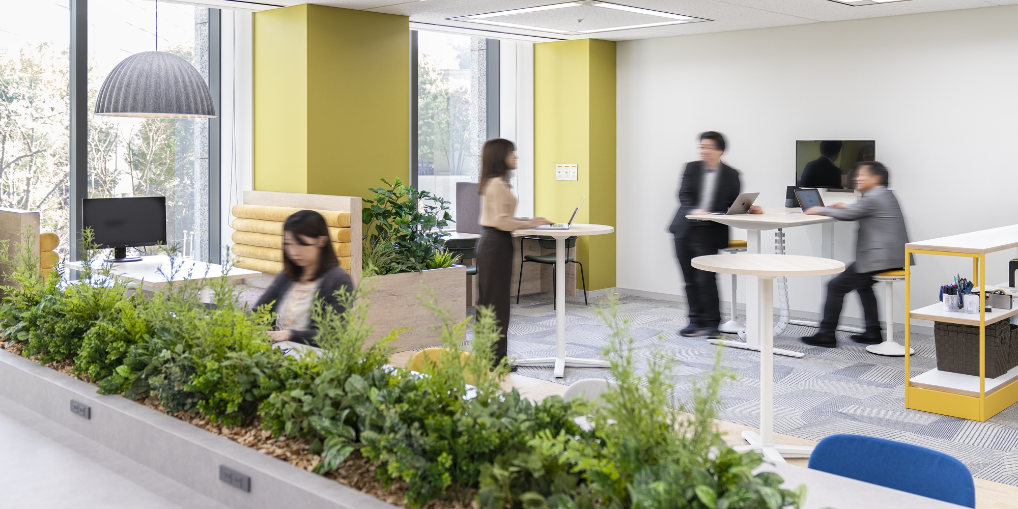 初のフリーアドレス導入をベースに、人材や組織の可能性を表現した開放的なオフィス