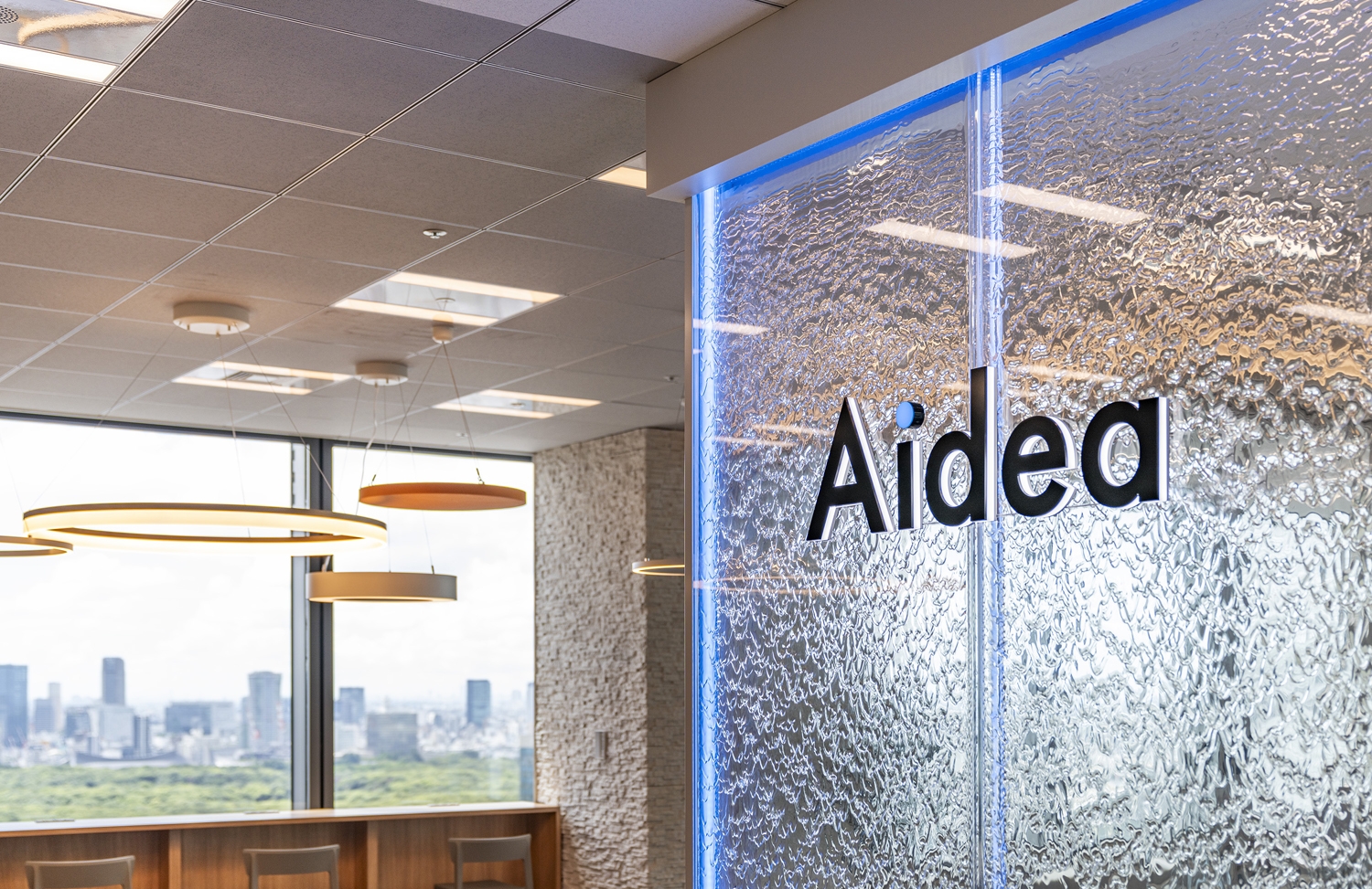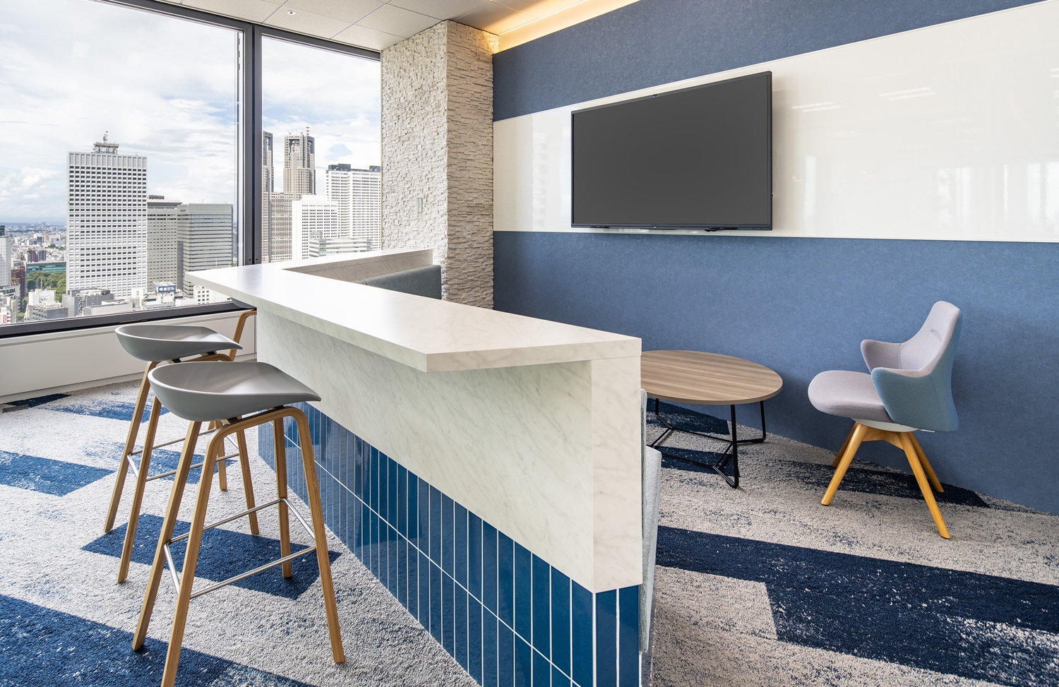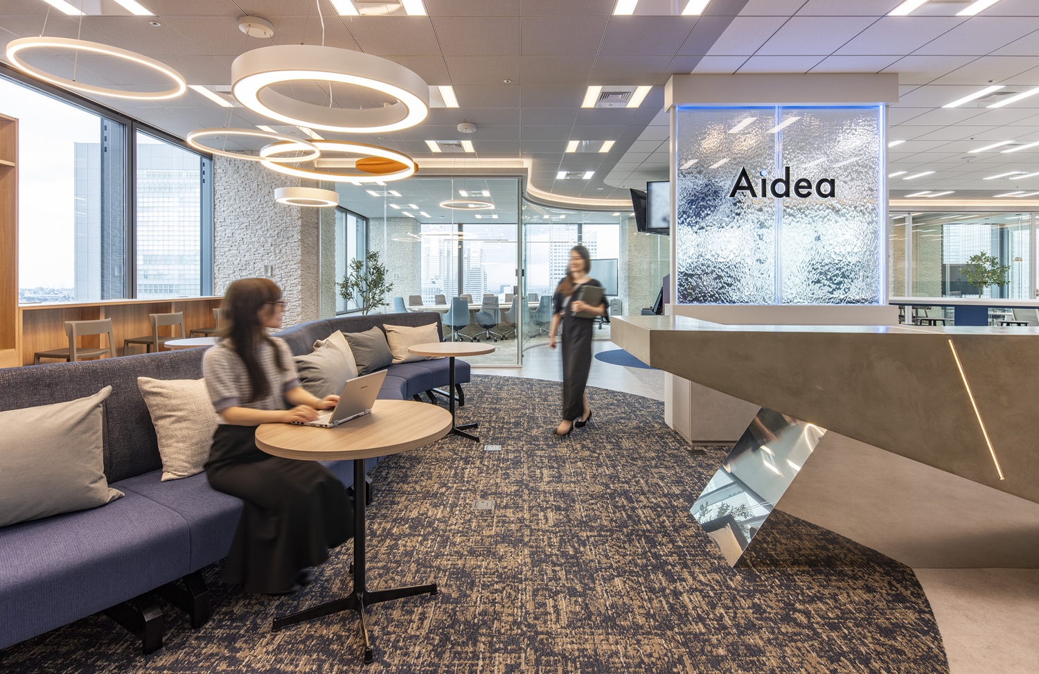 コンセプト「魅せるオフィス」のもと、アイディア様の事業である海事産業プラットフォーム「Aisea(アイシア)」をイメージできるよう、全体に海や船をイメージしたカラーやマテリアルを取り入れました。エントランスから広がるオープンで開放的な空間は来客エリアとし、フロアの眺望を活かすため壁はガラスを採用して抜け感を出しました。会議室への動線は波をイメージし流れるように緩やかな曲線を描き、各部屋ごとのコンセプトに合わせてデザインしています。メインになる大会議室は船をイメージしたオリジナル家具を制作するなど、それぞれがオリジナリティあふれる空間となりました。カフェエリアは、ゆとりと驚きをもたせながらもリラックスして話せる仕様にており、イベントの開催も可能です。多様なコミュニケーションが取れるオフィスとなりました。