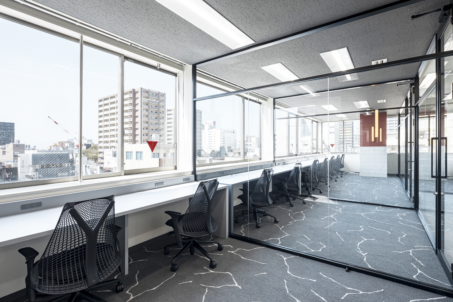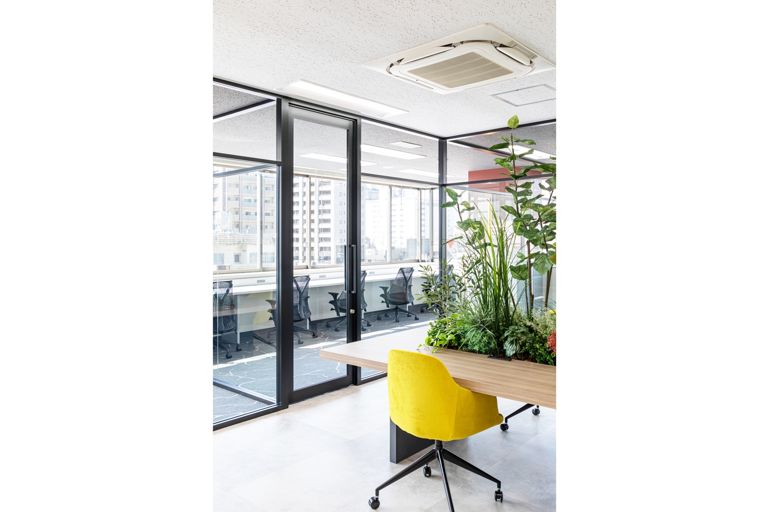 金融機関の新規事業立ち上げに伴う、インキュベーション施設としてのコワーキングスペース開設。学生、スタートアップ企業、行員など様々な分野の人や知恵が集う場所を目指し構築しました。コワーキングスペースの壁にはガラスを採用し、開放的で明るいイメージに。段差を利用して緩やかに区切ることで広々とした空間を演出しています。金融業のイメージから脱却したシンプルでスタイリッシュなデザインを意識しました。この施設から多くのベンチャー企業が育ち、地域・社会に貢献するよう想いを込めました。