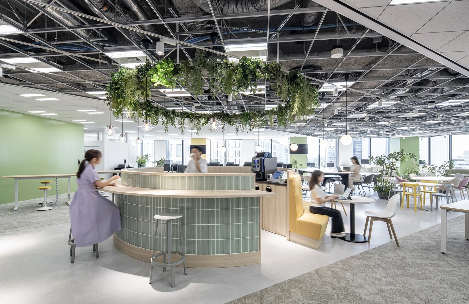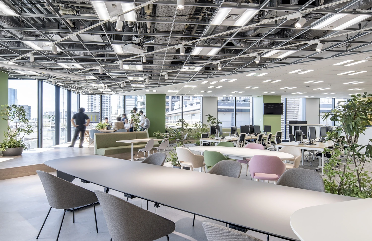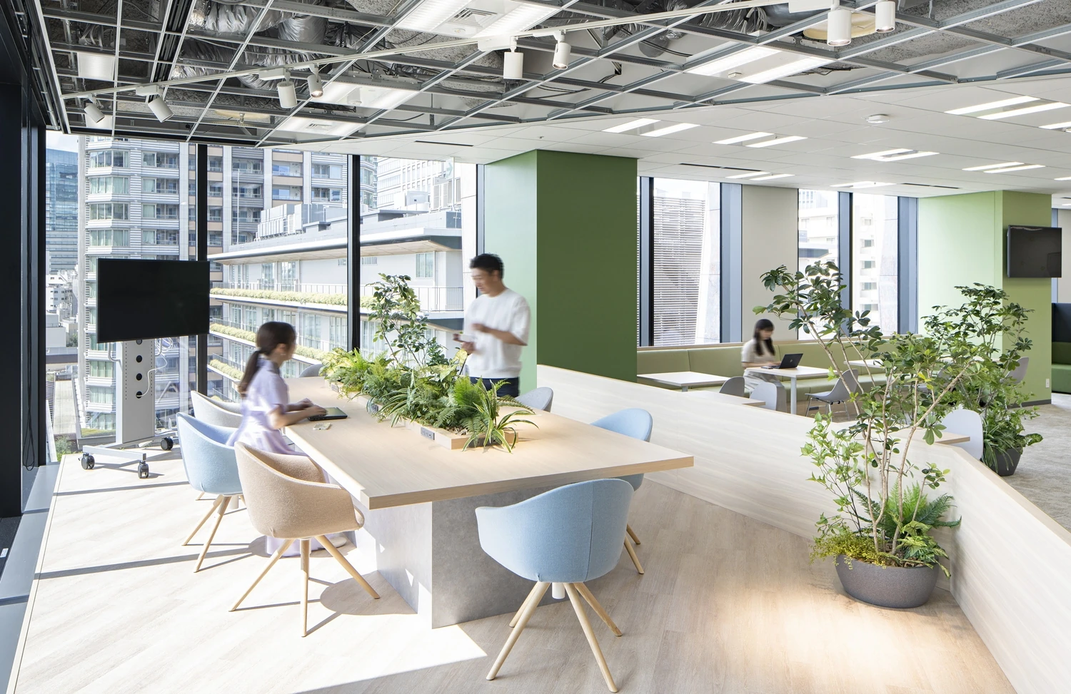 コンセプトを『Re-Café terrace』とし、「朝の爽やかなカフェ」をイメージして自然の要素とカフェ空間が馴染む空間づくりをしました。コーポレートカラーのグリーンを取り入れて企業らしさを表現し、スケルトン天井を採用して景観を意識した開放的なデザインにしています。レイアウトは、人が集まりやすいオフィスの中心にオープンミーティングエリアとパントリーカウンターを設置し、その両サイドにベースとなるワークスペースを配置しました。窓際には集中スペースやWEB会議ブースを設置し、仕事に合わせてはたらく場所を選ぶことができるABWを採用しています。結果として出社率が上がり社内のコミュニケーションも増加させることができました。