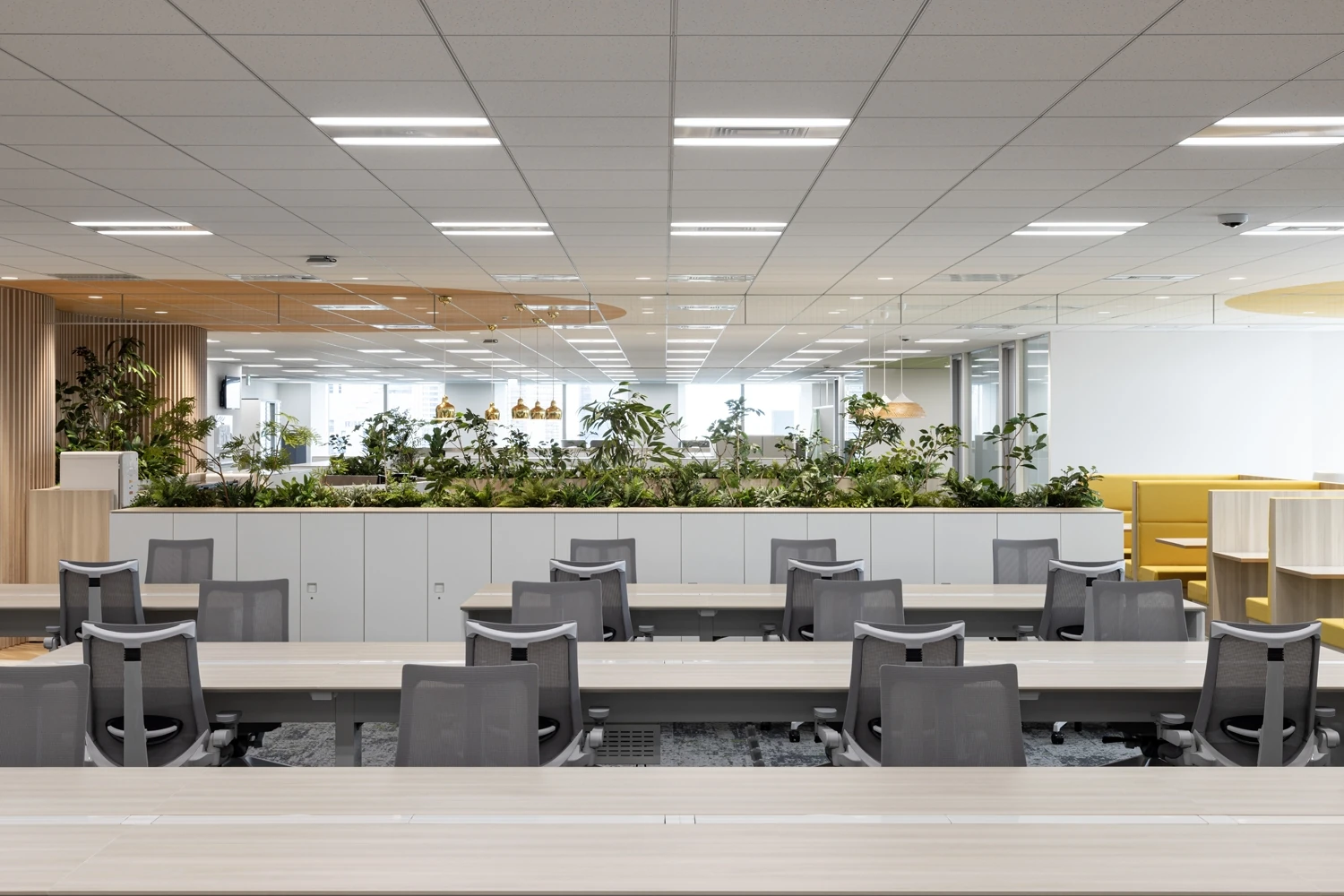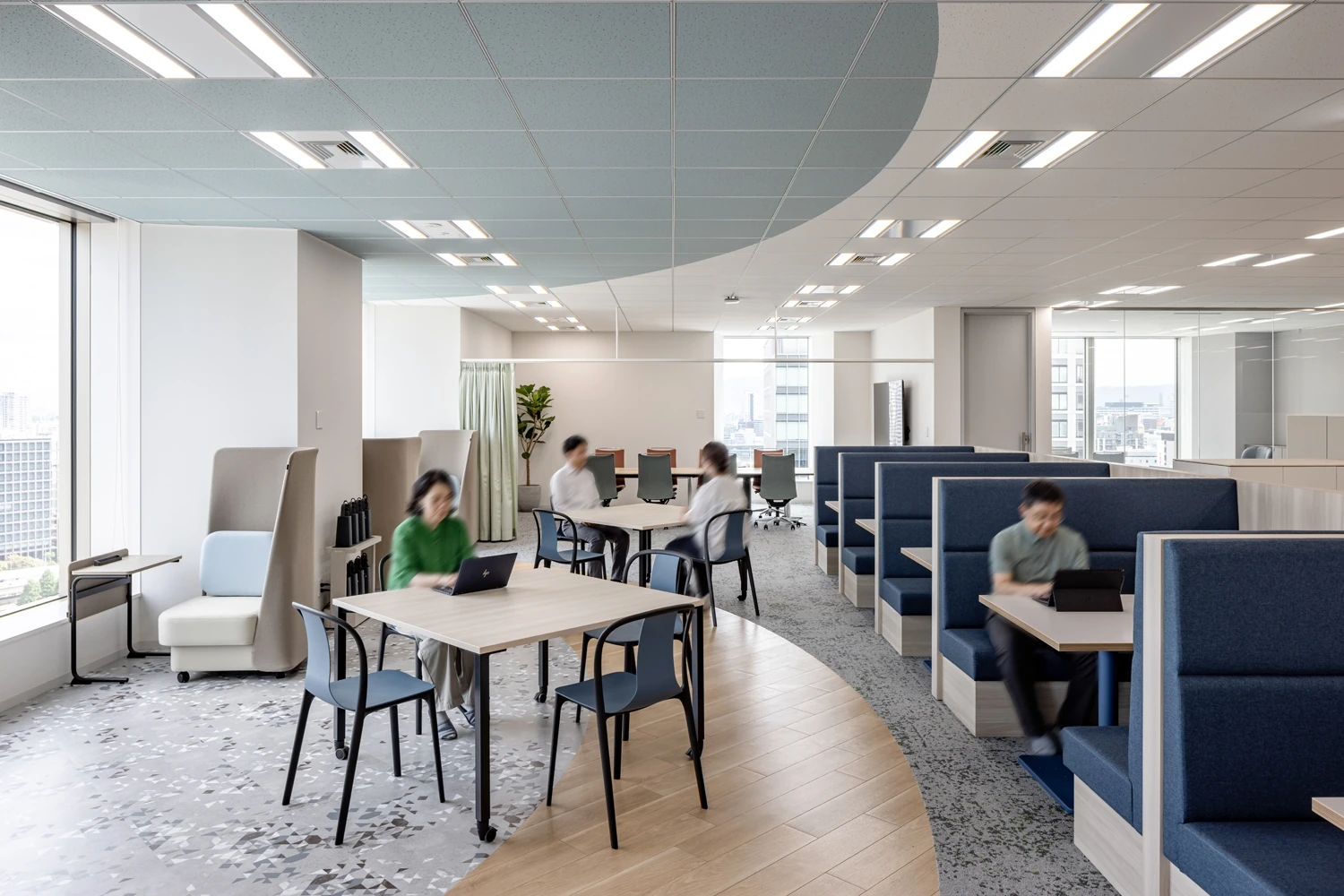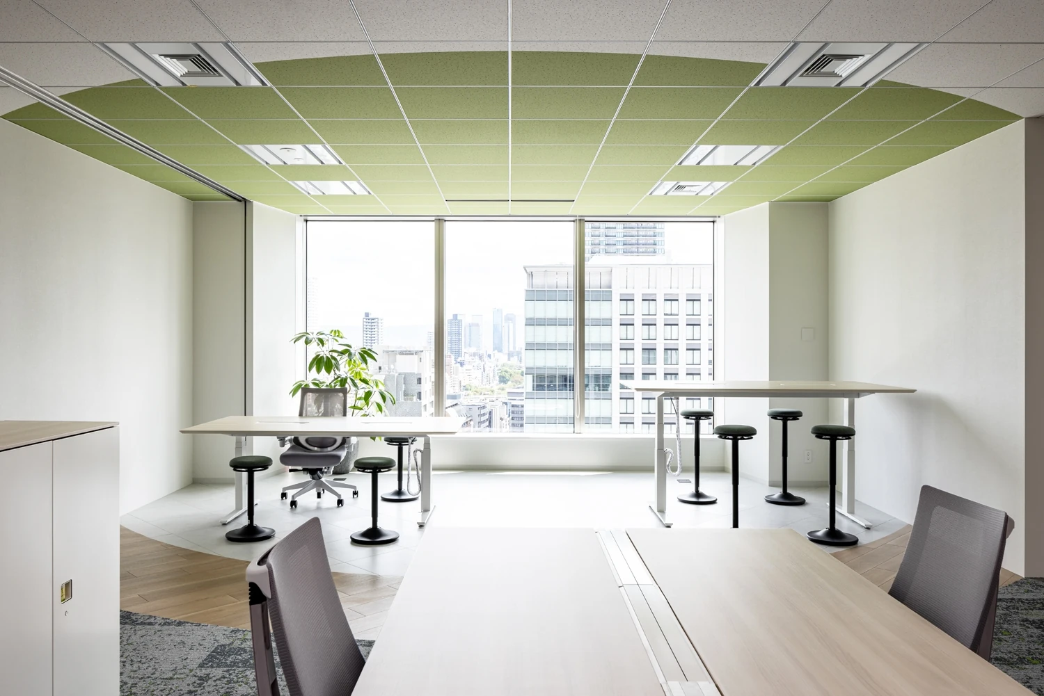 帰属意識醸成のため、コーポレートカラーであるグリーンと白を基調に温かみと信頼感を演出。さらに自社事業への誇りをもてるよう、エリアごとに果実酸をモチーフとした天井塗装を施しました。固定席をベースに眺望の良い窓側に集中スペースを多く配置しており、その日の気分や仕事内容に応じてはたらく場所を選択できます。中央にはパントリーとリフレッシュエリアを設置しており、メンバーが集まり交流がしやすいレイアウトです。