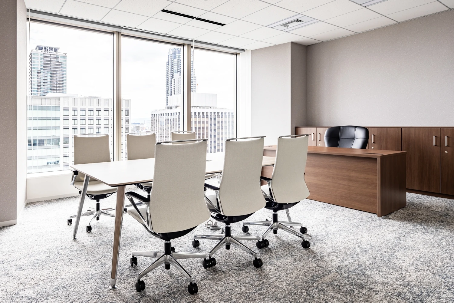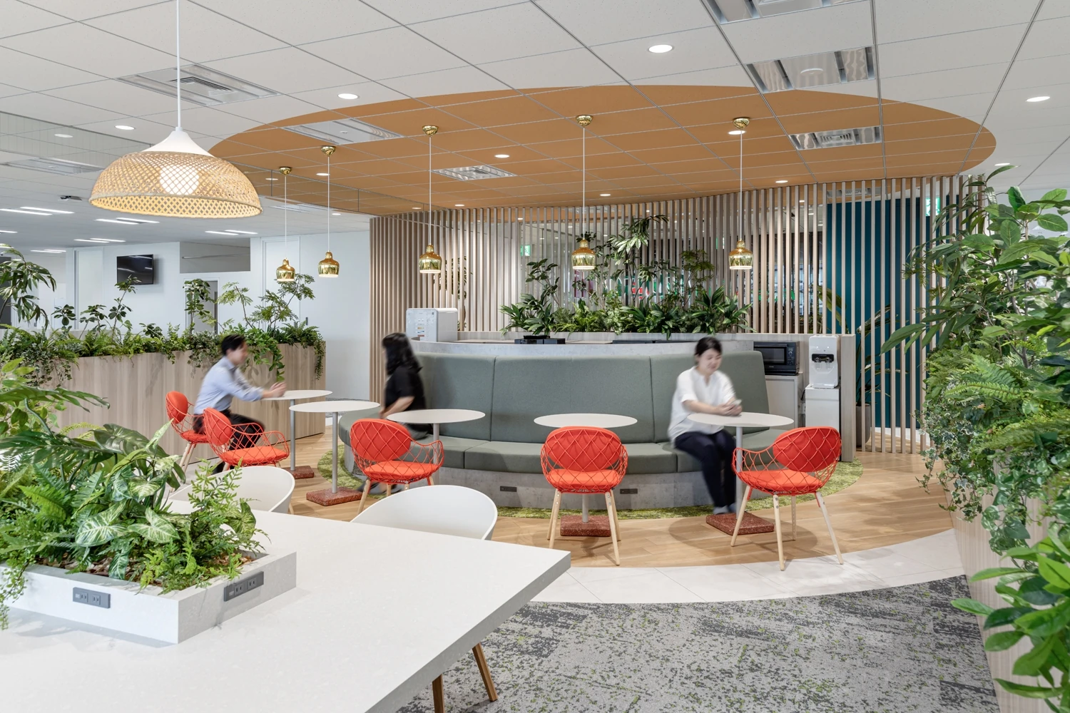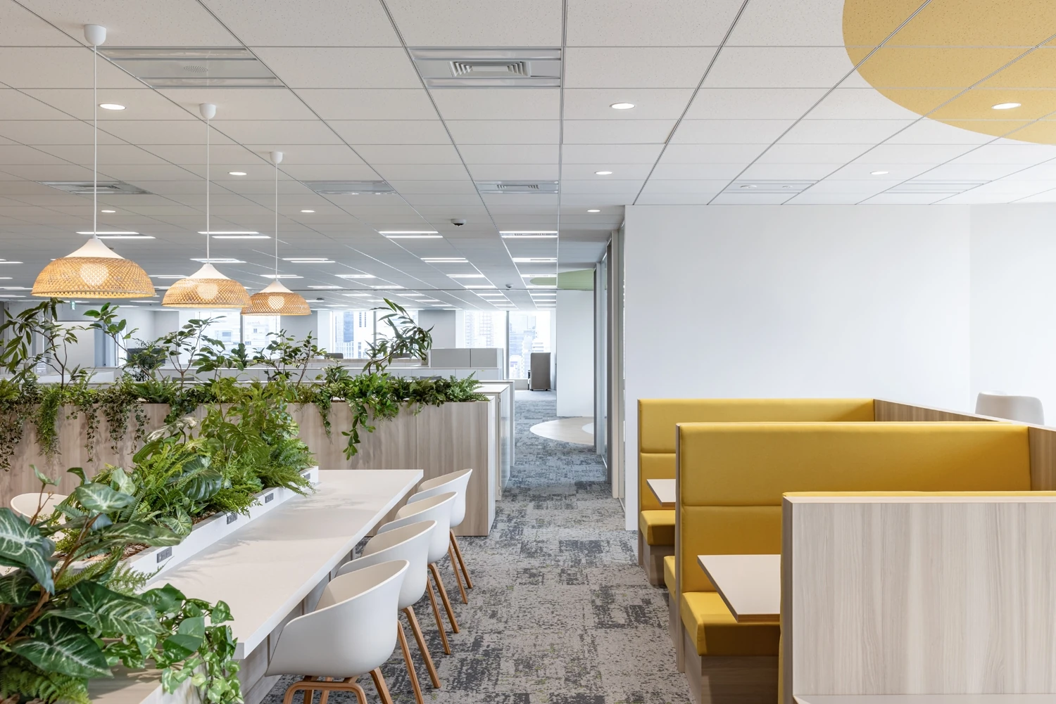 帰属意識醸成のため、コーポレートカラーであるグリーンと白を基調に温かみと信頼感を演出。さらに自社事業への誇りをもてるよう、エリアごとに果実酸をモチーフとした天井塗装を施しました。固定席をベースに眺望の良い窓側に集中スペースを多く配置しており、その日の気分や仕事内容に応じてはたらく場所を選択できます。中央にはパントリーとリフレッシュエリアを設置しており、メンバーが集まり交流がしやすいレイアウトです。
