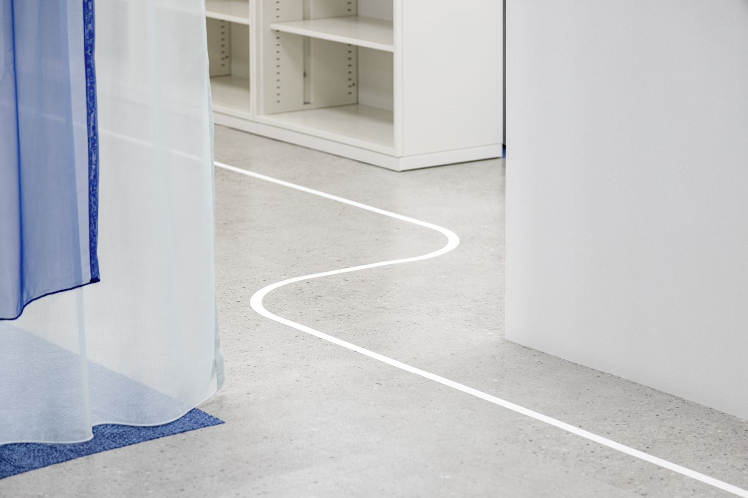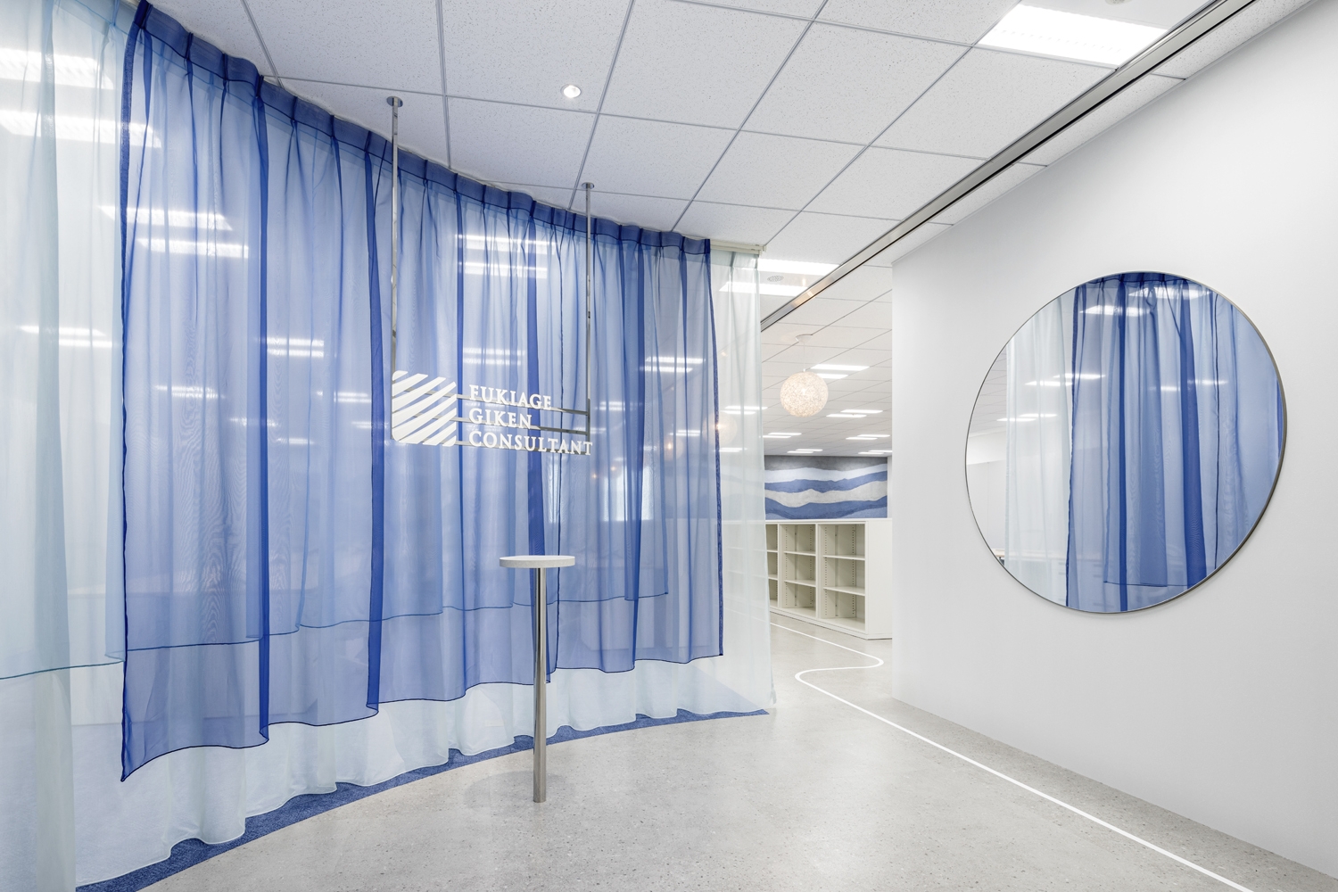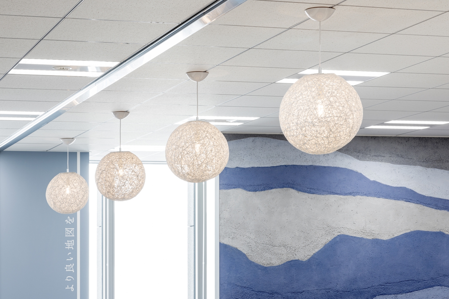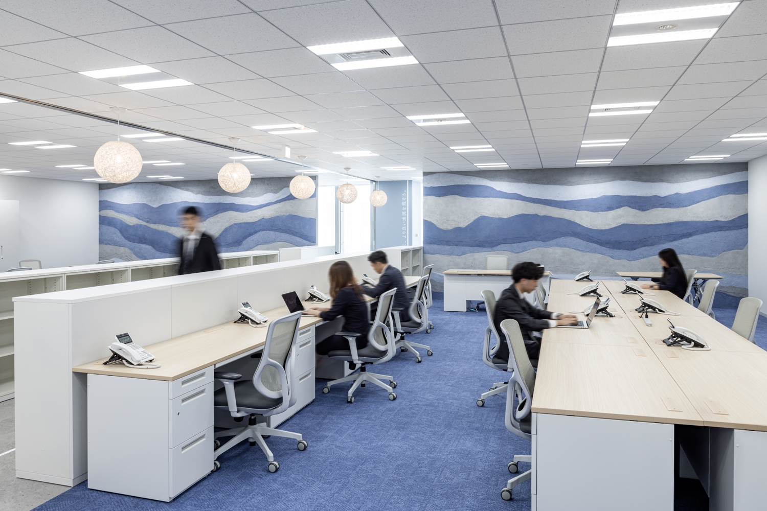 吹上技研コンサルタントという社名から、デザインは社内に新しい風が吹き上げるイメージを持たせました。エントランスのカーテンや随所に曲線を取り入れることで風の軽やかさを表現しています。執務エリアの版築塗装は事業である土木を、ペンダントライトや丸鏡は事業拠点である京都の和をさりげなく表現しました。部門ごとにはたらくエリアを分けつつも、壁はつくらず家具で間仕切ることで通路を挟んでコミュニケーションが発生しやすいレイアウトです。