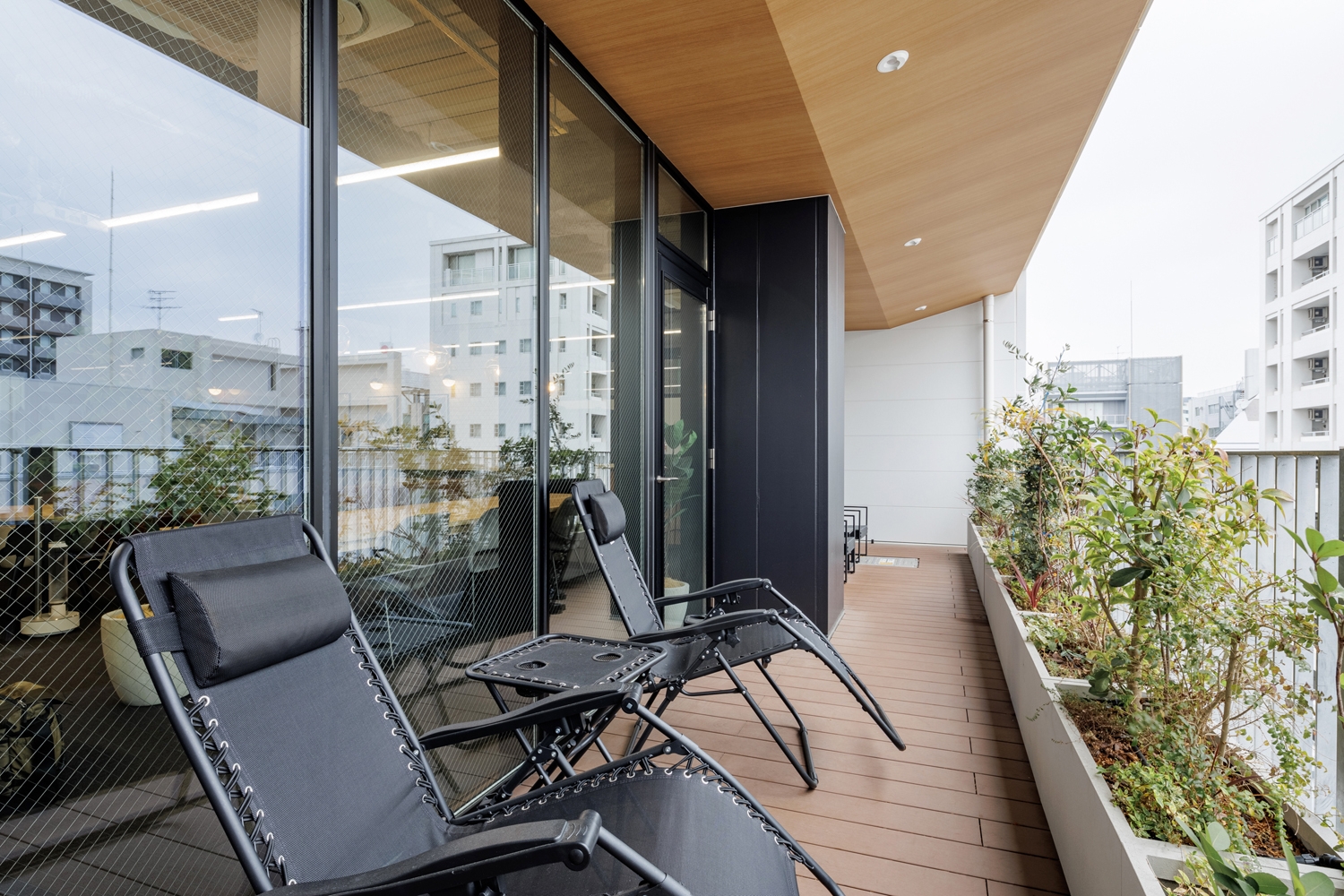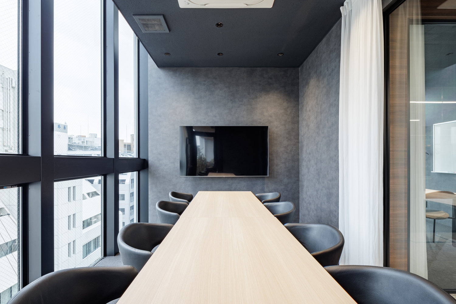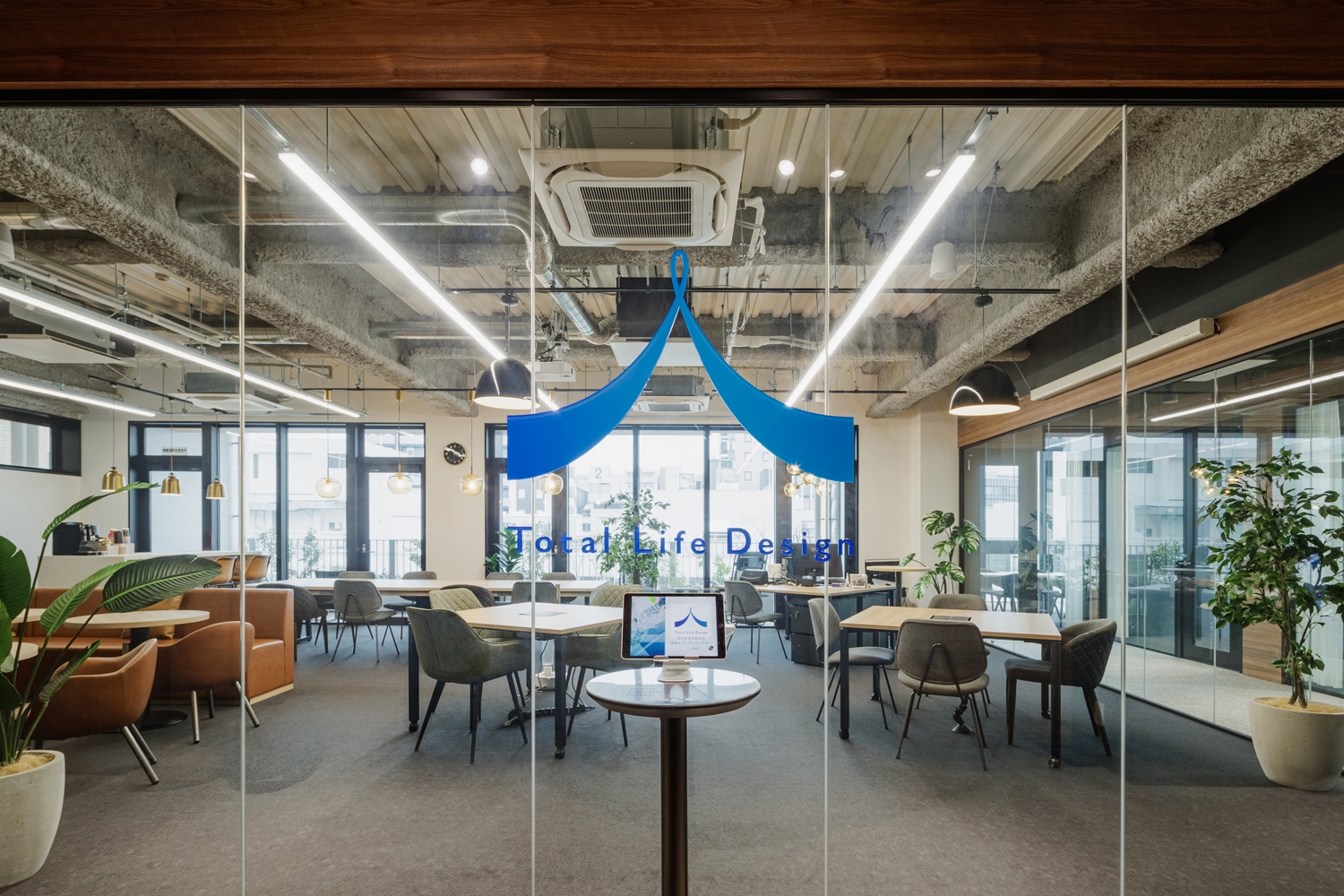 トータルライフデザイン様の他拠点とはデザインのトンマナを変更しラグジュアリーな空間を演出しています。ワークスタイルはフリーアドレス制を採用し、ビックテーブルとソファスペースを組み合わせ多様なはたらき方を促しています。福岡拠点には営業部門のメンバーが多く、外出が多いため、オフィスもカフェのような空間で効率的にはたらくことができるレイアウトを実現しました。シックで落ち着いたデザインと、既存設備のバルコニーテラスを活かした独自性を持つオフィス空間となっています。