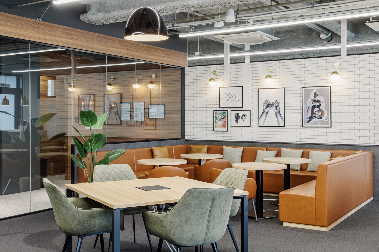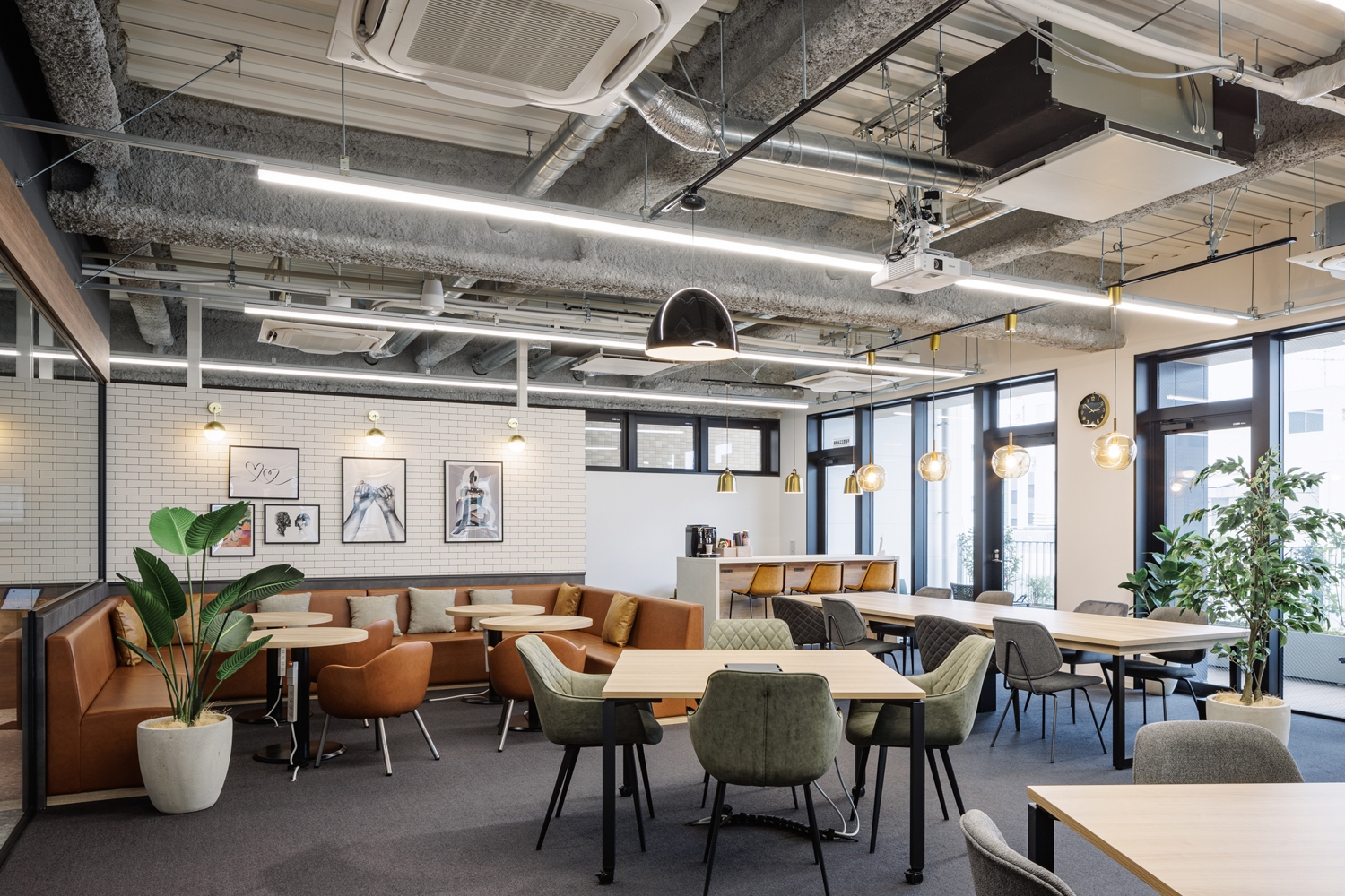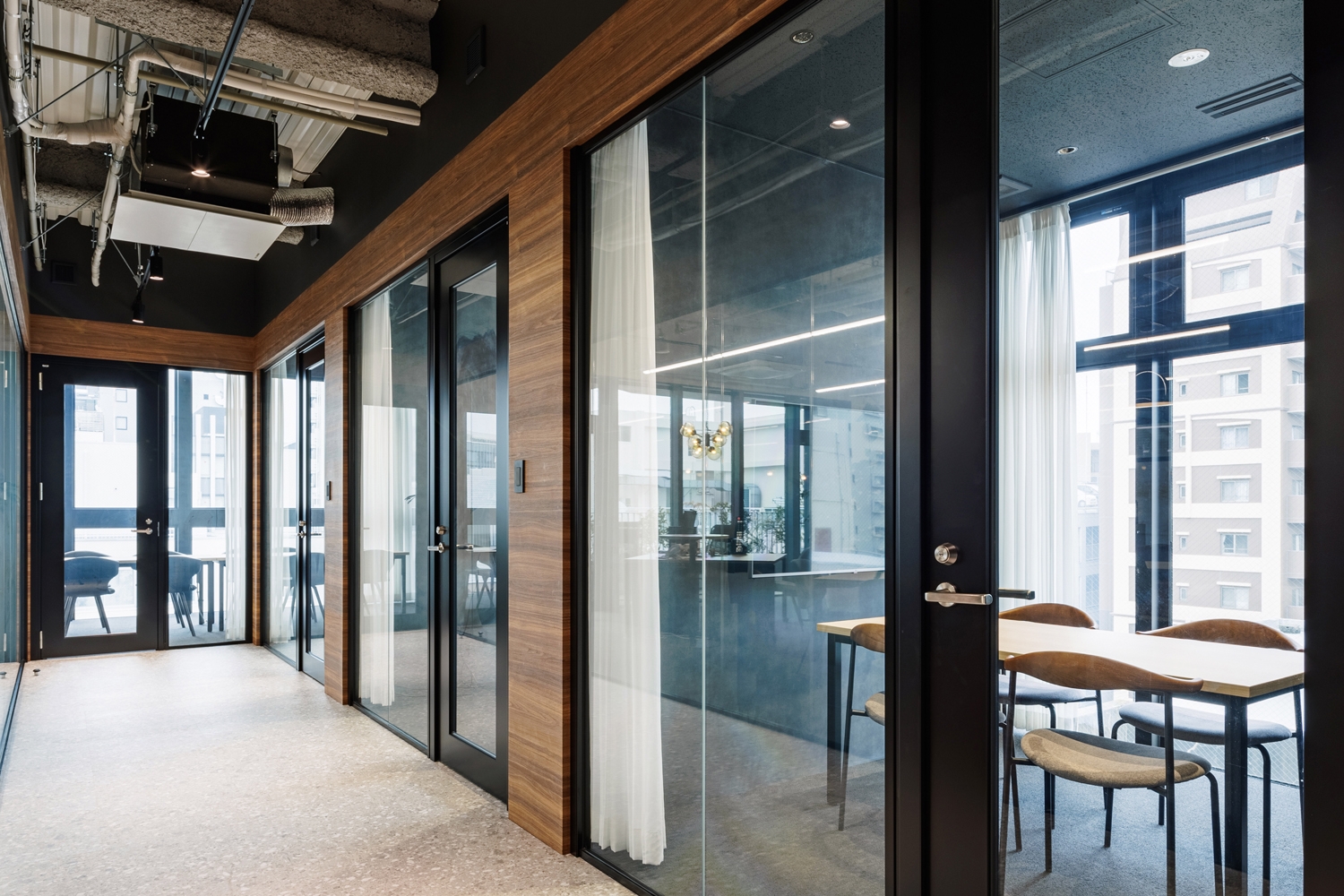 トータルライフデザイン様の他拠点とはデザインのトンマナを変更しラグジュアリーな空間を演出しています。ワークスタイルはフリーアドレス制を採用し、ビックテーブルとソファスペースを組み合わせ多様なはたらき方を促しています。福岡拠点には営業部門のメンバーが多く、外出が多いため、オフィスもカフェのような空間で効率的にはたらくことができるレイアウトを実現しました。シックで落ち着いたデザインと、既存設備のバルコニーテラスを活かした独自性を持つオフィス空間となっています。