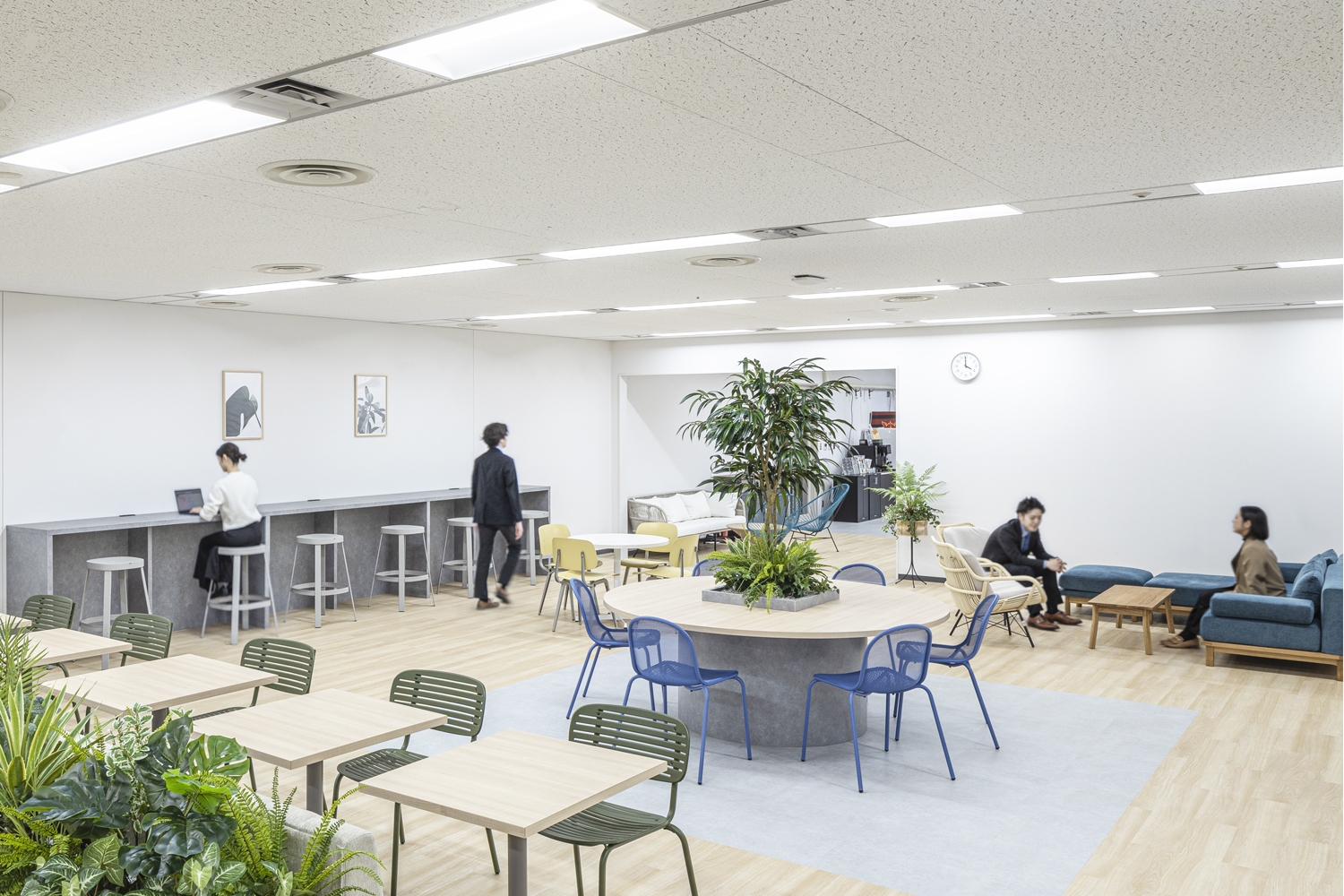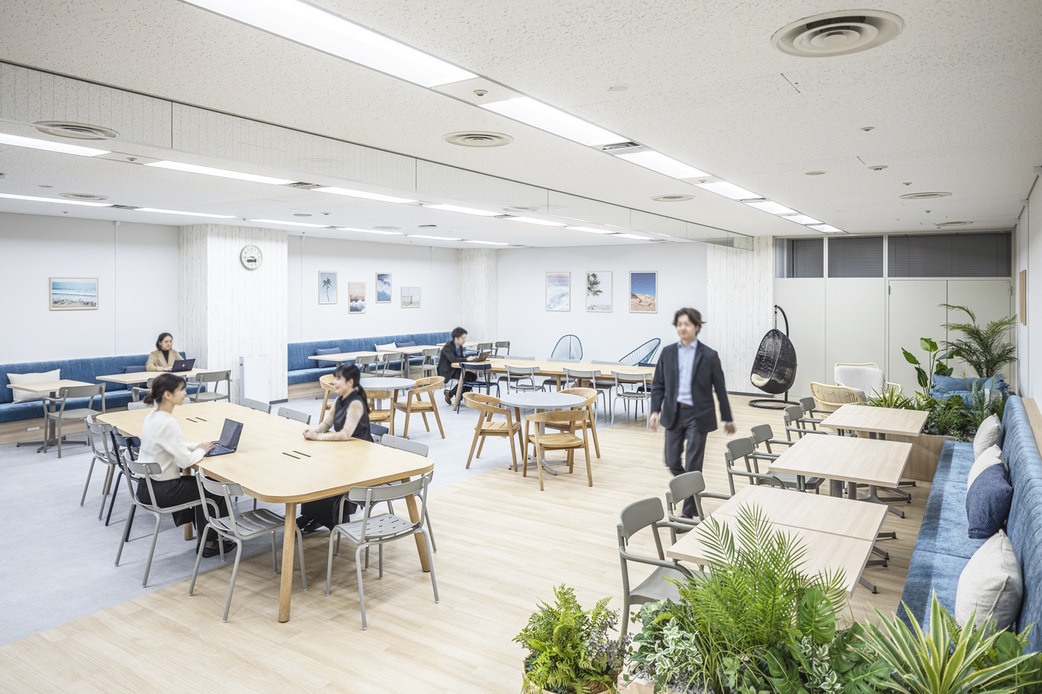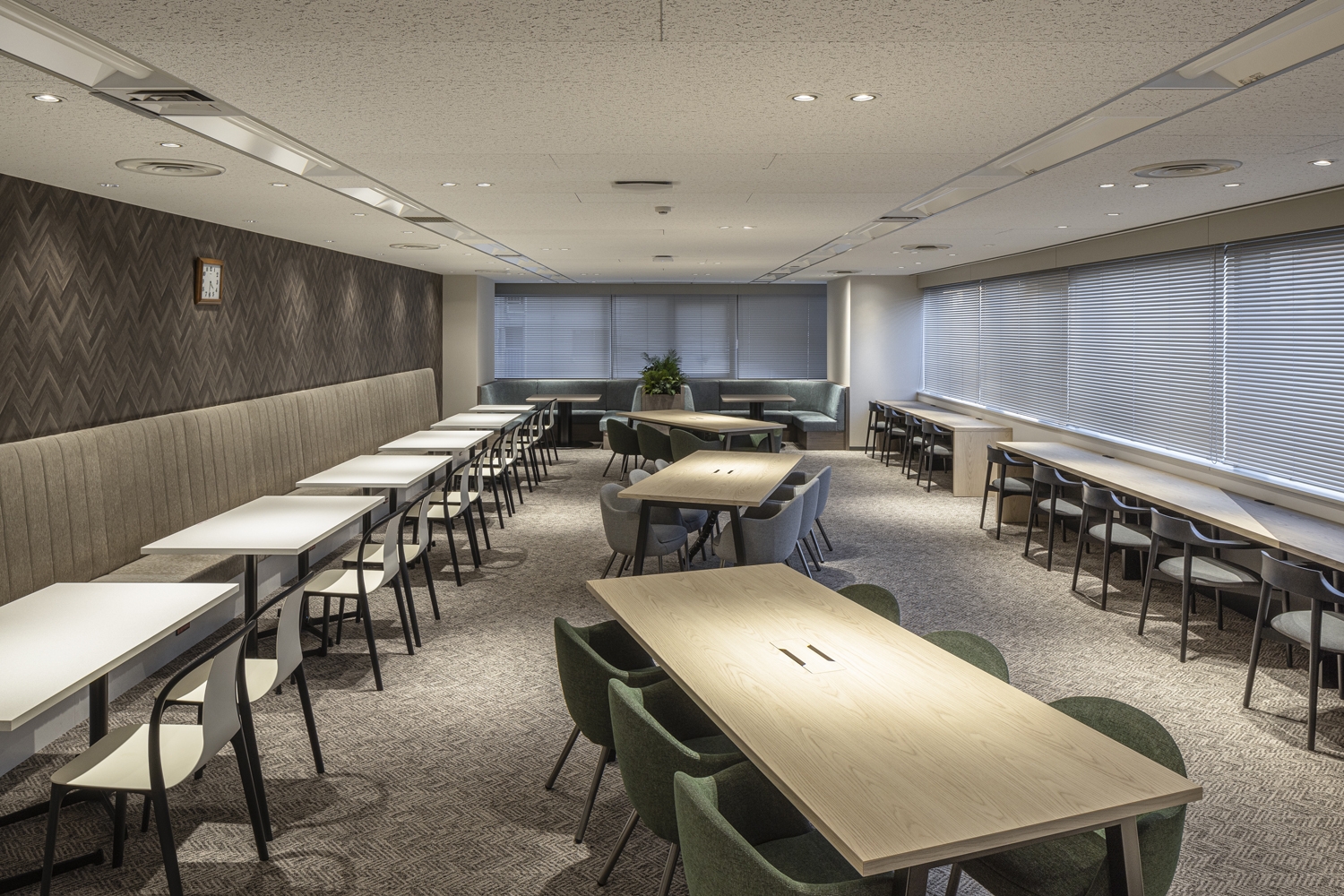 ビル1棟への入居のため、フロア単体でデザインするのではなく、各フロアの関わりやスタッキング構成から逆算してフロアの在り方を定義。入居フロアの5階を頂点として、太陽の恵み(5階:Sun)を山が受け(4階:Mountain)、山にある森が成長していき(3階:Forest)、水が川に流れていき(2階:River)、最終的に海に流れていく(B1階:Sea)。といった自然の循環を表現しています。レイアウトは、多種多様な研修スタイルが実現できるように、セミナーテーブル以外もさまざまな形状の什器を取り入れ、マルチな研修ができる空間に仕上げました。