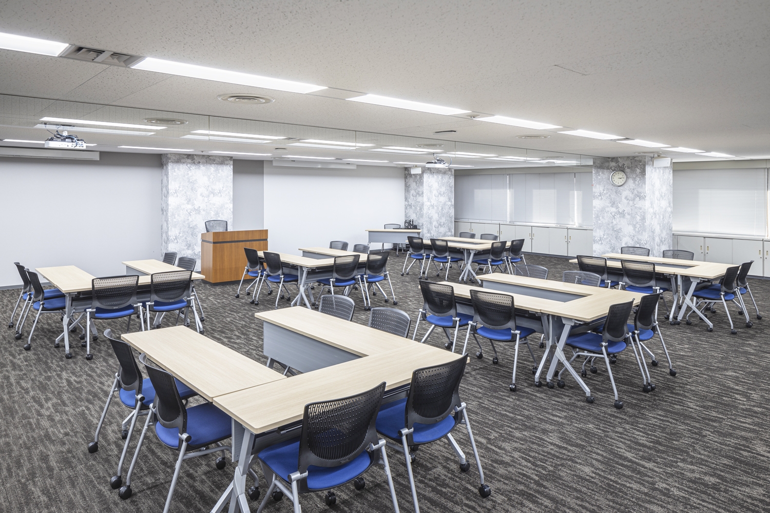 移転前の「東芝研修センター」は、大小さまざまな研修室、宿泊施設を備え、全国から多くの受講生が集まる集合研修の場を提供していました。しかし、コロナ禍により、研修形態がオンラインメインに移行したことを受け、時代に即した研修施設の再構築が必須でした。新たな拠点では、ニューノーマルの時代を見据え、オンラインはもちろん、敢えて人がリアルに集まって学ぶ意義を考え、知識やスキルのインプットだけでなく、様々な人との交流や発信(アウトプット)、共創の場として活用できる場も兼ね備えたハイブリッドな研修施設の構築を目指しました