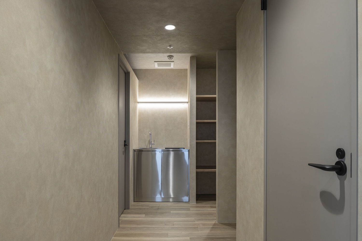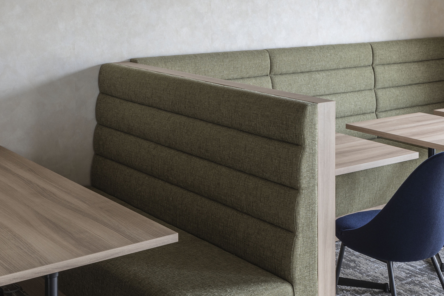 「Secret Base」をコンセプトに据えた本プロジェクト。従来のオフィスフロアとは異なるアプローチもプラスに捉え、ラグジュアリーかつ「大人の隠れ家」の雰囲気を創出しました。専有部では、窓外への視線が抜ける配置と、空間を広く見せるガラス会議室を採用。共用部では、落ち着いた色合いの壁や床、間接照明を施したEVホールで、ホテルのような落ち着きある空間を演出しました。また、会議室やWEBブースなどの打ち合わせスペースに加え、カフェカウンターやファミレスブース、ベンチソファーなどを設けることで、内覧時にお客様がワクワクしながらはたらくイメージを持てるような空間を実現しています。