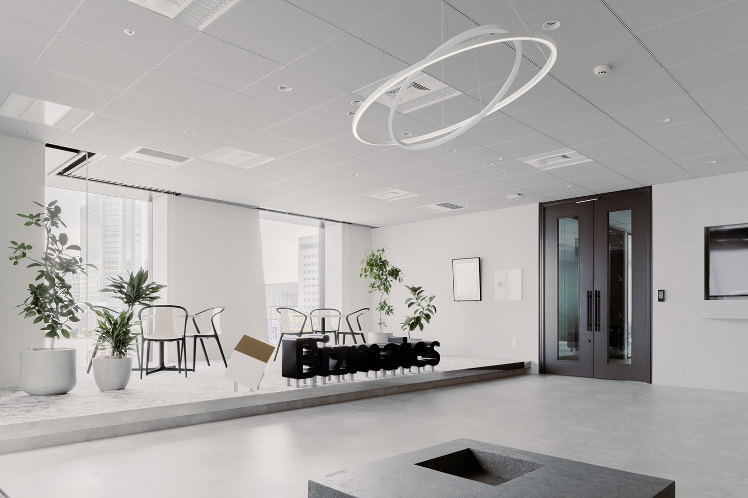 会社としての一体感や企業らしさについて課題を抱えていたビズメイツ様に対し、根幹であるミッションによって社員同士がつながり、ミッションを中心に内側からにじみでるように、より広く「ビズメイツ」が知られていく、そんな少し先の未来を実現するためのオフィスを提案。今回入居する2フロアそれぞれに、「成長し続ける」「建設的に対話する」「新しい価値を生み出す」といったビズメイツ様が大切にされている3つのバリューを体現しました。 メインエントランスを構える11階には、ペアガラスで防音対策を施した会議室を配置。会議室の他にも社内・社外イベントが開催できる広々としたラウンジや、YouTube撮影などができる撮影スタジオも備えています。会議室とコミュニケーションスペースを同じフロアにつくることで、社員同士の偶発的な交流と情報共有の機会の増加を図りました。12階はメインのワークスペースとして、将来的な増員にも対応できるようにフロアを構成。壁をつくらずオープンなスペースとすることで、隣り合う部署同士で情報共有を円滑にし、事業間シナジーの創出を目指すとともに、企業文化や価値観の浸透、組織全体の一体感の醸成を目指しています。