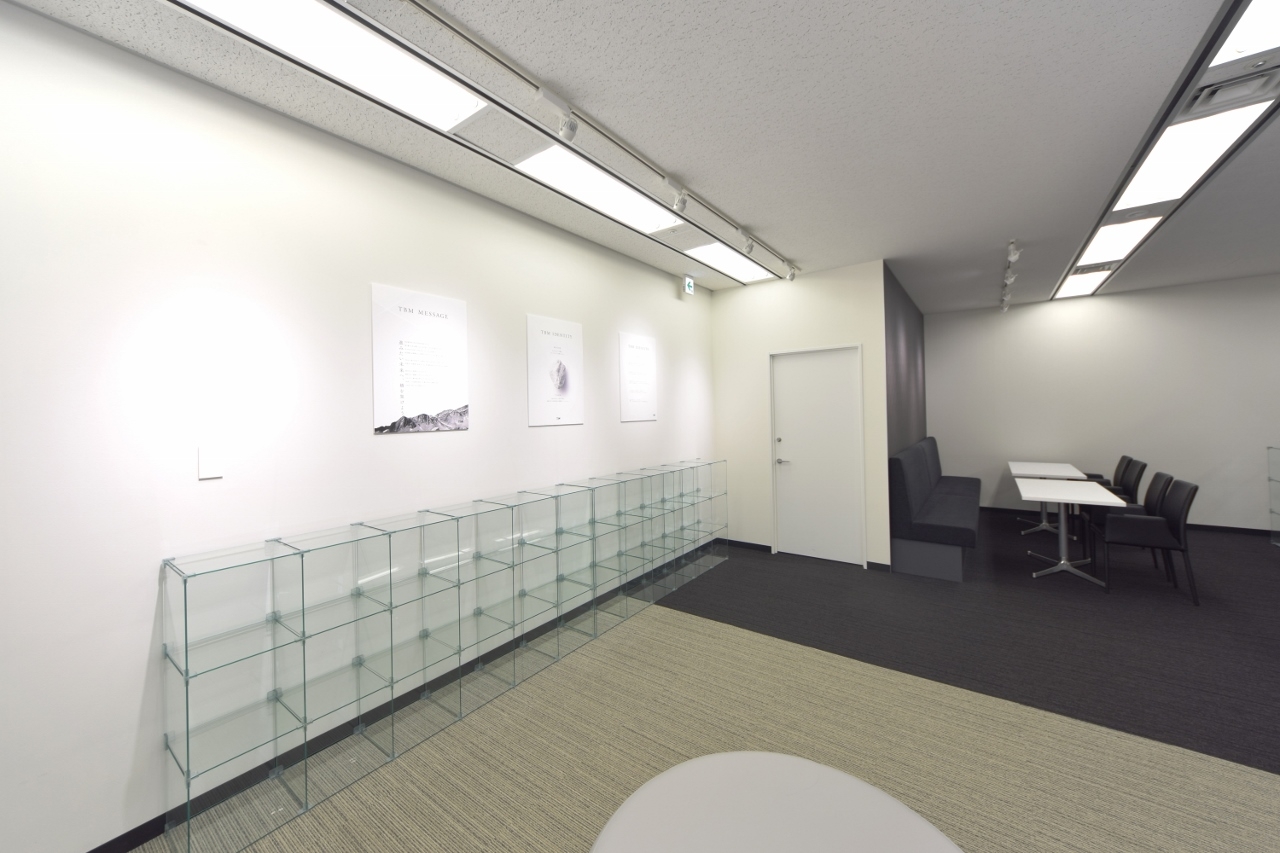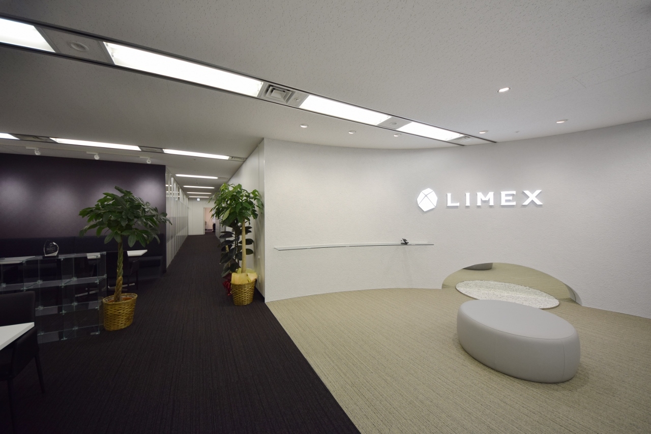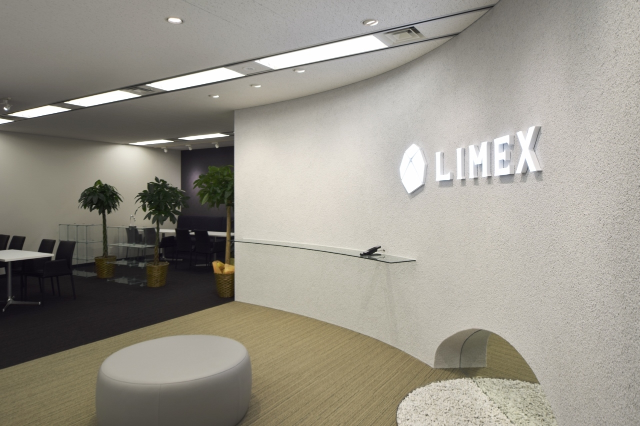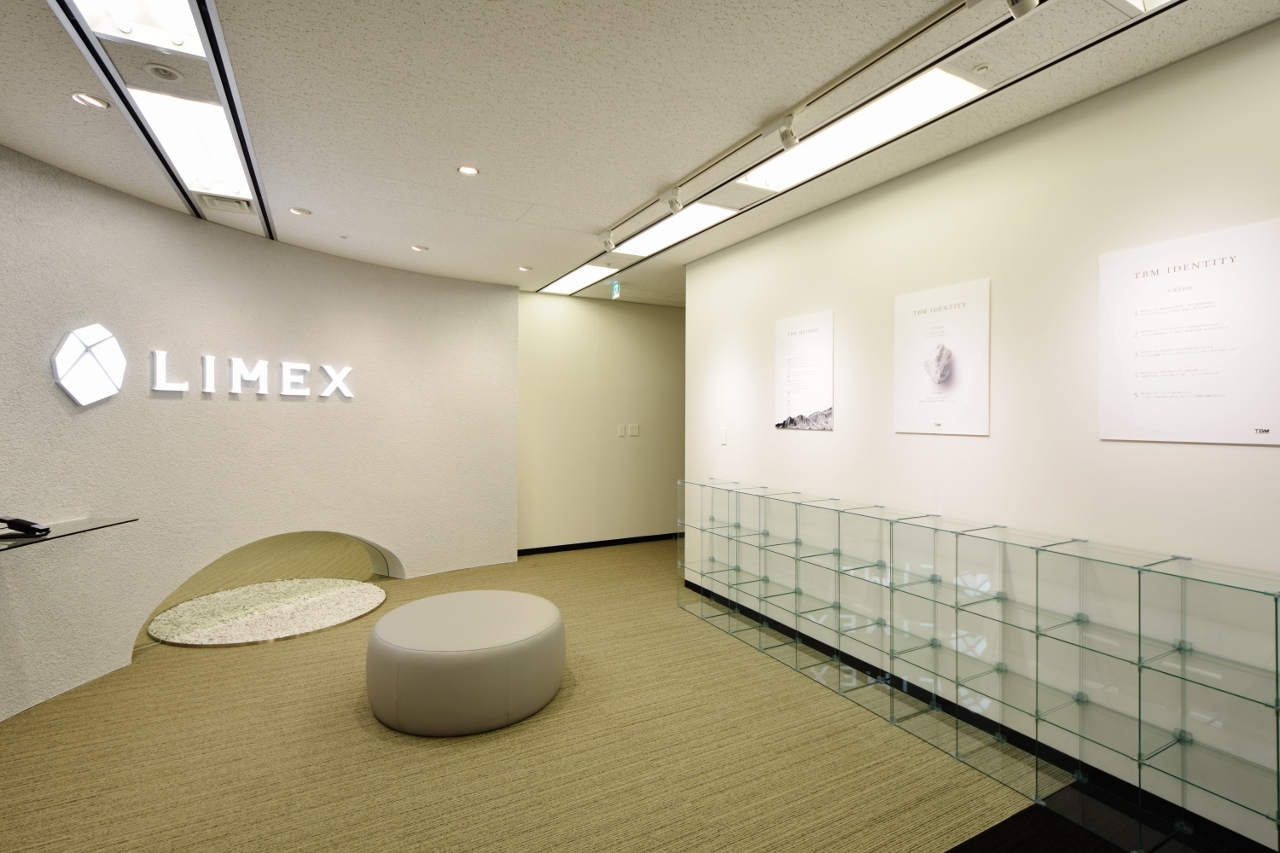 会社の主力ブランド「LIMEX」に使われている石灰石。その石灰石の採石場のような、石のもつ力強さを最大限に表現することをテーマにオフィスデザインを行いました。 エントランス壁面は左官仕上げにより石のようなごゴツゴツとした力強い印象を与えるとともに、緩やかな曲線形状とすることで、来客者を中へと引きこみます。 また、壁面下部には石を繰り抜いたような穴を開け奥行きを見せることで、石の厚みを表現しました。 穴の空いた部分には「LIMEX」で実際に使用している石灰石を敷き詰めています。 この力強い壁面のインパクトに負けないように、サインは大きなサイズのものを取り付け、ブランドの力強さを表現しました。