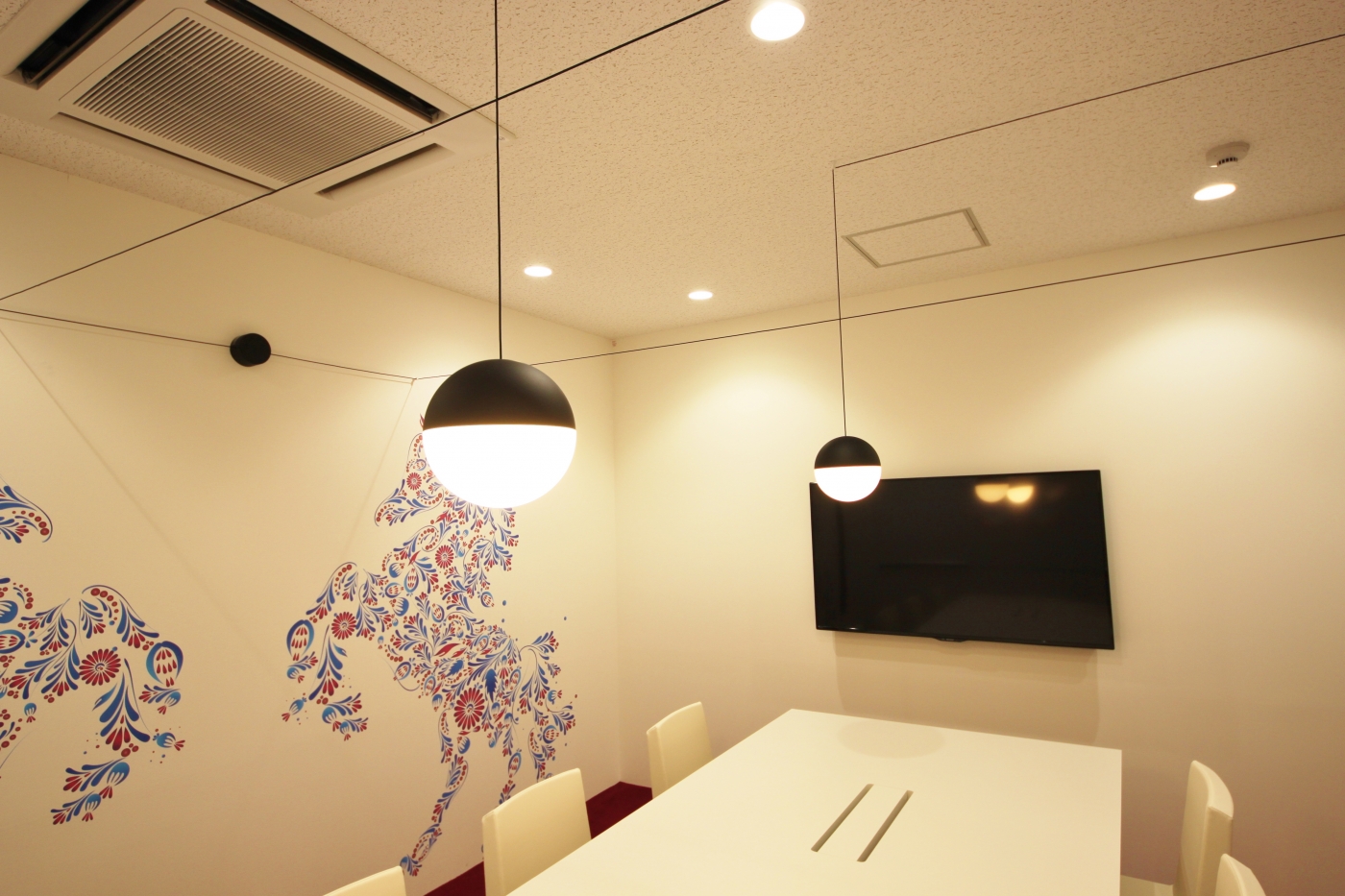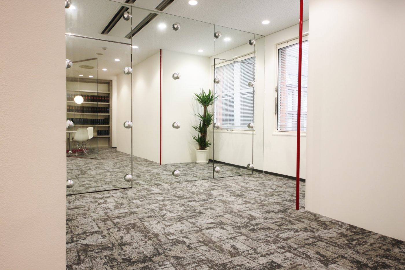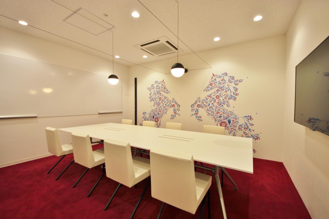 初めてオフィスに来られたお客様が、わっと驚き不思議な感覚になるオフィスをデザインしました。 エントランスは大きなガラスとダイナミックな壁面本棚が印象的。また、会議室に繋がる壁面や扉には全て、鏡を使用しており、空間の広がりを感じるとともに会議室への進み方に迷ってしまうようなトリックアートな空間を設計しています。 会議室には一面に馬のデザインのグラフィックを施し、さらには壁からポールを取り出しコートハンガーに変身する仕掛けもご用意。エントランスに入ったときのインパクトだけでなく、奥に進むたび沢山のサプライズが隠された不思議な空間となりました。