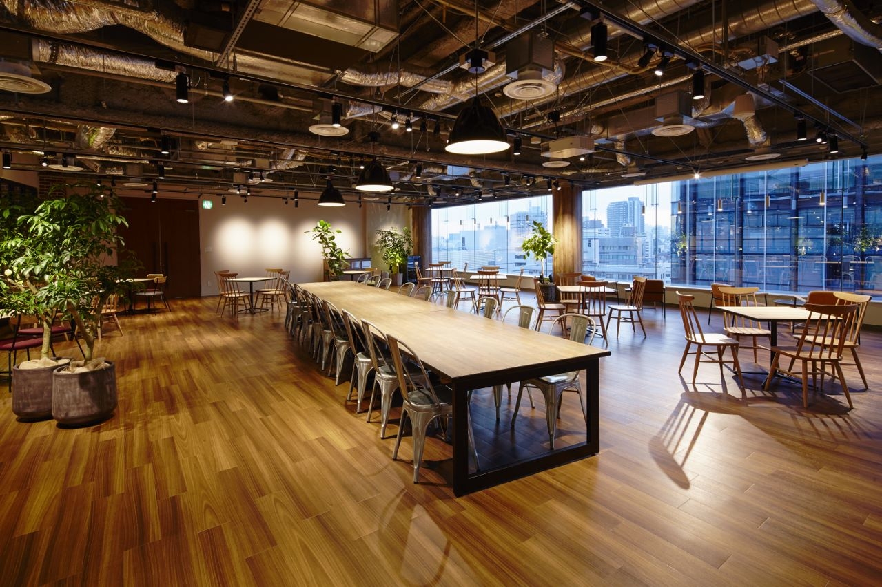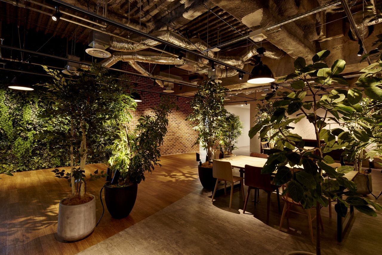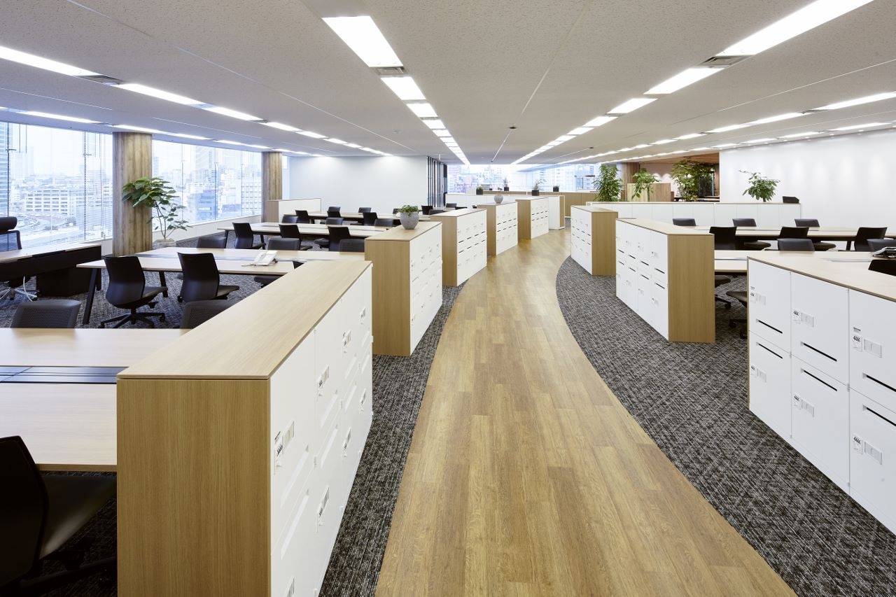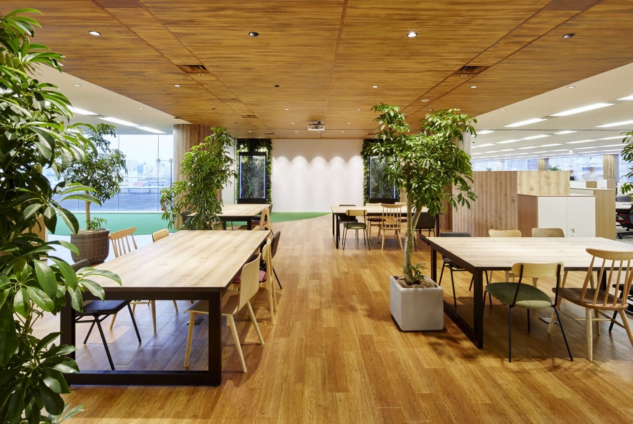本社のご移転プロジェクトに携わらせていただきました。本社ビル一棟の複数フロアの構成から、1フロアへと大きく異なる働きかたになることから、自然にかつ活発にコミュニケーションが溢れるオフィスになるようデザインしました。プラザと呼ばれるエントランスと窓側に設けたカフェスペースにはスケルトン天井、木目柄の床材と植栽や壁面緑化で空間を構成し、この木目柄の道がワークスペースの中へと続いています。この道で人と人が出会い、傍にあるスペースで気軽に打合せができるようなコミュニケーションで溢れた働くひとが主役のランドスケープオフィスです。