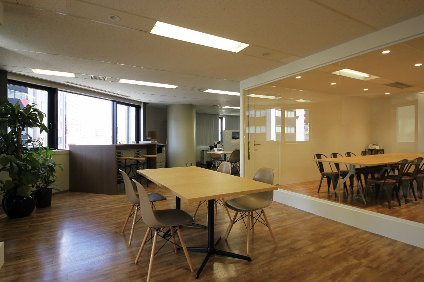 社内をクリエイティブな空間にしたいという代表の想いをカタチにするべく本社の改装プロジェクトに携わらさせていただきました。デザイナーを多く抱えられ、思考の妨げにならないよう白と木目柄にて空間を構成しました。エントランスはシンプルながら間接照明の光の帯や、ガラスの上下壁が空間に動きを感じさせます。会議室や社内ミーティングスペースはガラスの壁にしており、空間の広がりとここから新たなアイデアが生まれる瞬間が来客者にも感じていただけるようにしました。ワークスペースには通路側の壁面に造作本棚を設けて、収納を一元化することで、社内の整理整頓を図りました。新たな創英カラーに染まるクリエイティブオフィスの完成です。