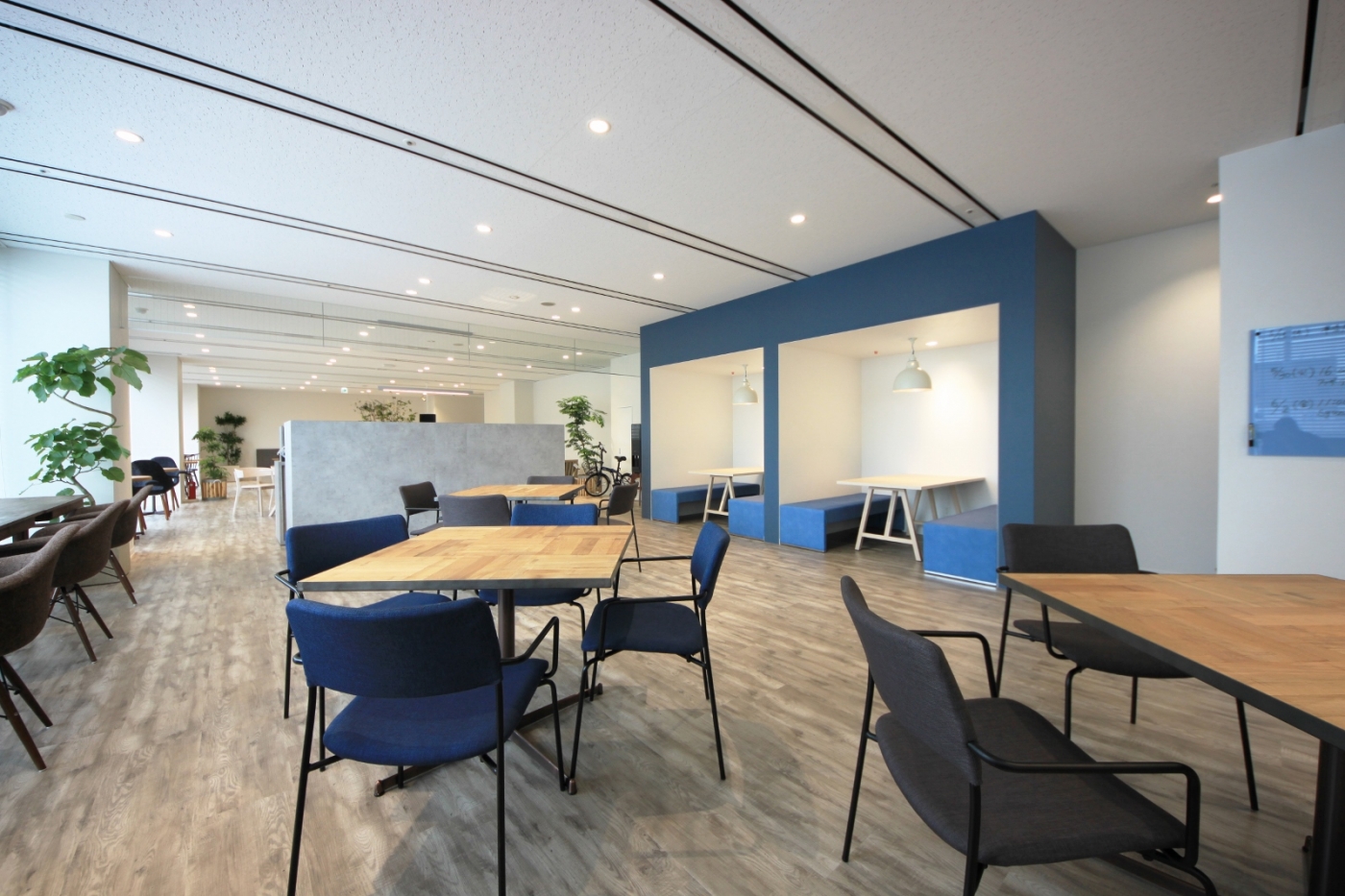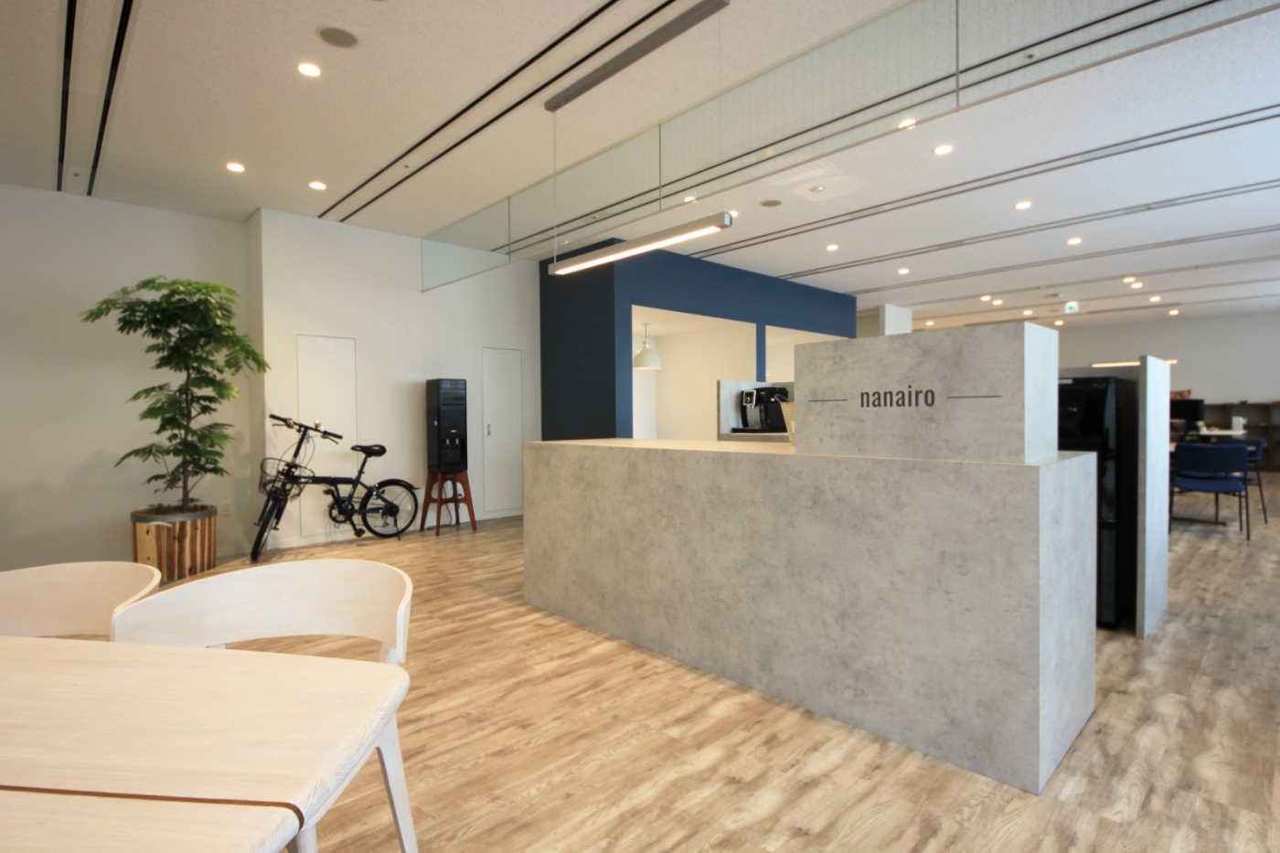 新社名で新たに運営会社として披露する株式会社nanairo様。西海岸のショップのイメージをnanairo様風にデザインし、カフェのような空間で働けるようにしています。またオフィスっぽくないオフィスを目指して家具もトータルコーディネートしており、既存流用の家具も調和できるデザインをしています。緑化計画や照明計画など、充実したオフィス環境をふまえた設計デザインです。 “nanairo days”をコンセプトに、1週間を通して、毎日どんな時でも、新しい働き方・健康・コミュニケーションを刺激する環境にこだわったワークプレイスができました。