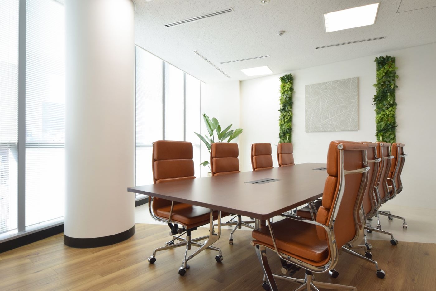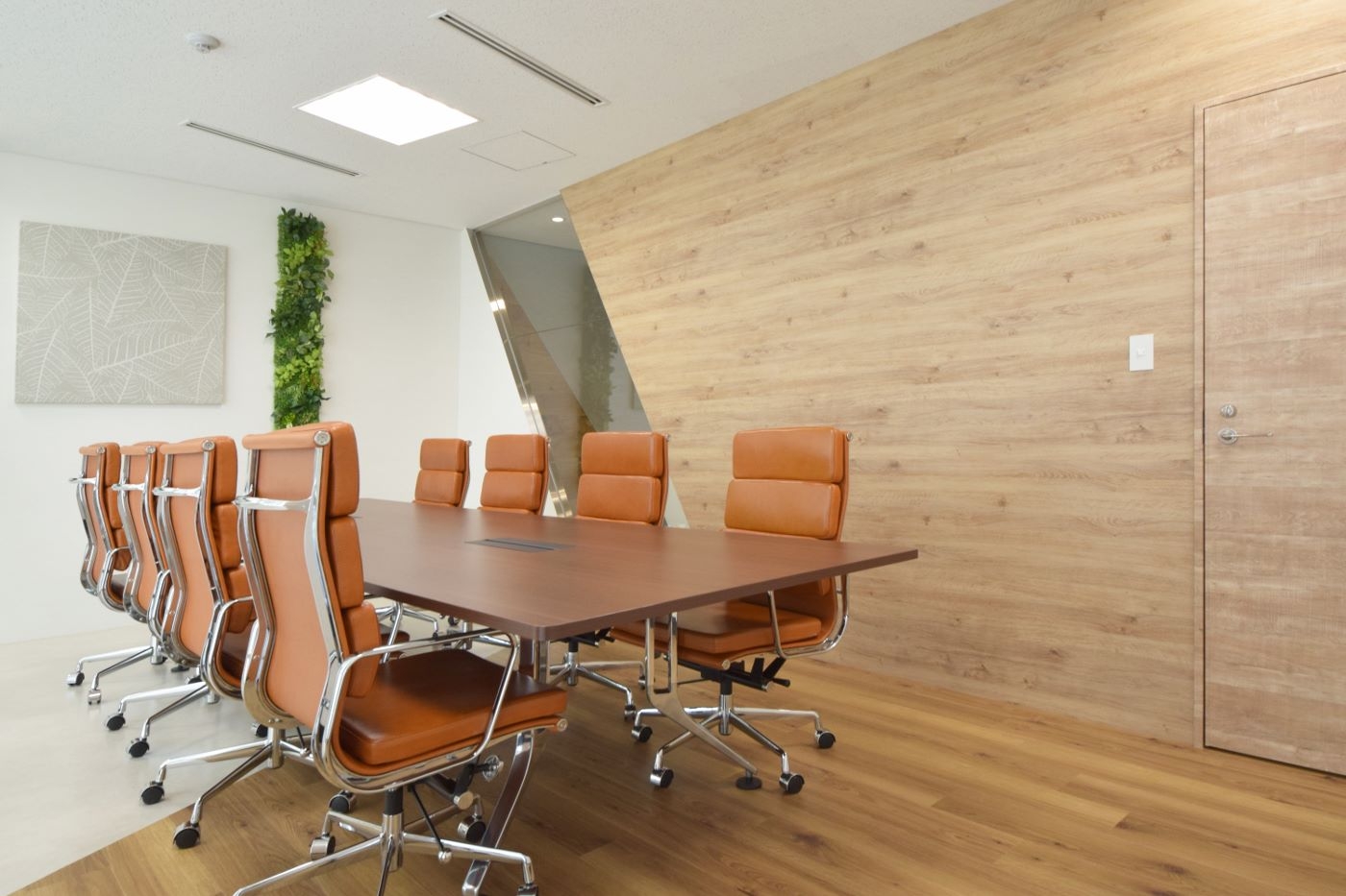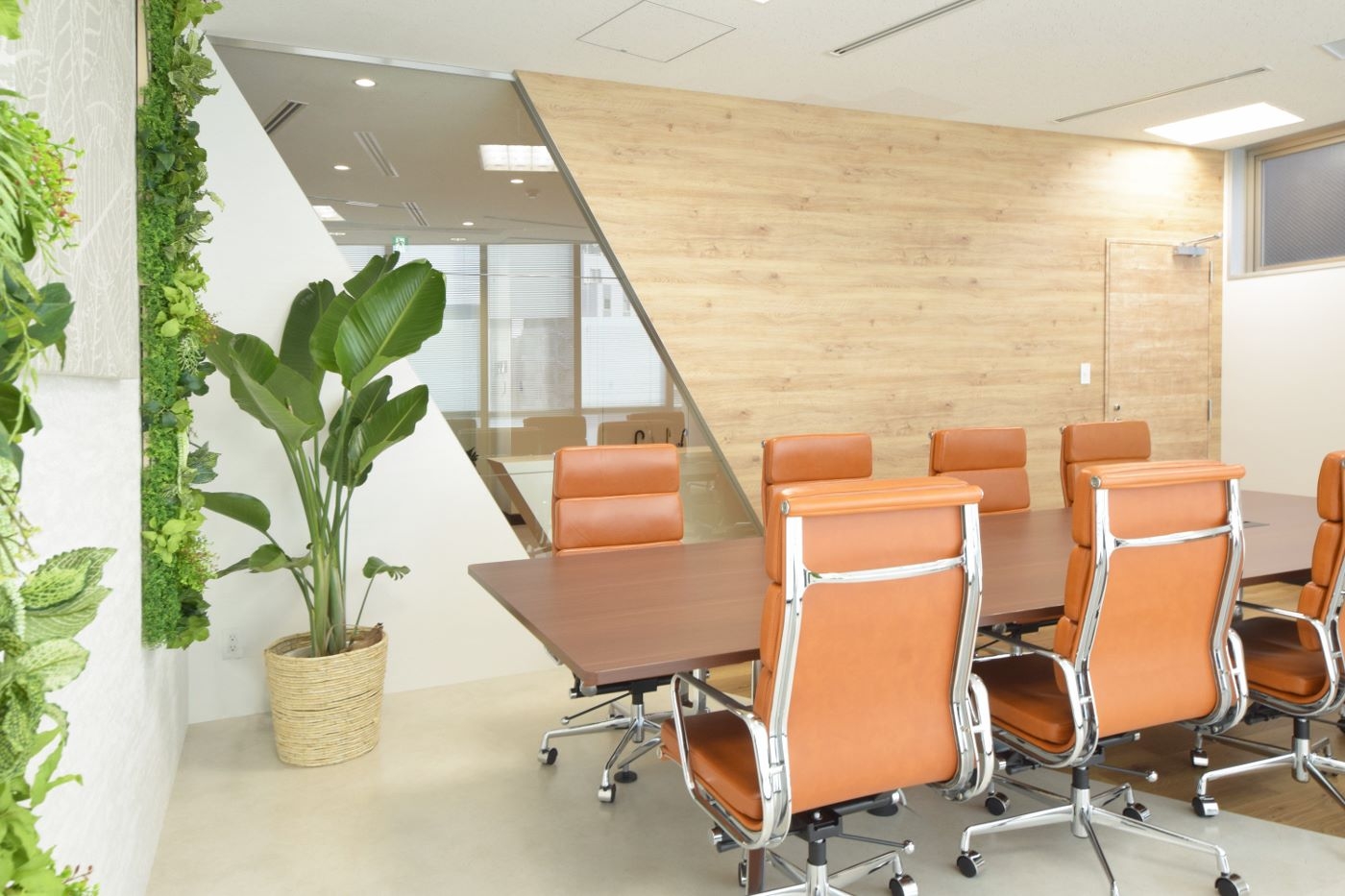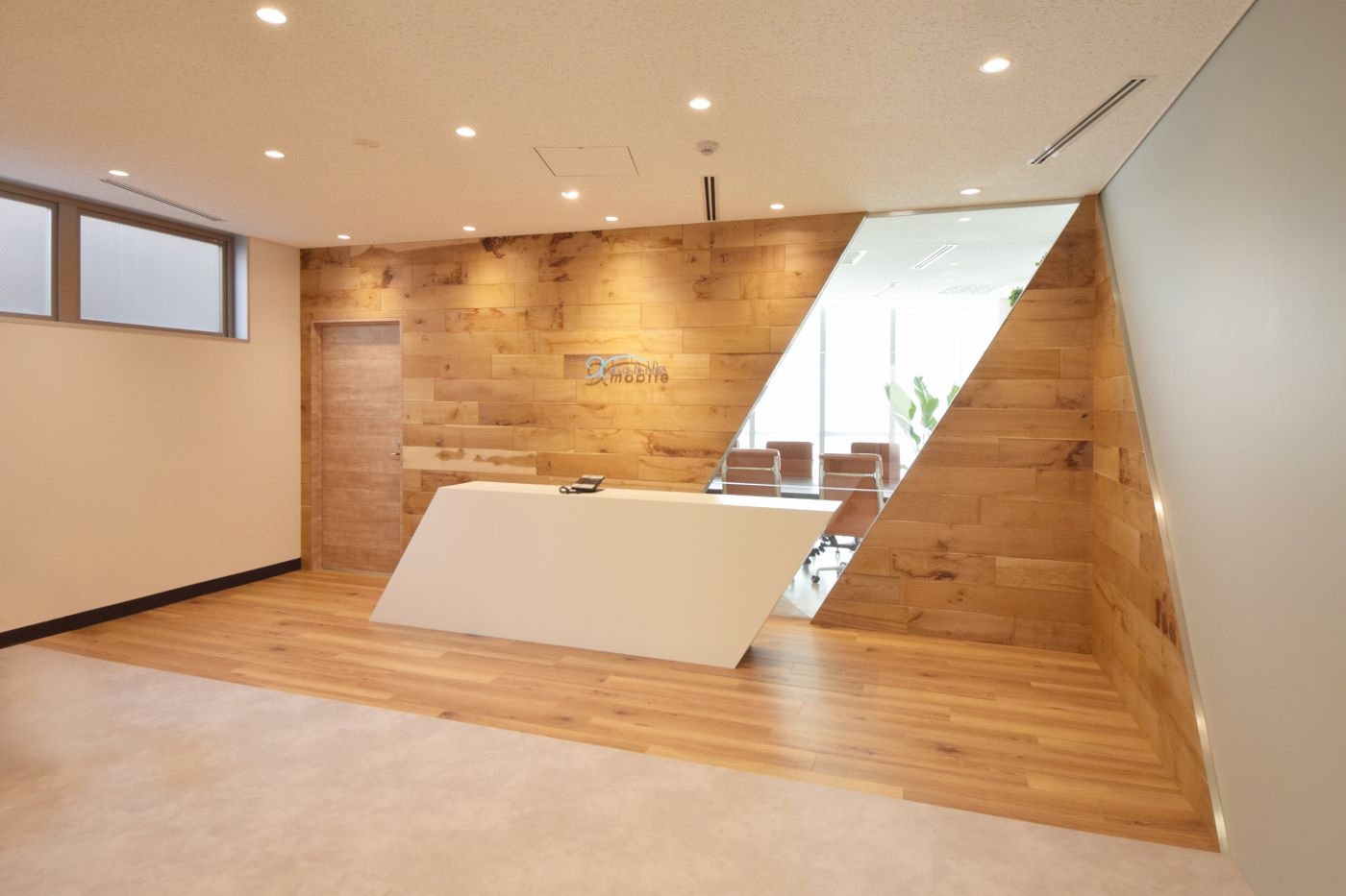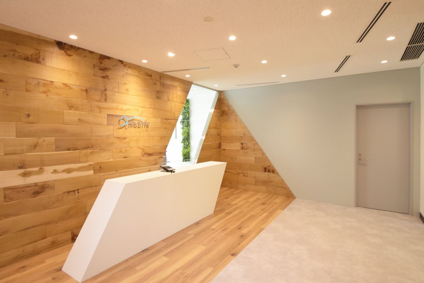 エントランス全体は木素材を用いることで温かみを演出しながら、ロゴの「X」をイメージさせる斜めラインのガラスやひし形の造作カウンターが空間にインパクトを与え、唯一無二のデザインとなりました。ガラスから会議室が抜けてみえることで空間に奥行き感をもたらし、より拓けた印象を与えます。会議室内も斜めラインに合わせて壁や床の素材を張り替え、エントランス空間から繋がっているようにデザインすることができました。シンプルなカラーコーディネートながらも、エクスモバイル様を強く感じることができるオリジナル性の高いデザイナーズオフィスとなりました。