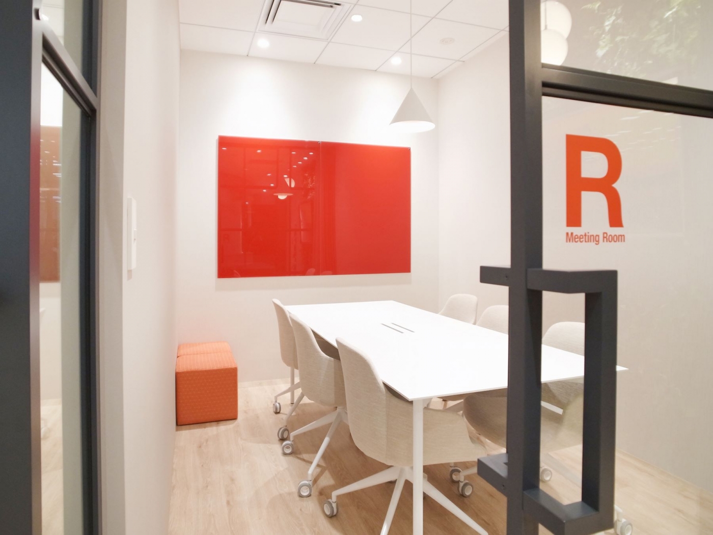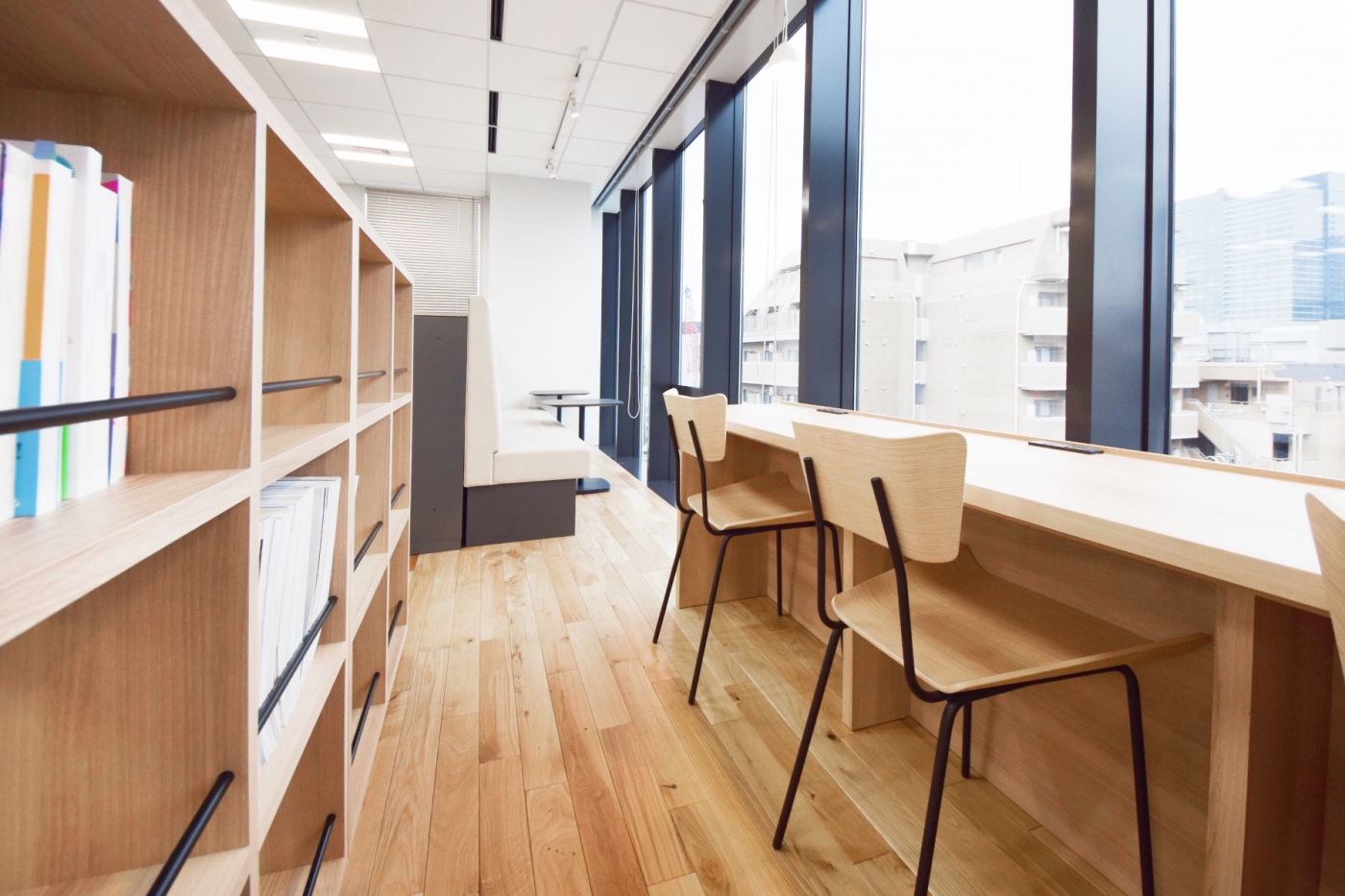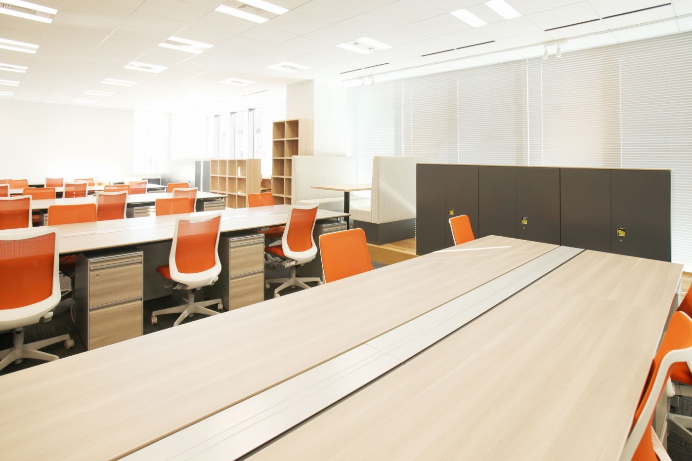 従来は「働く」という言葉は「WORK」と表現されておりましたが、現在は「PLAY」という言葉で表現されております。様々な働き方が求められているからこそ、オフィスの中に遊びの要素取り入れてデザインレイアウトしました。窓際のリフレッシュスペース、カフェカウンター、ソファスペースなど、様々な形態の集まれる仕掛けを随所に点在させ、社員様のニーズに合わせて集まれるまるで公園のようなイメージのオフィス空間になりました。エントランスのRの壁はCforce様のCをイメージしており、曲線で貼り分けた床カーペットはワークスペースの床まで繋がっております。長期プロジェクトでしたので社員様と幾度も打ち合わせを重ね、”どんなオフィスが働きやすいか”を一丸となって追及し完成したデザイナーズオフィスです。