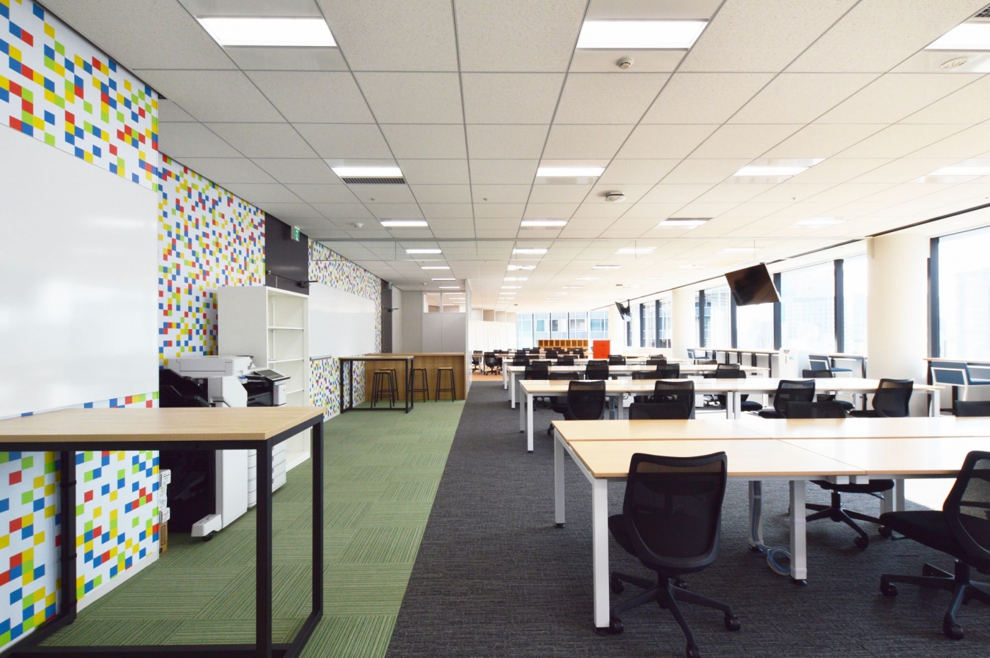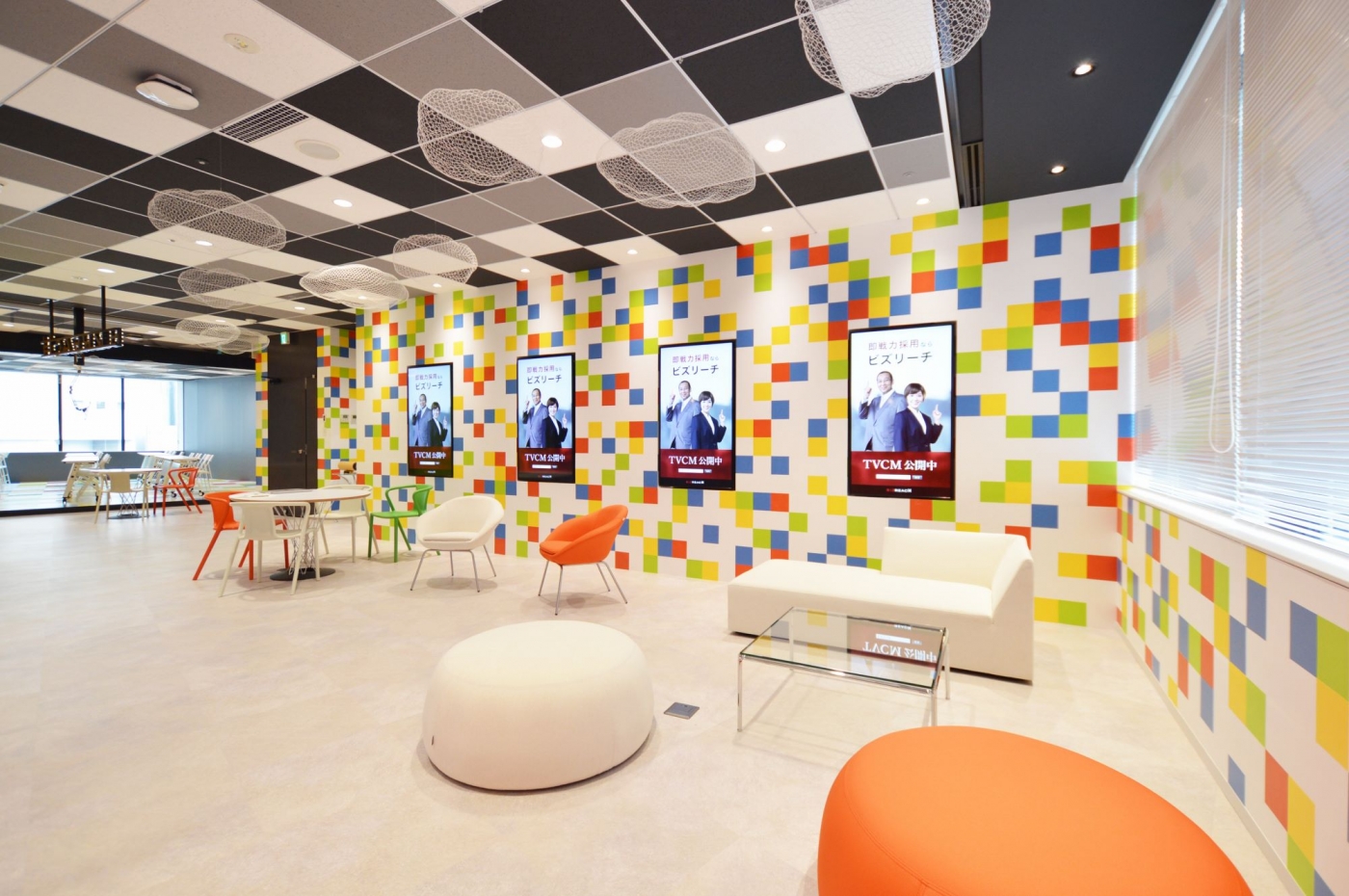 ビズリーチ様の関西オフィス。「大阪っぽさ」をイメージしたインパクトと驚きを与えるオフィスとなりました。 エントランスでは、エネルギッシュな大阪をイメージしたサインがお出迎え。iPad受付システムも宙に浮いているかのように天井から吊っています。会議室は部屋ごとに色鮮やかな4色で構成されており、壁・床のデザインペイントとも連動。多彩なモザイク柄に統一感を出しました。壁面埋込型のデジタルサイネージはビズリーチ様のサービス案内が流れ、セミナールームにはダイナミックなプレゼンテーションができるよう、約180インチ大画面のLEDビジョンを設置。 ワークスペースはフリースペース・ホワイトボードを充実させ、インパクトと高い機能性を備えたオフィスになりました。