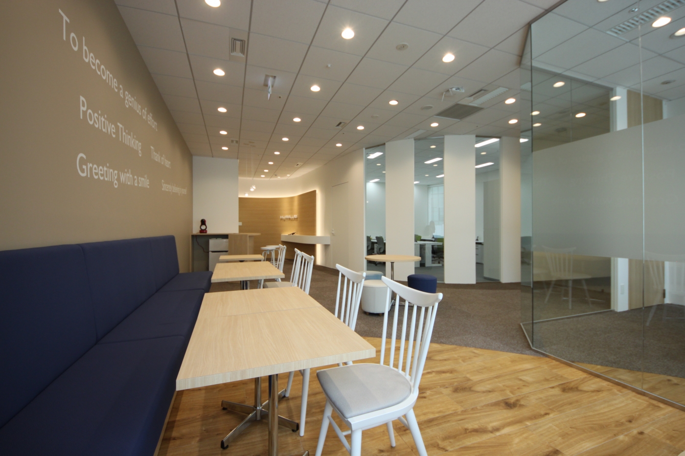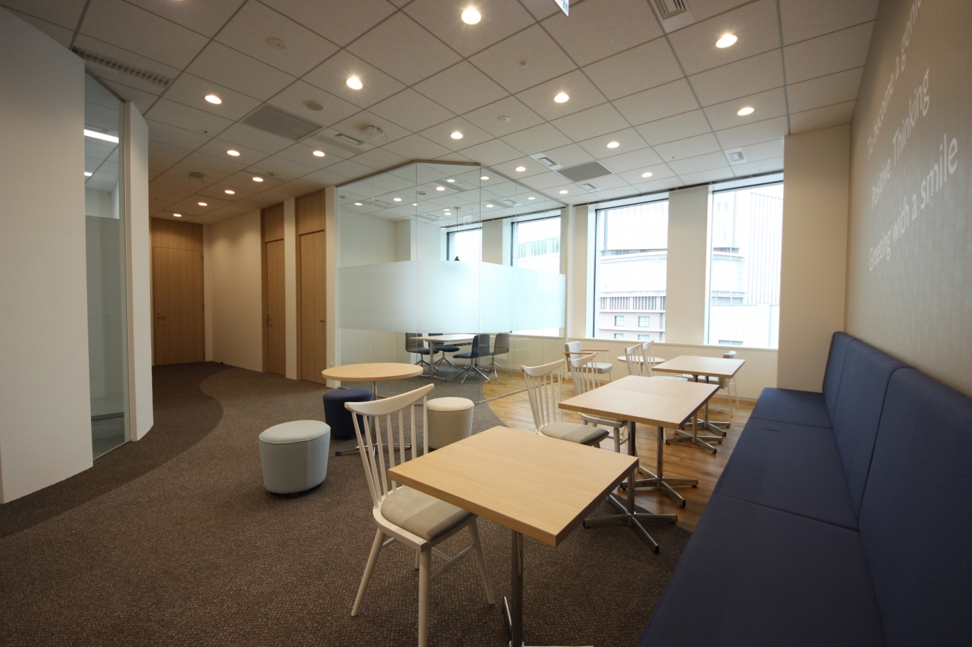 採用の拠点を大阪梅田の新築ビルに開設されたヒューマレッジ様。「本当の人間教育」という企業理念を体現し、より理念に沿った人財と出会うためのオフィス創りをお手伝いしました。代表の想いをデザインしたエントランスで来訪者を迎え、大きなカーブで社内へ招きます。大きく明るい窓を活用した開放的なカフェスペースでは、社員様と来訪者のコミュニケーションが充実すること間違いなしの空間となっています。ワークスペースがちらりと見えることも、風通しの良い社風を体現しています。面接を行う会議室は、ガラスを用いて広く感じさせることで緊張を和らげます。志の高い人と出会うための場所であり、人間力を高められる空間ができました。