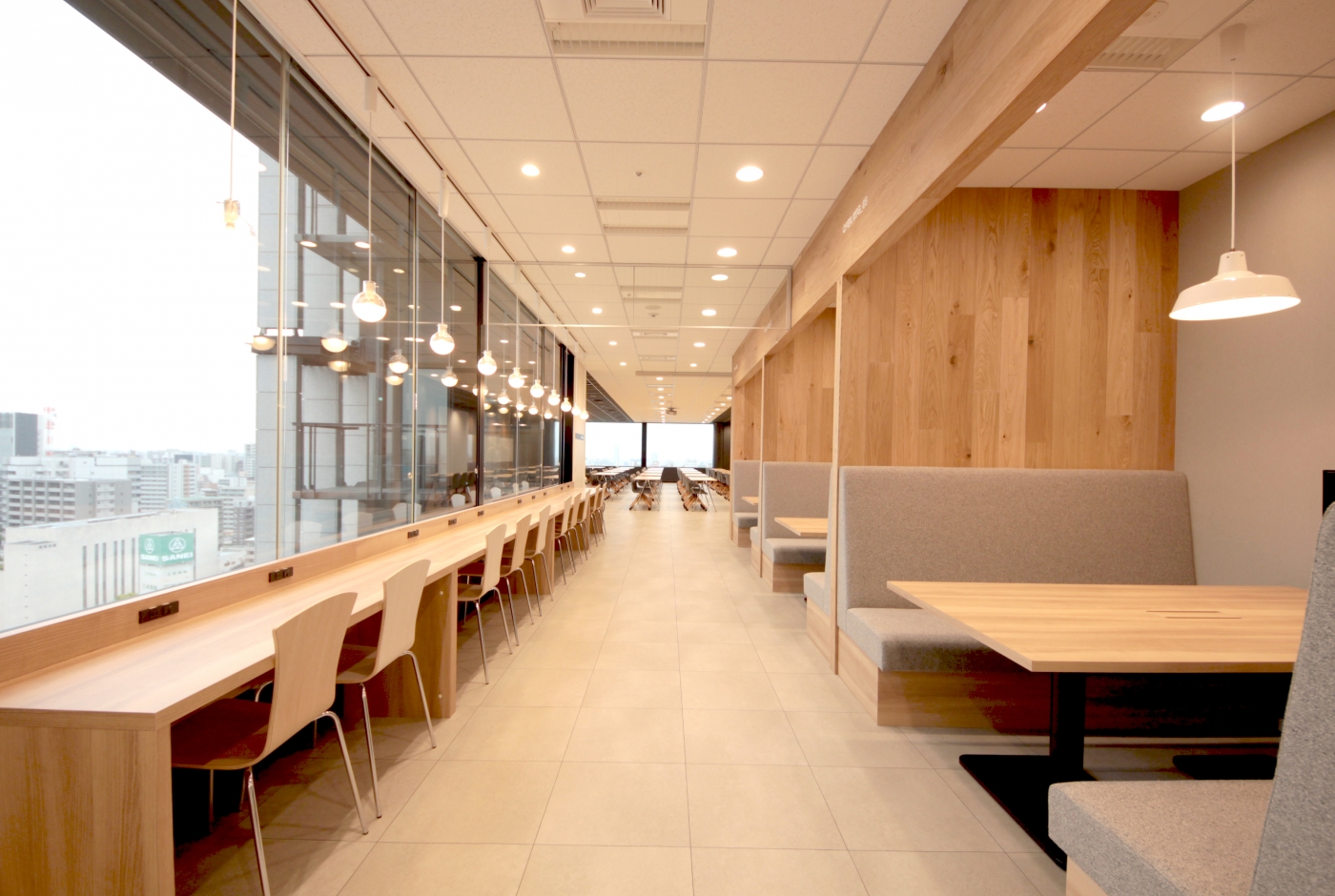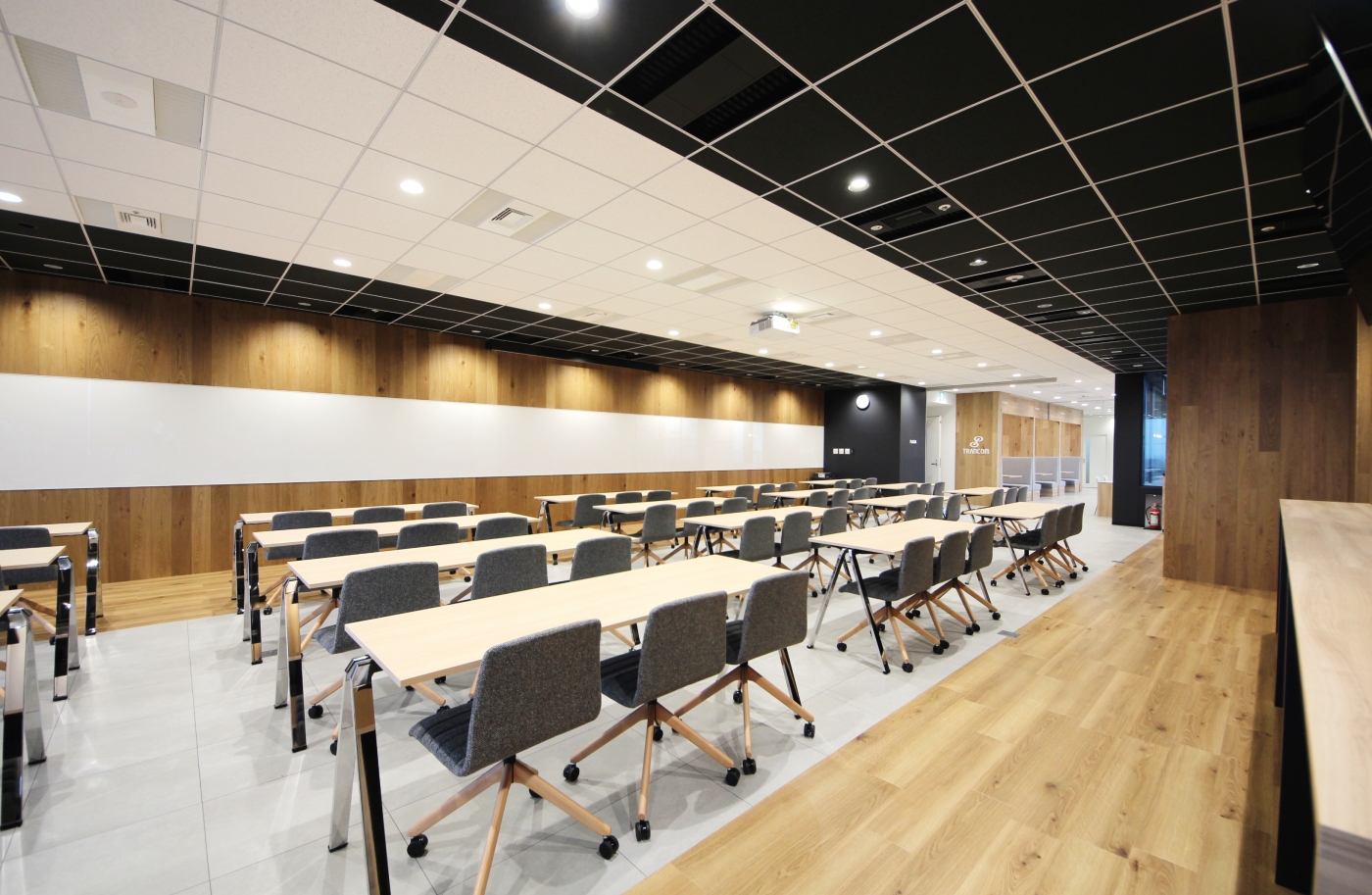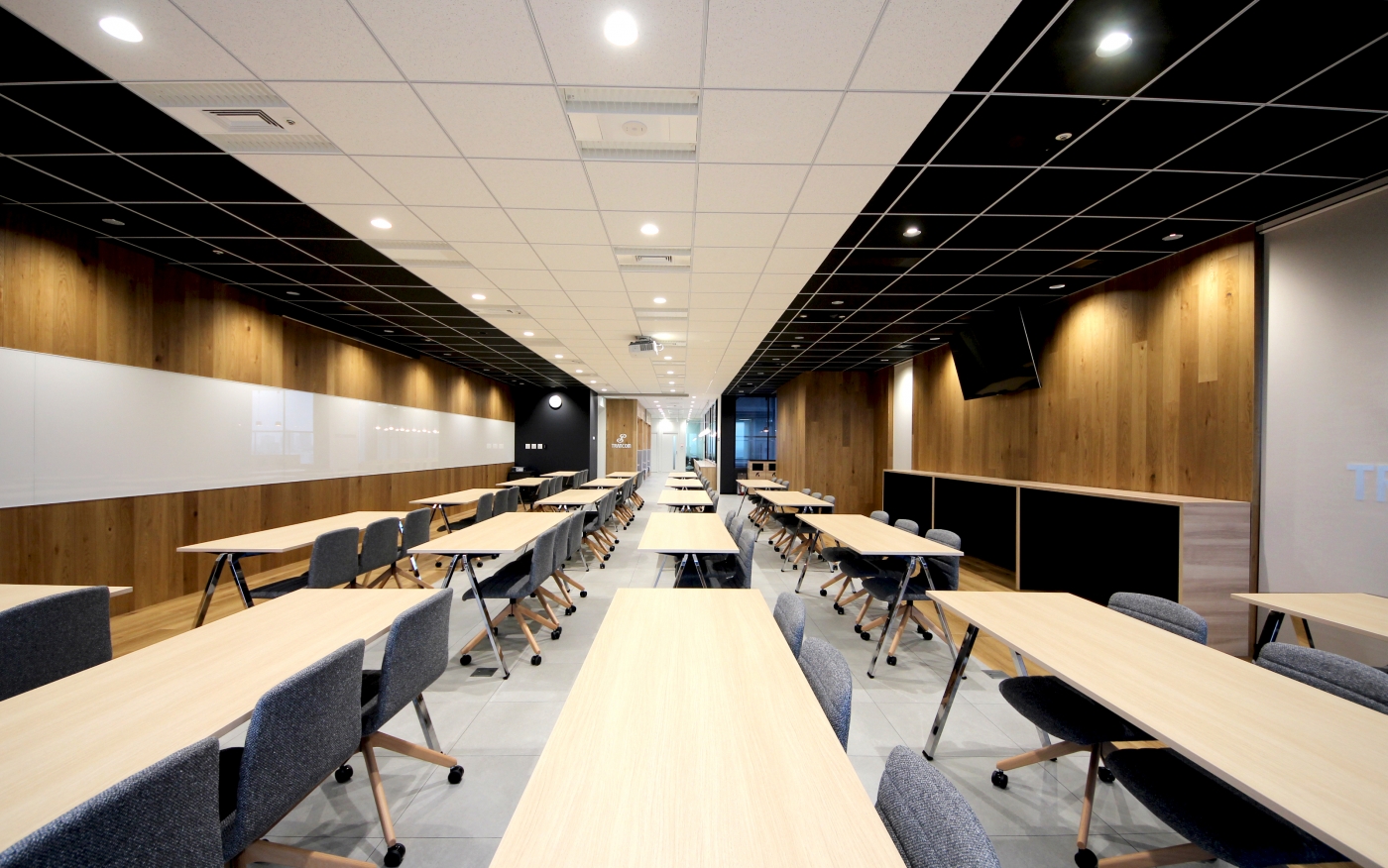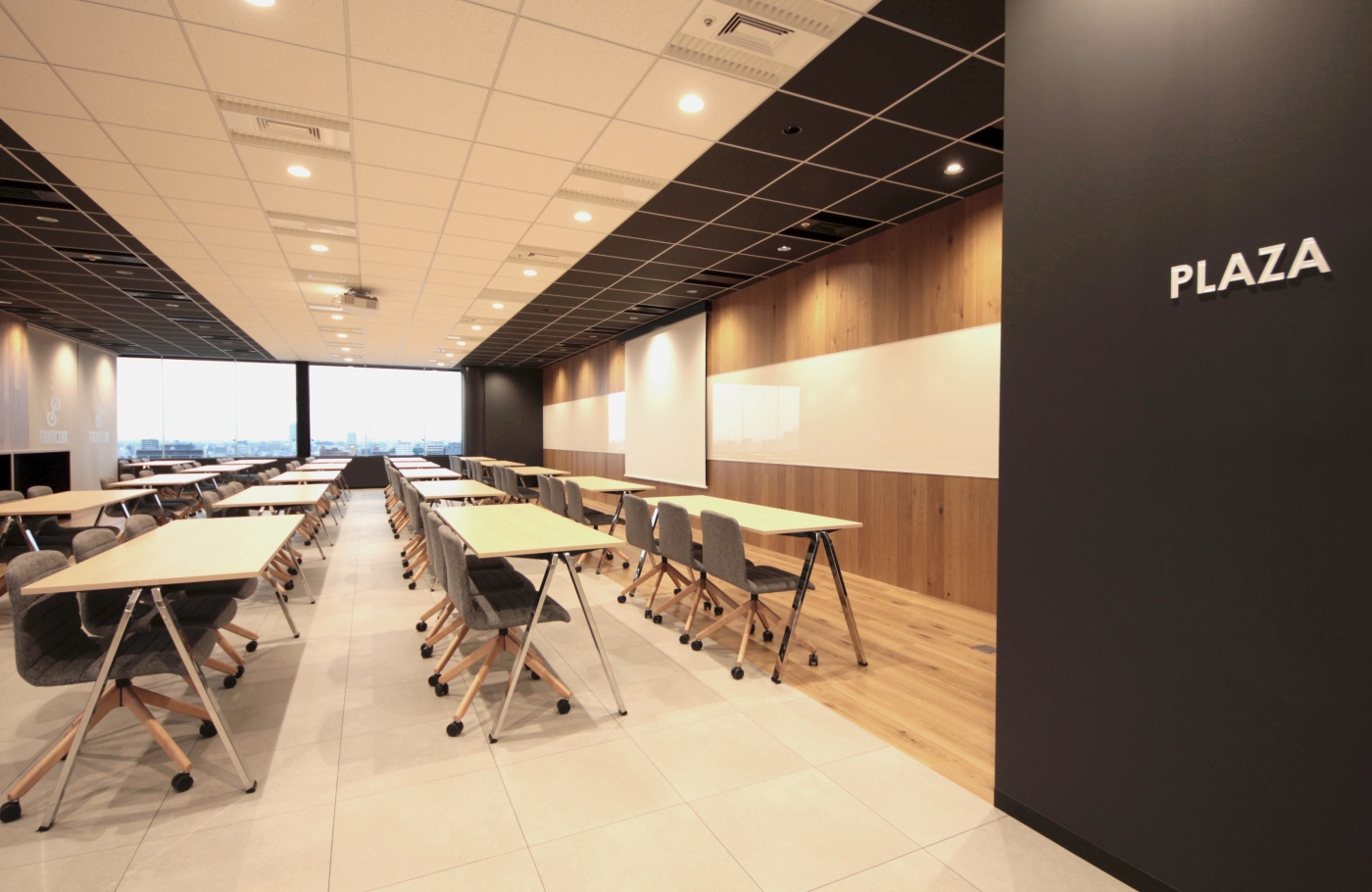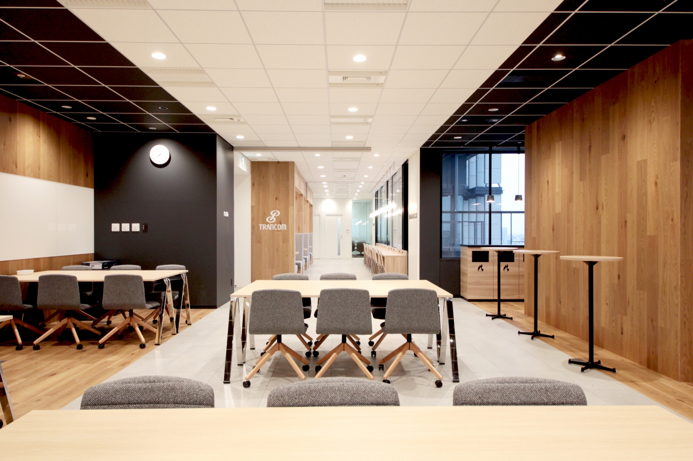 名古屋市新栄駅直結のインテリジェンスビルに、新たに誕生したトランコム様のコミュニケーションスペース。名古屋本社内にある「PLAZA(プラーザ)」と名付けられたこのスペースは、皆様が気軽に立ち寄れたり、打合せやランチなどフレキシブルに運用できるような空間として作られました。床と天井のリンクしたデザインが印象的で、空間にメリハリを与えます。採用する什器にもこだわり、全体をクールに親しみやすく演出しました。この「PLAZA」を通じて、さらなるコミュニケーションの活性化を図ります。