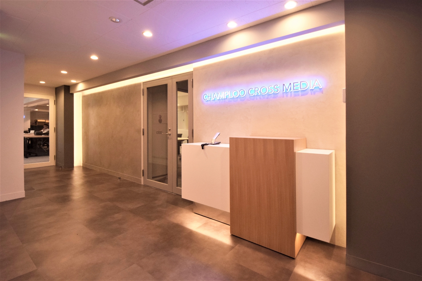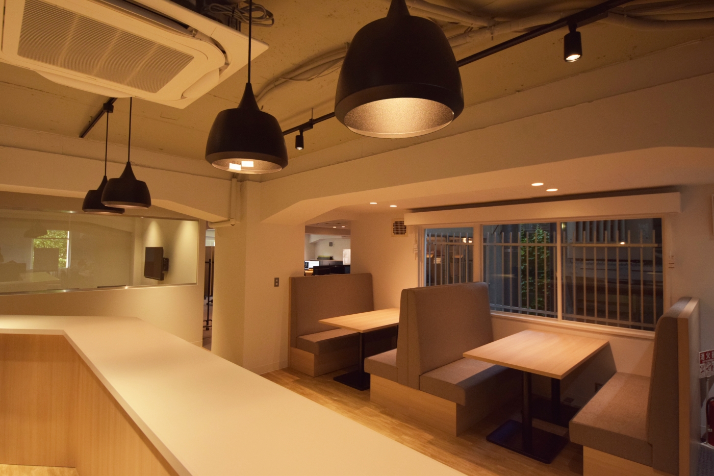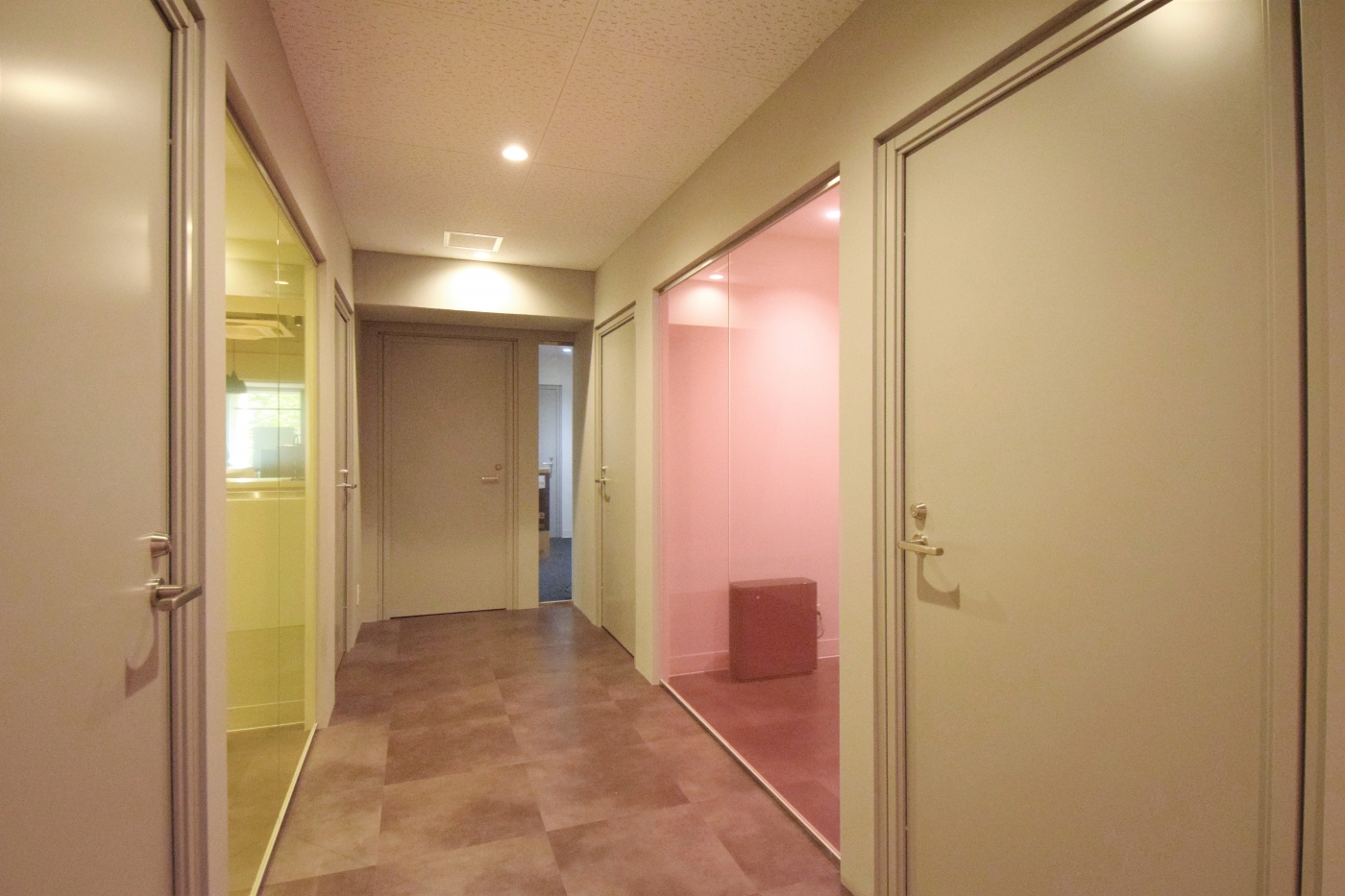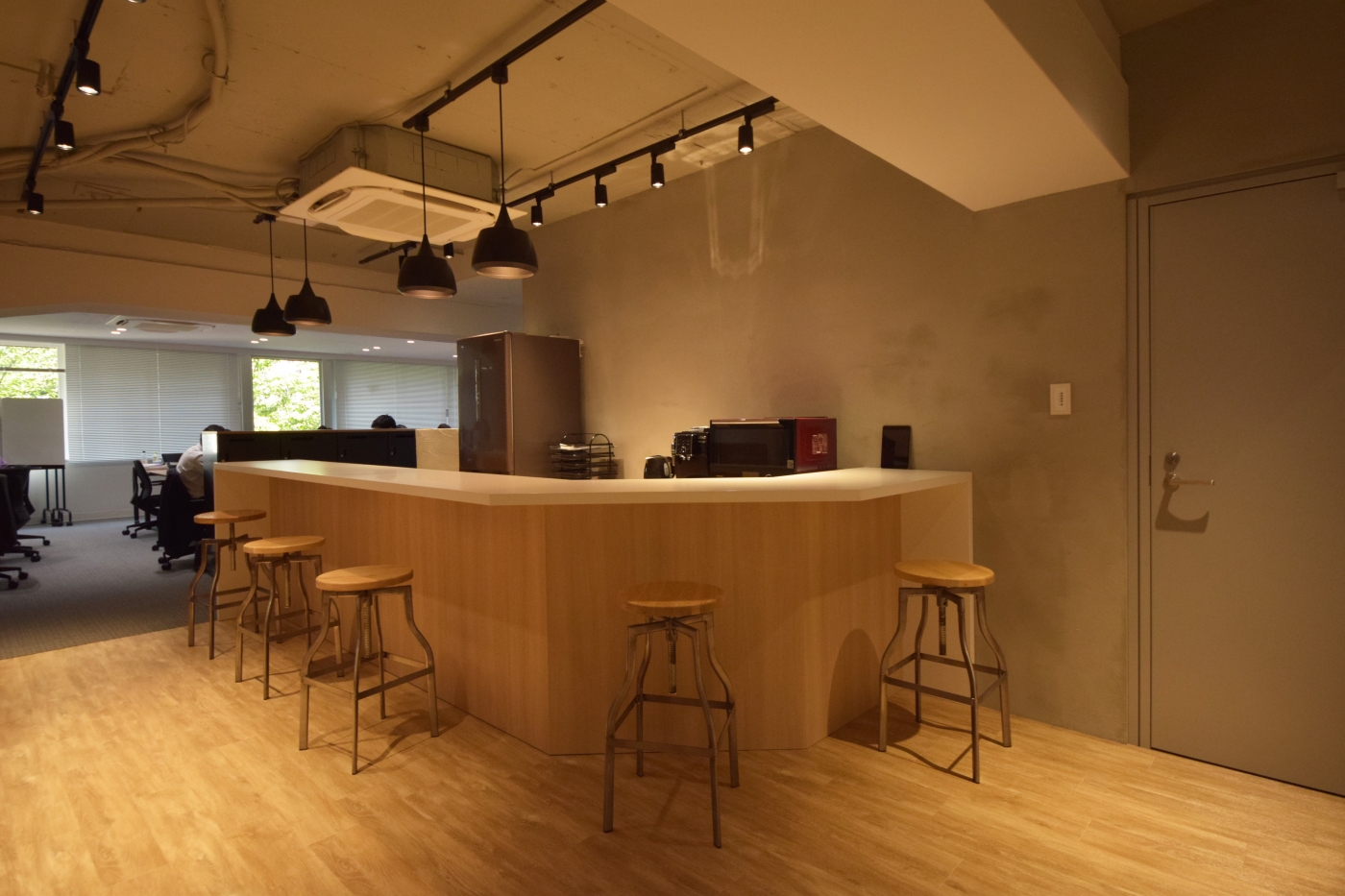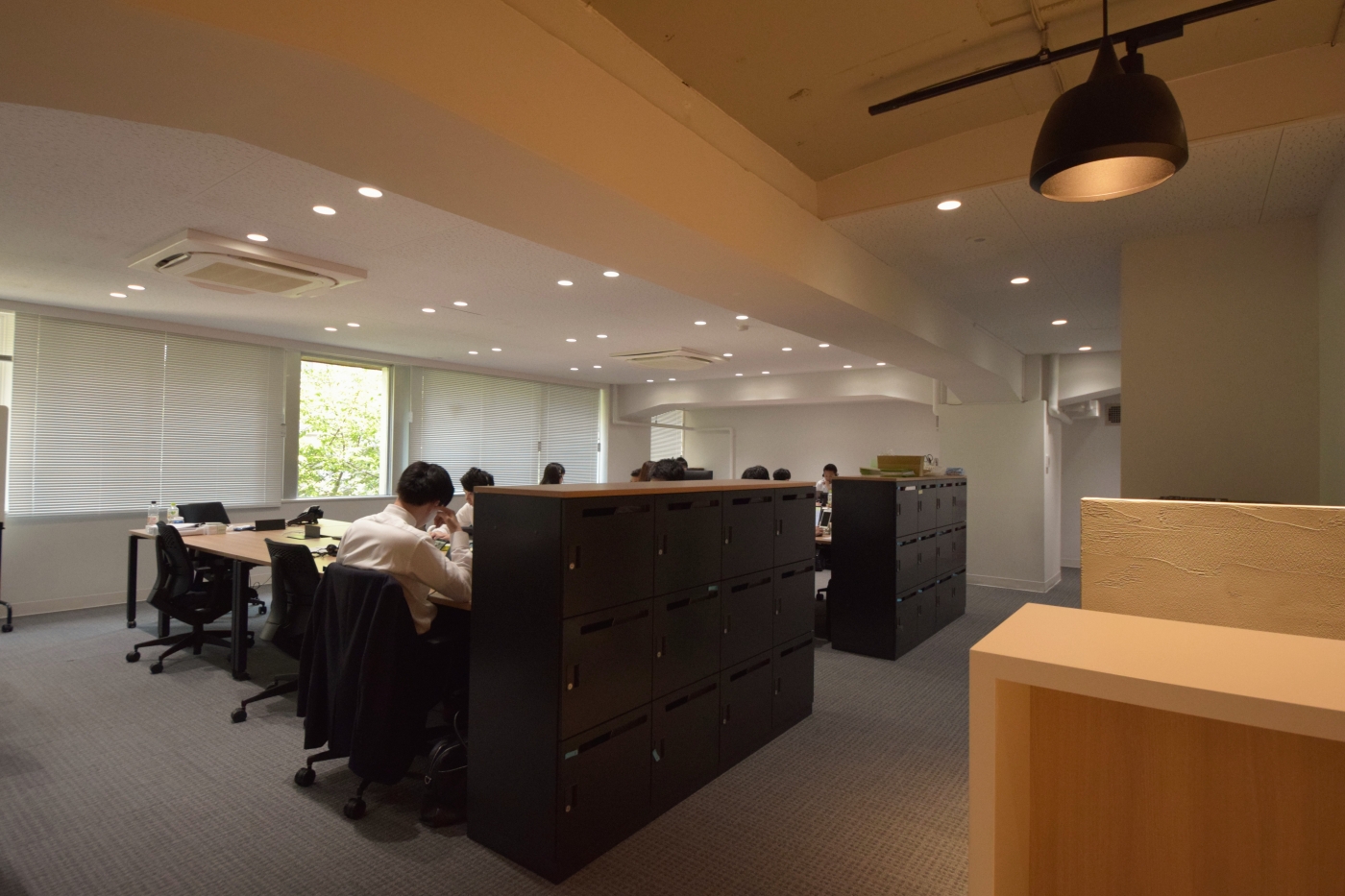 初めてオフィスを構えれれる『jinzy』様のオフィス。今回のオフィスの最大の目玉は、お客様のご要望であった調光式照明を執務スペースに取り入れた事です。太陽光の日の出から日の入りに合わせ、照明の明るさ、色温度を調整し、部署毎に最適な照明を設定しており、省エネ効果や健康的な働き方をご提案する事が出来ました。エントランスは最先端の事業を連想して頂けるよう、モルタル壁+LEDサインでCoolな印象に。一方各会議室は、ガラス+カラーフィルムで色味を出し、個性的な雰囲気を演出しました。ブラック×木目調で統一された執務スペースは窓から見える並木との相性も良く、場所によって様々な表情に変わるデザイナーズオフィスが出来ました。