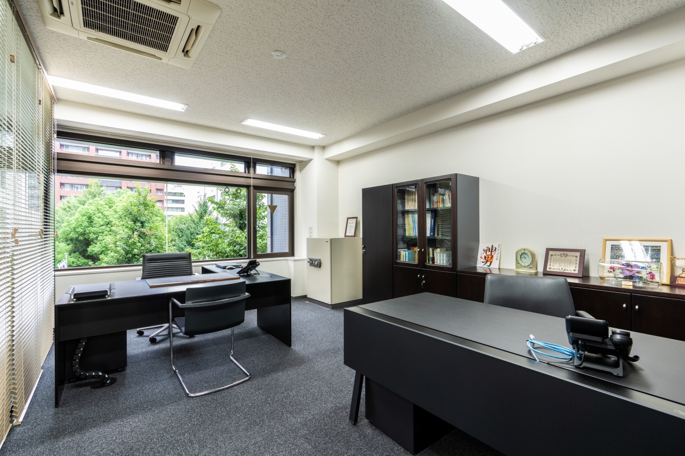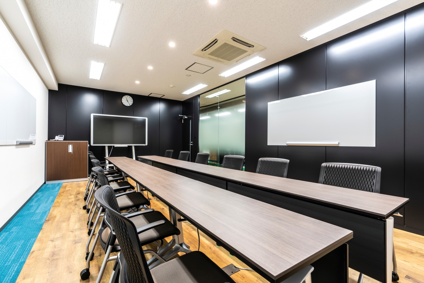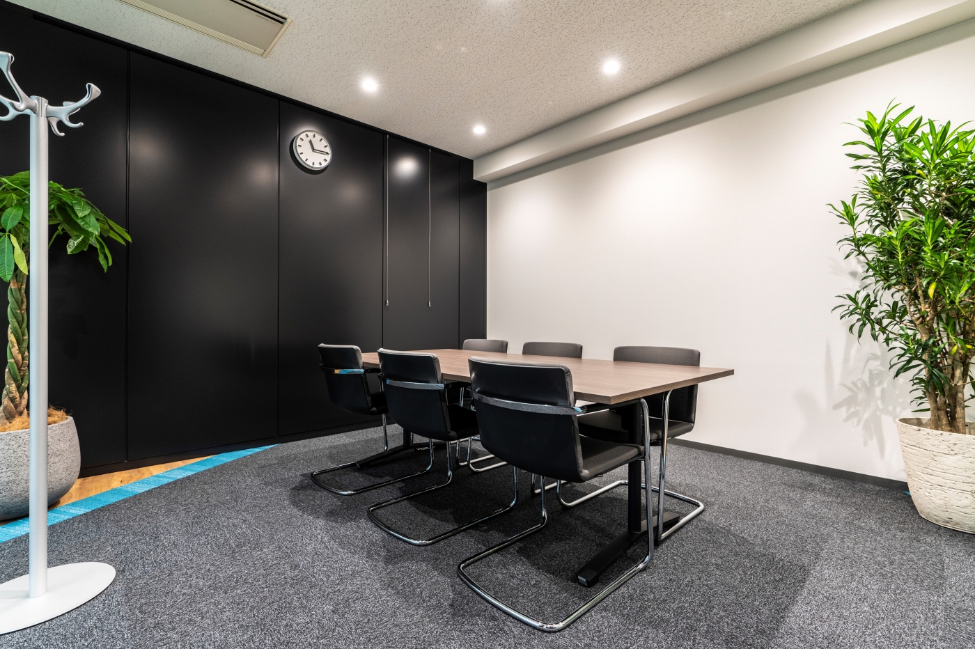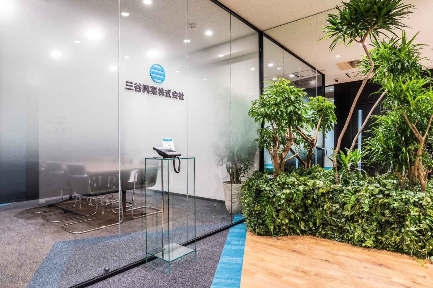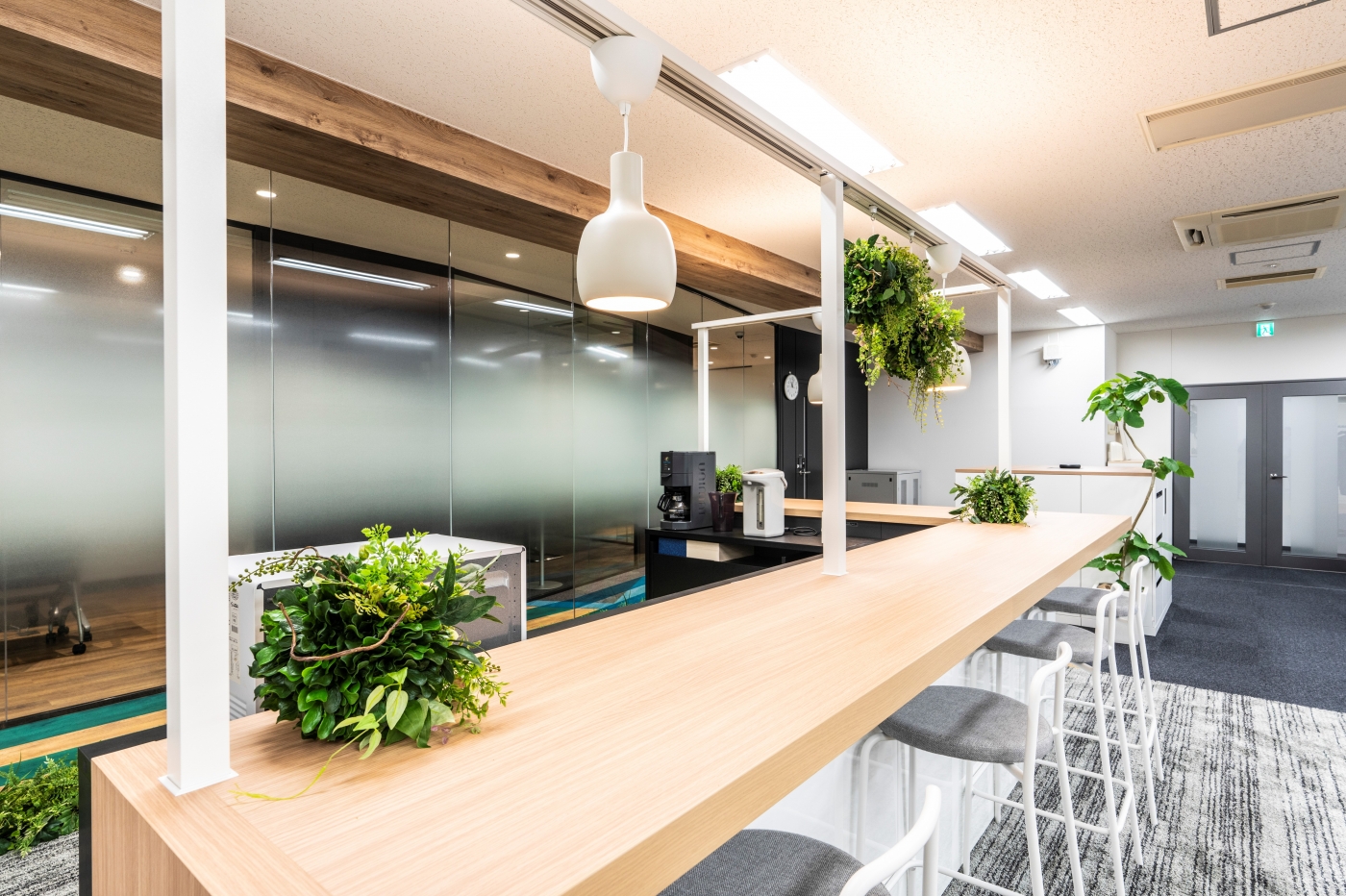 ガラス、黒、木目をデザインの軸に、挿し色にコーポレートカラーであるブルーを入れました。ガラスを多用しつつ、黒いフレームを用いることで全体の雰囲気を引き締めています。目線の高さには3M社のクラウドガラスフィルムを貼る事で、開放感を保ちつつプライバシーにも配慮したデザインにしました。受付の電話台もガラスで製作し、エントランスの空間に馴染むよう配慮しています。お客様で手配されたKOKUYO「DAYS OFFICE」のハイカウンターが新たなコミュニケーションを生むアクセントになっています。