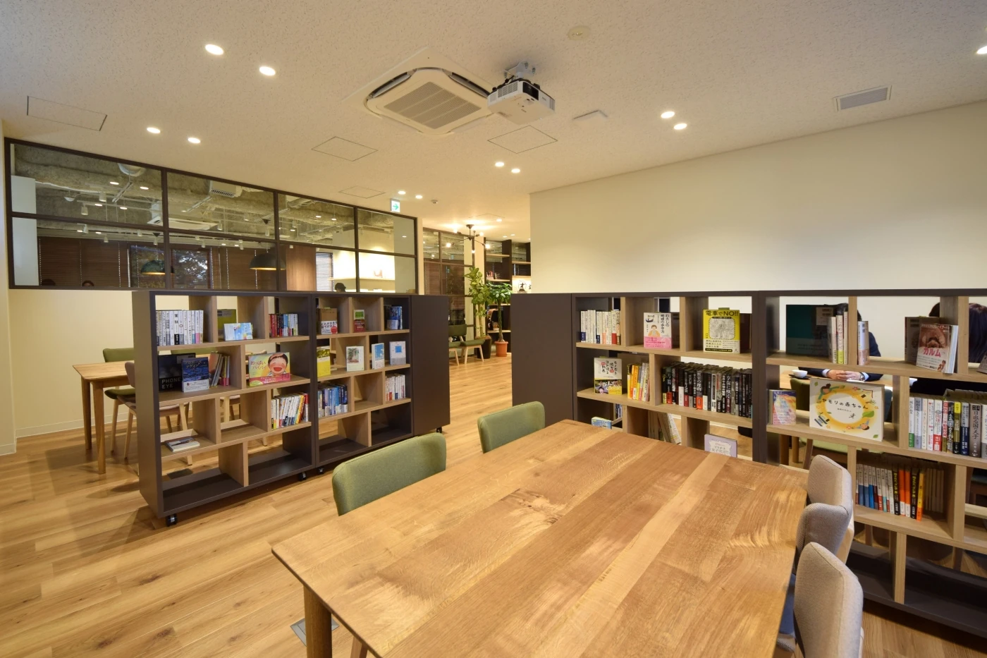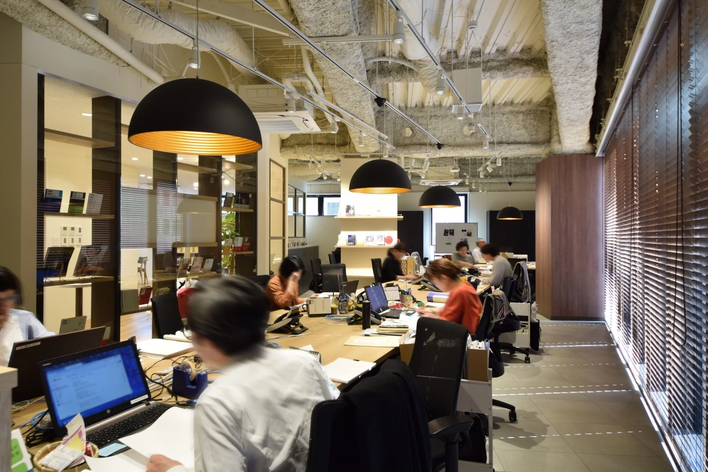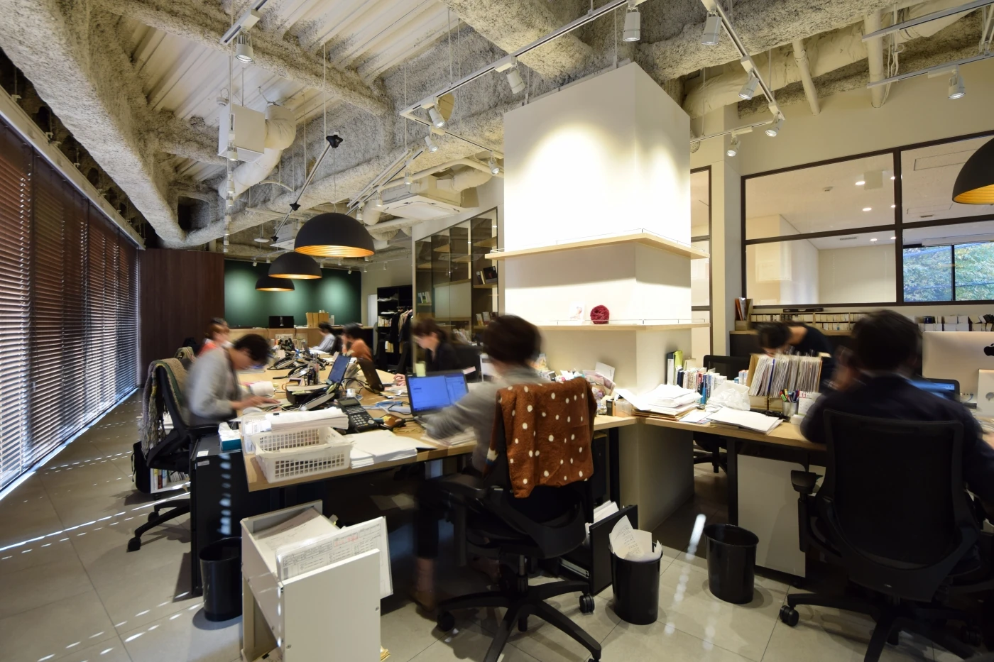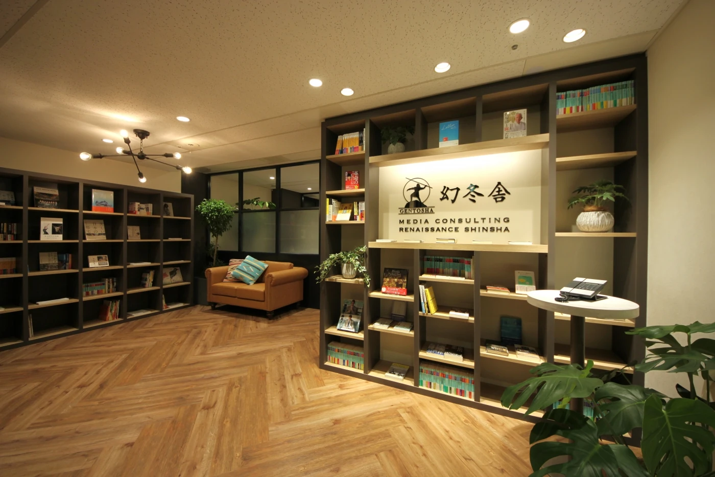 大阪のオフィスに引き続き、東京のオフィス移転もお手伝いさせていただきました。企業のイメージを表すように、大きなブックシェルフをエントランスとし、話題の書籍や雑誌をディスプレイしています。奥にはガラス越しにワークスペースのぞけるようになっており、限られた空間をより広く開放的に。ミーティングスペースは、これも可動式のブックシェルフで区切られており、時にはセミナーにも使えるようにフレキシブルな空間としています。ワークスペースにはデッドスペースになりがちな柱を中心に、ひとつなぎの大きな造作デスクを配置。さらにスケルトン天井にして白く塗装をしているので、画一的ではなくユニークなワークスペースとなっています。全体的にトレンドを取り入れつつも、非常に落ち着きのある空間で、幻冬舎様の歴史と温かさを表現したオフィスとなりました。 大阪オフィスはコチラ