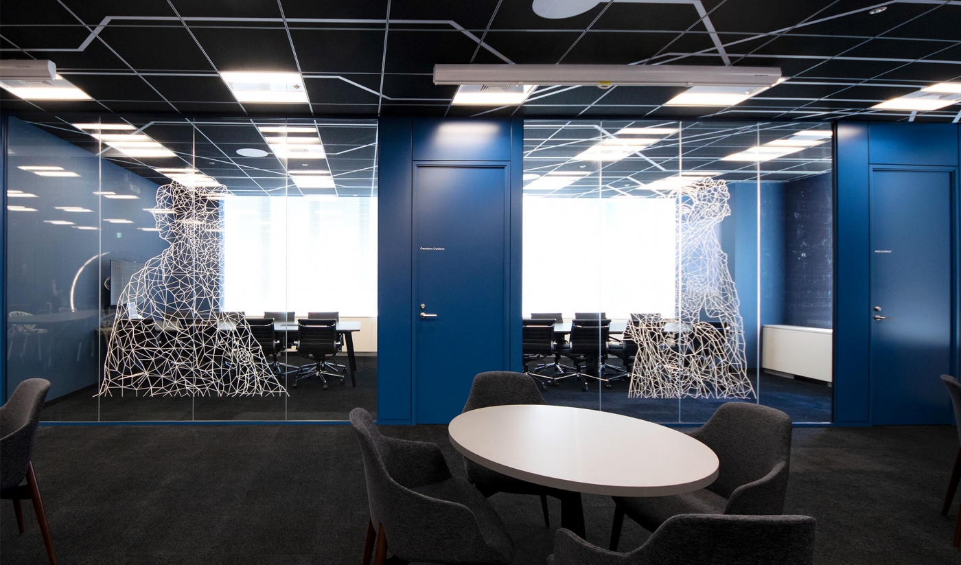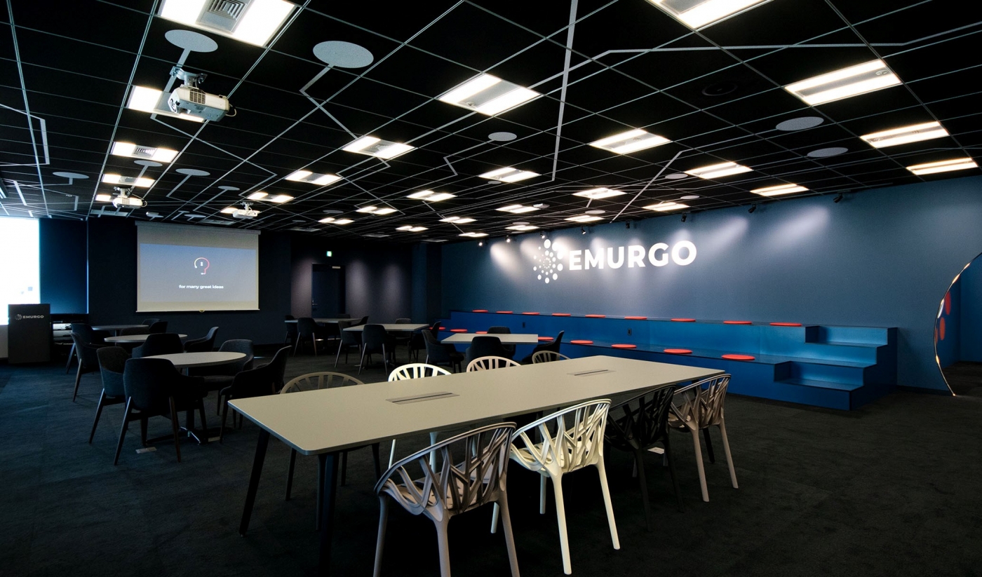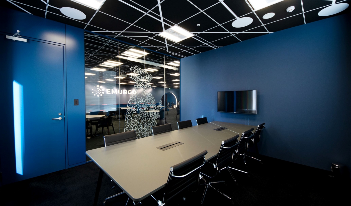 仮想通貨・ブロックチェーンというテーマと同時に、インスタグラムやTwitterに上げたくなるようなオフィスというご要望を頂き、空間をデザインしました。帯状の照明で無数の光の輪を構築したり、天井にブロックチェーンをイメージしたグラフィックを施したり、ガラス面にポリゴンデザイングラフィックで加工した人物の肖像を描いたりと、お客様のCIを尊重しながら革新的なデザインを数多く導入。オリジナリティのある空間になっています。また、「創造する」オフィスとして、エントランスからすぐの場所に社内外で利用できる広々としたコミュニケーションスペースをレイアウト。ひな壇もあるので収容人数が大きく、大規模なセミナーやイベントにも対応が可能です。カラーリングはコーポレートカラーに絞ってデザインし、引き締まった印象に。EMURGO様の更なる飛翔の舞台として相応しいオフィスが完成しました。