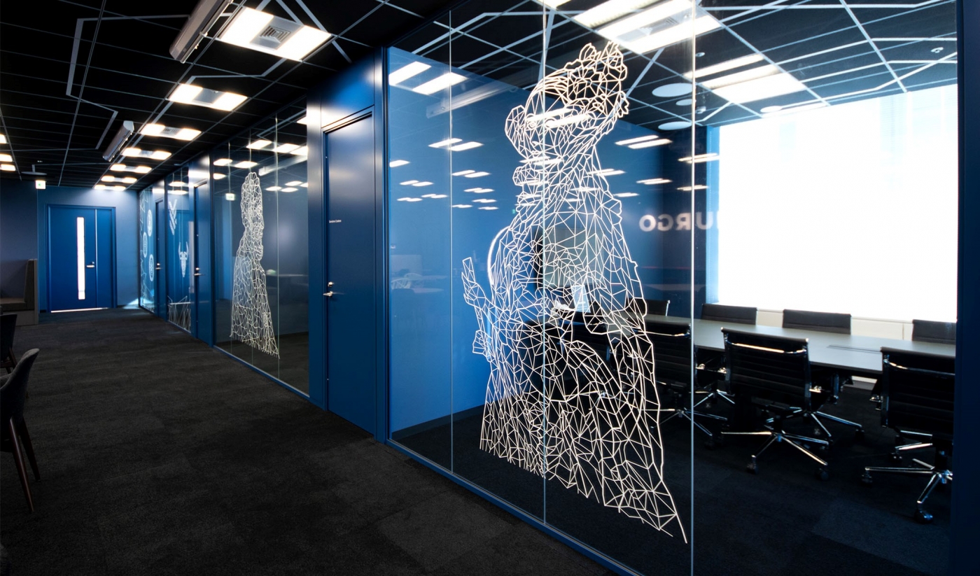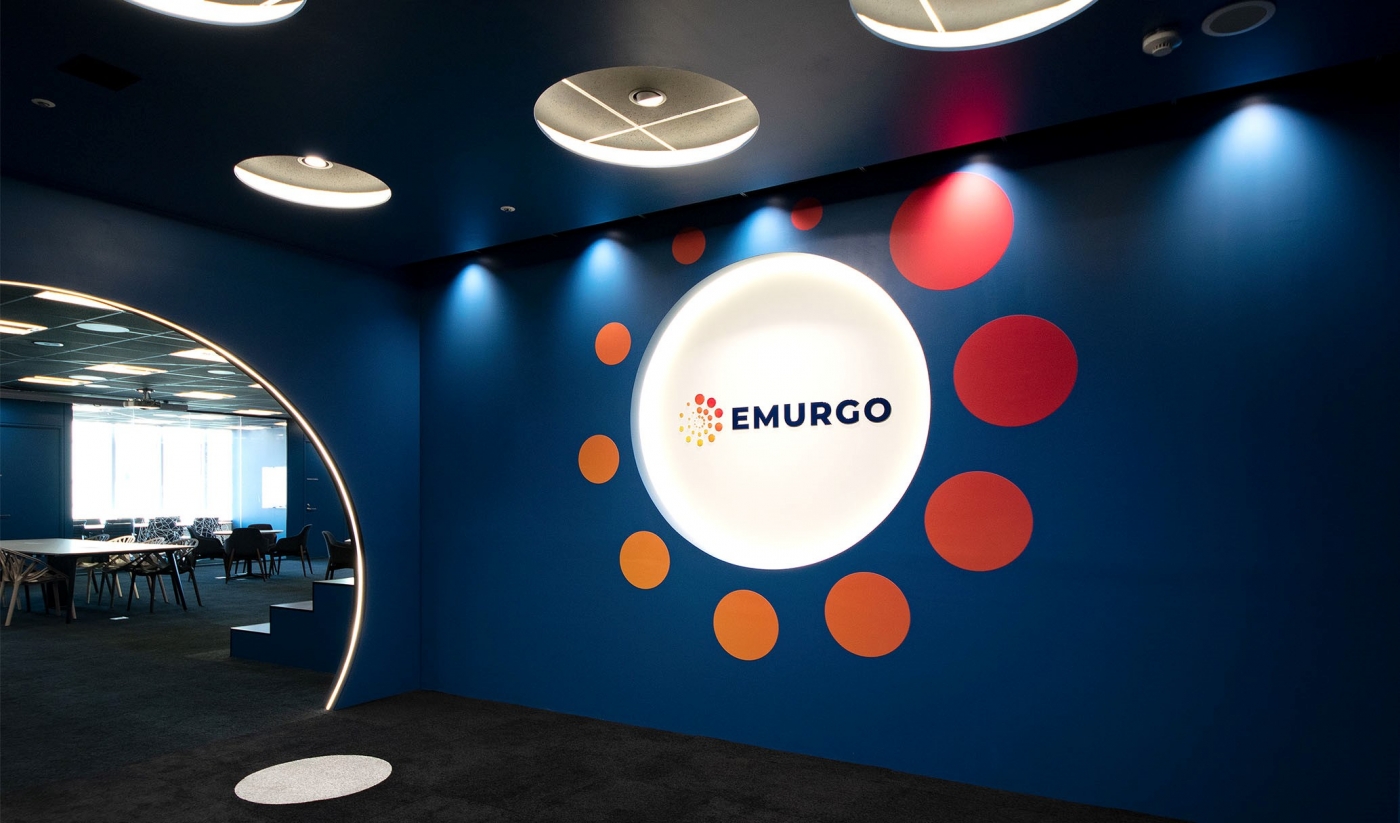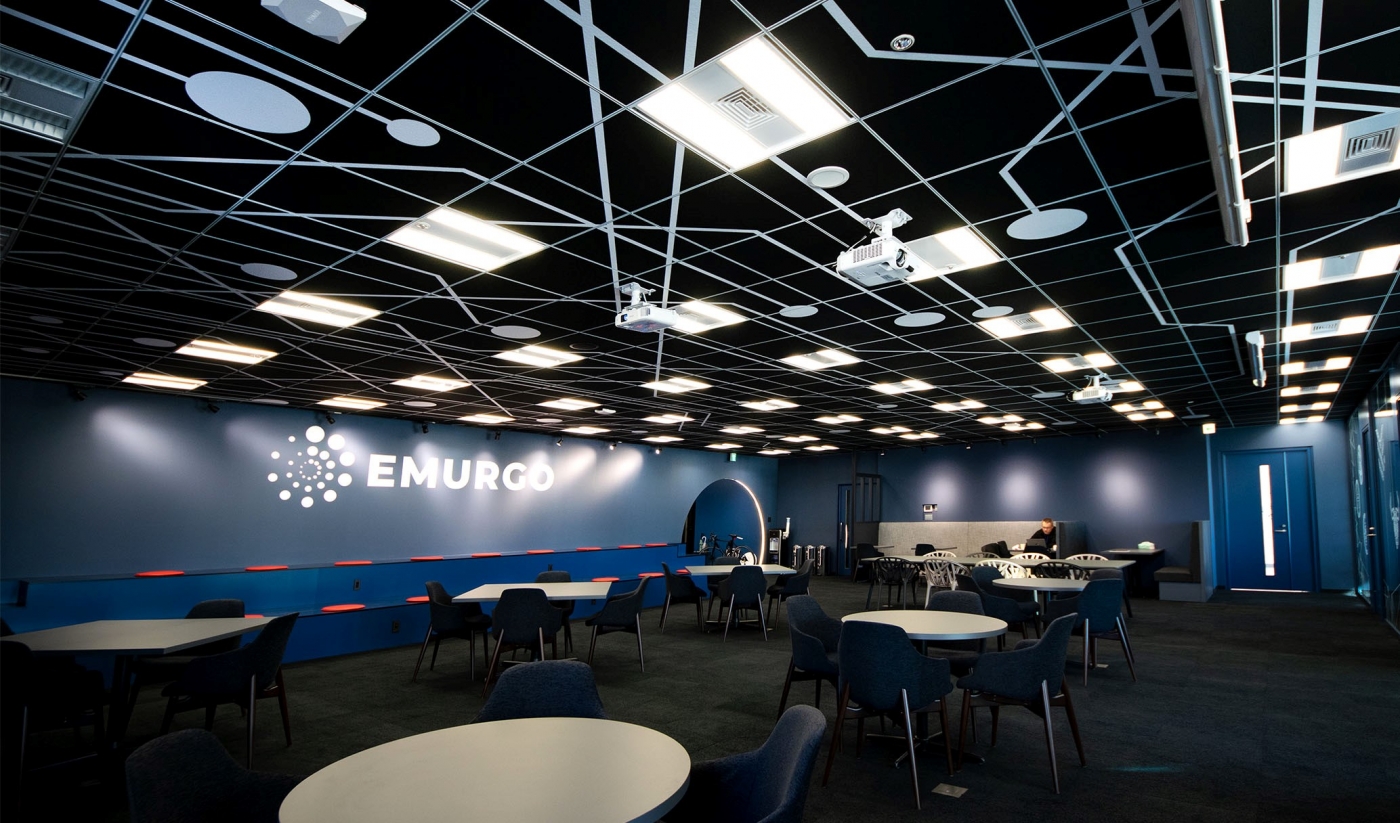 仮想通貨・ブロックチェーンというテーマと同時に、インスタグラムやTwitterに上げたくなるようなオフィスというご要望を頂き、空間をデザインしました。帯状の照明で無数の光の輪を構築したり、天井にブロックチェーンをイメージしたグラフィックを施したり、ガラス面にポリゴンデザイングラフィックで加工した人物の肖像を描いたりと、お客様のCIを尊重しながら革新的なデザインを数多く導入。オリジナリティのある空間になっています。また、「創造する」オフィスとして、エントランスからすぐの場所に社内外で利用できる広々としたコミュニケーションスペースをレイアウト。ひな壇もあるので収容人数が大きく、大規模なセミナーやイベントにも対応が可能です。カラーリングはコーポレートカラーに絞ってデザインし、引き締まった印象に。EMURGO様の更なる飛翔の舞台として相応しいオフィスが完成しました。