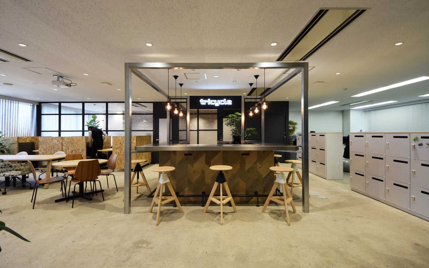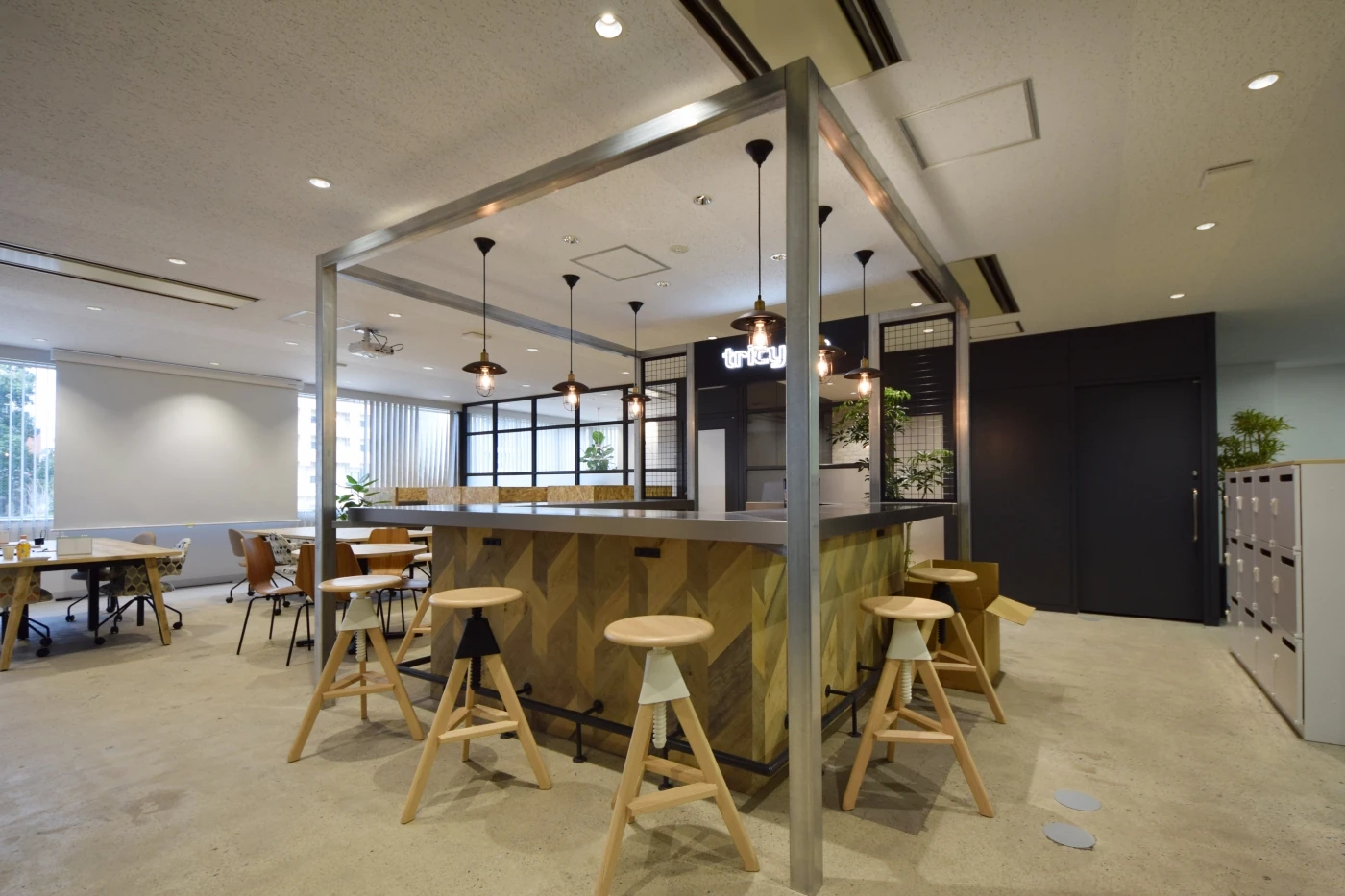 「リサイクルから連想する武骨で無機質なイメージと、親しみやすい雰囲気を掛け合わせたデザインにしたい」というご要望を叶えるべく、使用する素材や色合い、床の見た目など細部にまでこだわり、サーキュラー・エコノミーの実現を目指すトライシクル様らしさを空間全体で表現しました。オフィスのシンボルとなるカフェカウンターは、スチールの角パイプで矢倉を組み、循環型社会を創るという事業内容を感じさせると共に訪れる人々に大きなインパクトを与えます。中央のサインにはLEDの発光サインを採用し、空間にアクセントを加えました。