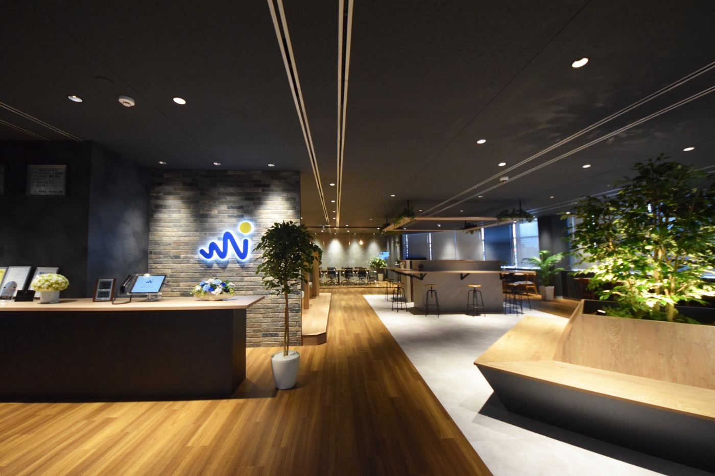 1Fで外に面している空間でしたので、通行する人や他の階に訪れる方の目線も考えてデザインしました。照度を落とし落ち着いた雰囲気にする一方、ブラインドの上げ下げで外光を調整することにより空間の表情が180°様変わりします。様々な素材を用いて洗練された雰囲気を出しつつ、グリーンを多用することでナチュラルさも演出しております。フリースペースでは社員様が気分を変えて仕事ができるように様々なスポットを用意いたしました。来社されるお客様や働かれている社員様によっても雰囲気が変わる多様な表情を持ったオフィスになりました。