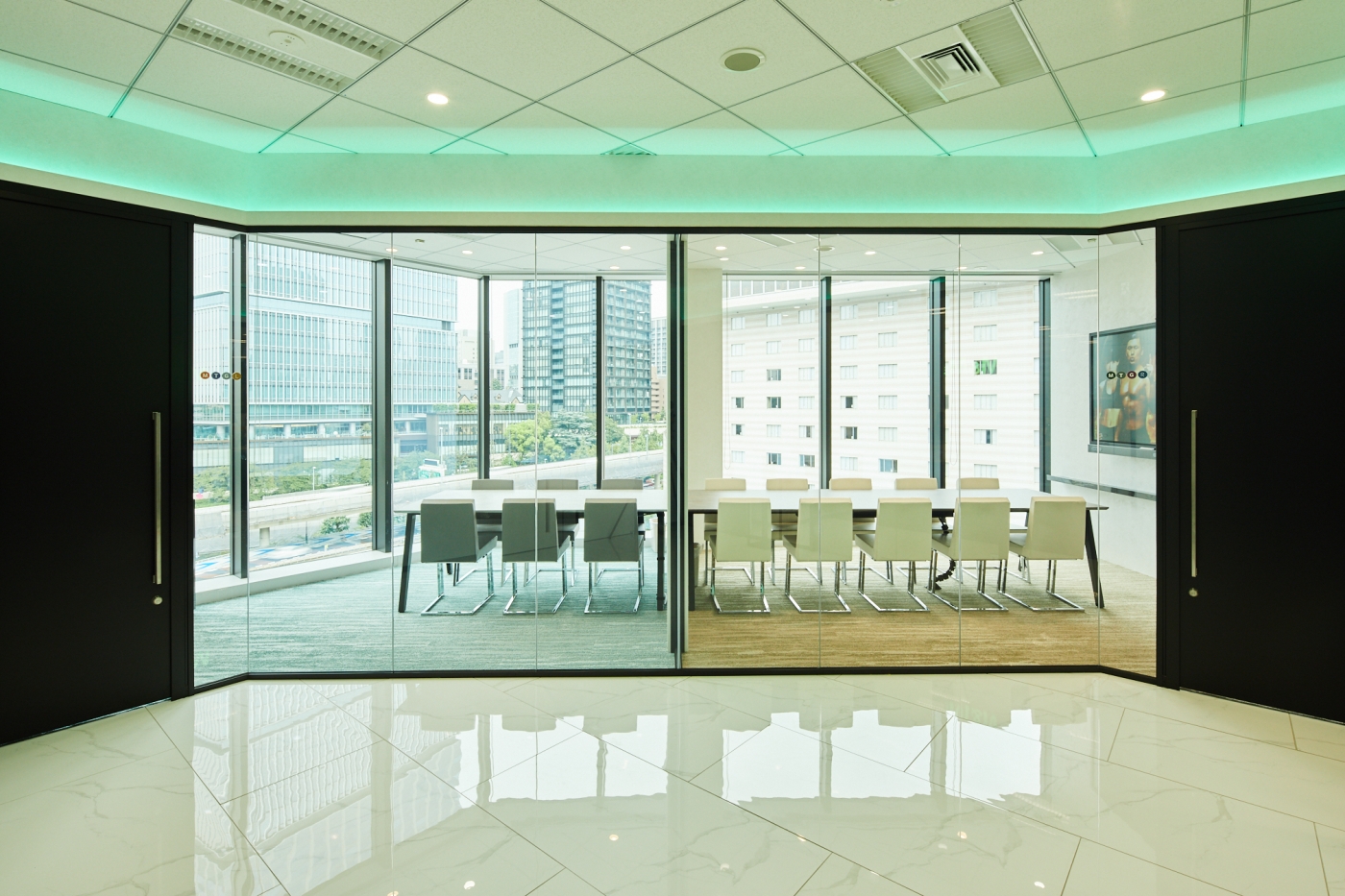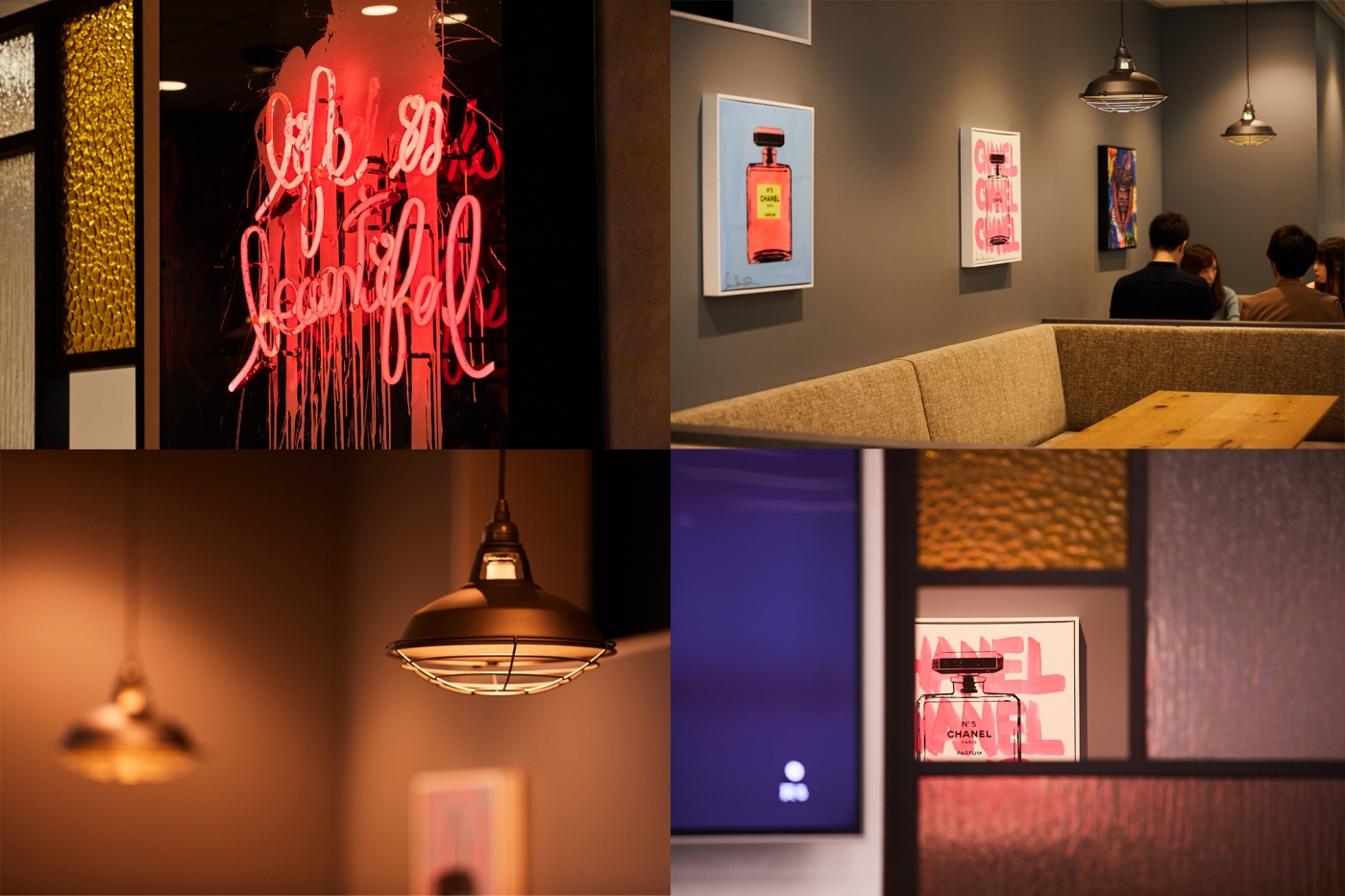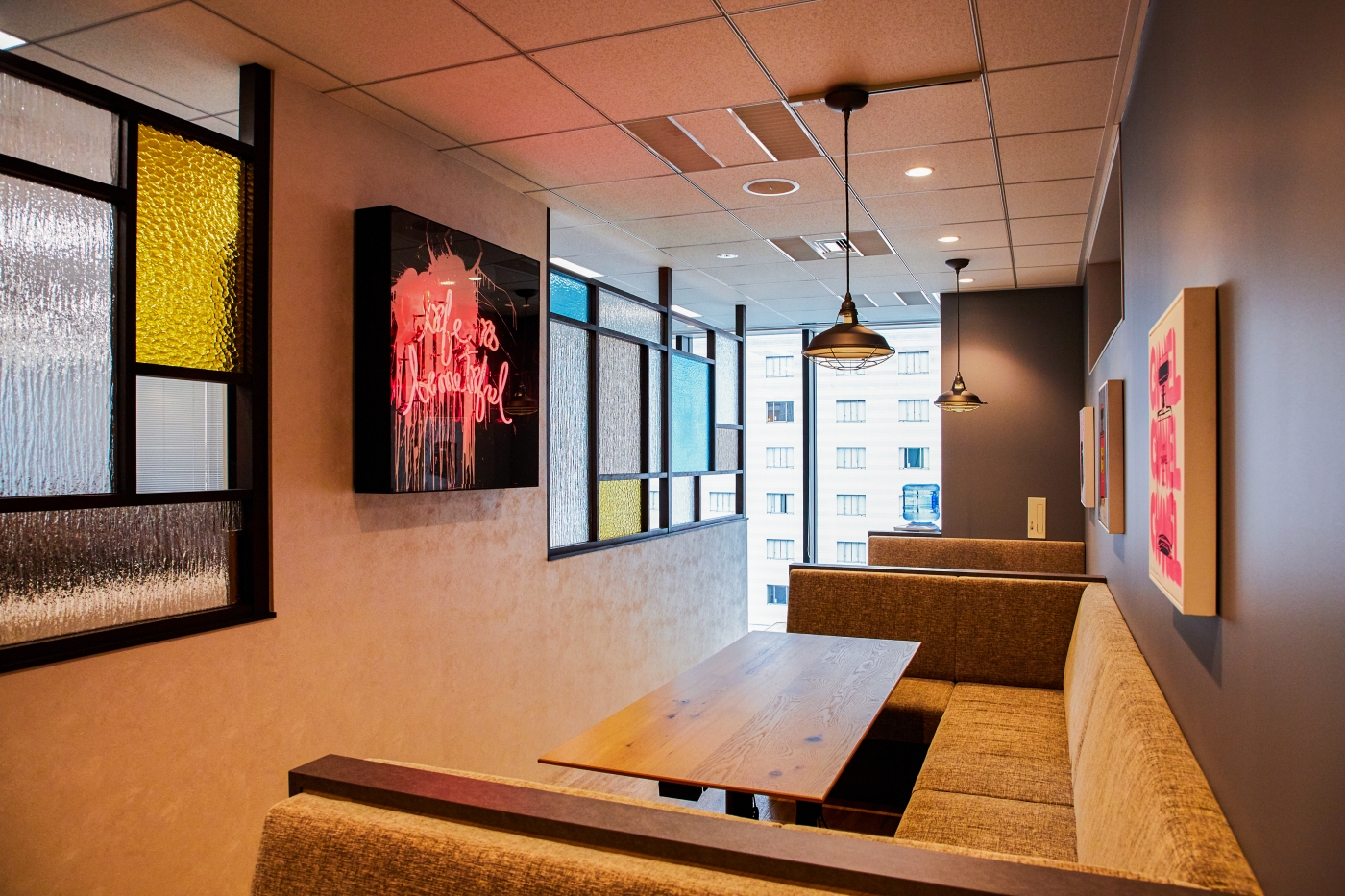 前回のご移転からわずか2年半、人員増加に伴うご移転プロジェクトのお手伝いをさせて頂きました。新築の眺望のよいビルへのご移転でしたので、その眺めを十分に活かしガラスを多用した空間となっています。エントランスはタイルやカラーガラスを用いツルンとした質感で高級感を持たせ、リフレッシュスペースは前回のデザインを継承し木目とアンティークガラスで構成するなど、それぞれのエリアで違った表情を感じられます。七色のグラデーションに光る間接照明、吊り下げサインやネオンのアートなど、色が映えるアイテムがふんだんに取り入れられた心躍る空間が出来上がりました。