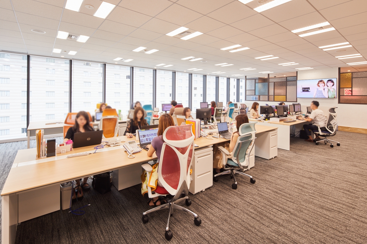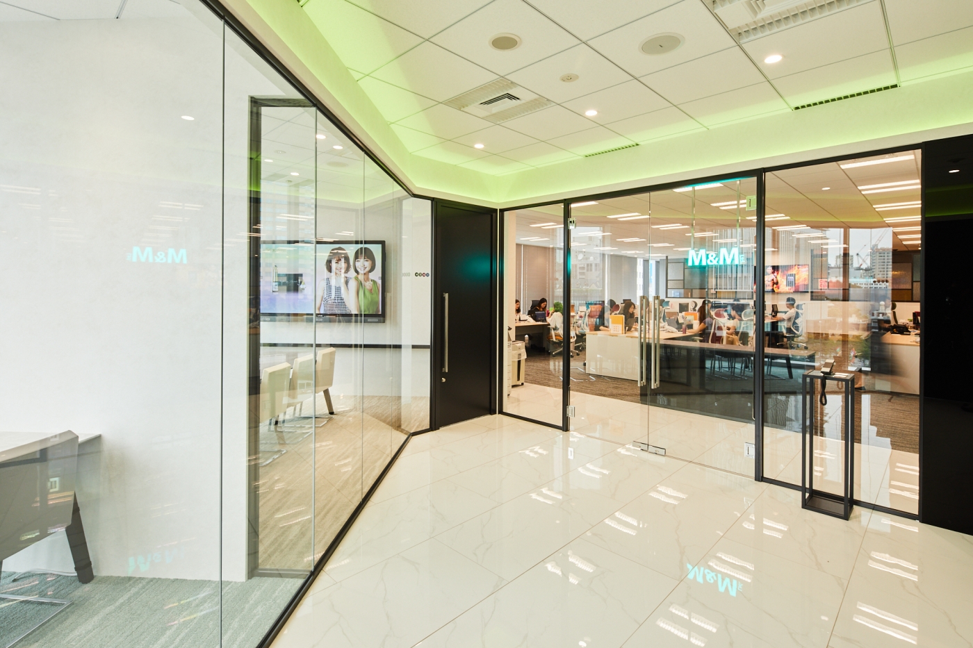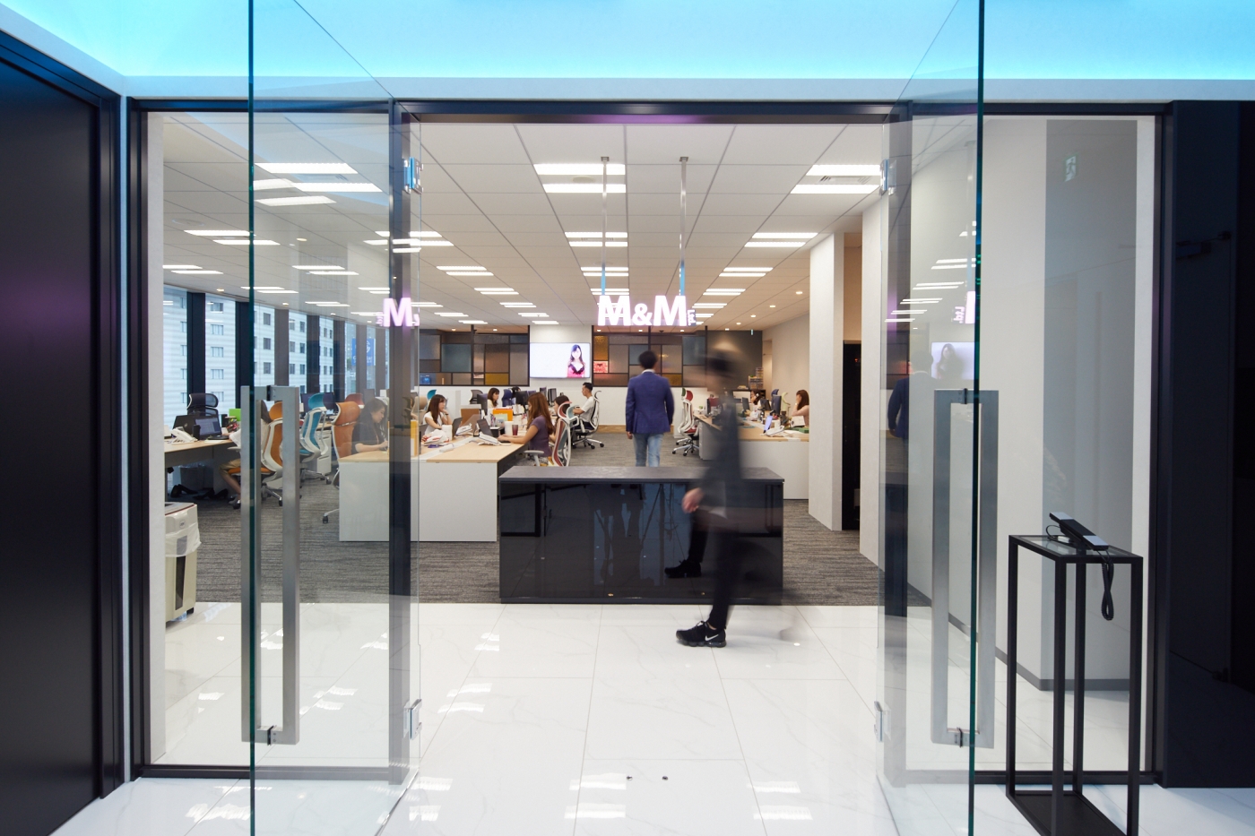 前回のご移転からわずか2年半、人員増加に伴うご移転プロジェクトのお手伝いをさせて頂きました。新築の眺望のよいビルへのご移転でしたので、その眺めを十分に活かしガラスを多用した空間となっています。エントランスはタイルやカラーガラスを用いツルンとした質感で高級感を持たせ、リフレッシュスペースは前回のデザインを継承し木目とアンティークガラスで構成するなど、それぞれのエリアで違った表情を感じられます。七色のグラデーションに光る間接照明、吊り下げサインやネオンのアートなど、色が映えるアイテムがふんだんに取り入れられた心躍る空間が出来上がりました。