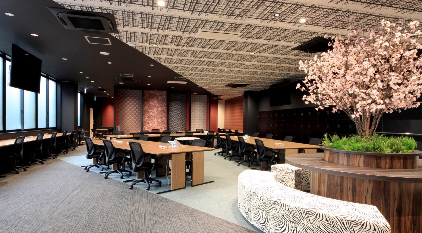 外国人の働き方を全面的にバックアップする複合施設「YOLO BASE」内に設けたオフィススペース。オフィスへ入室すると、YOLO JAPAN様のロゴマークをイメージして作成した桜のシンボルツリーが印象的なMTGスペースがお出迎え。さらに、随所に日本を感じる和柄のクロスをふんだんに使い、空間を”和”一色に染め上げることでYOLO BASEの全体イメージとマッチさせることができました。集中スペースやナップルームなど限られた空間にたくさんのシカケを設けました。