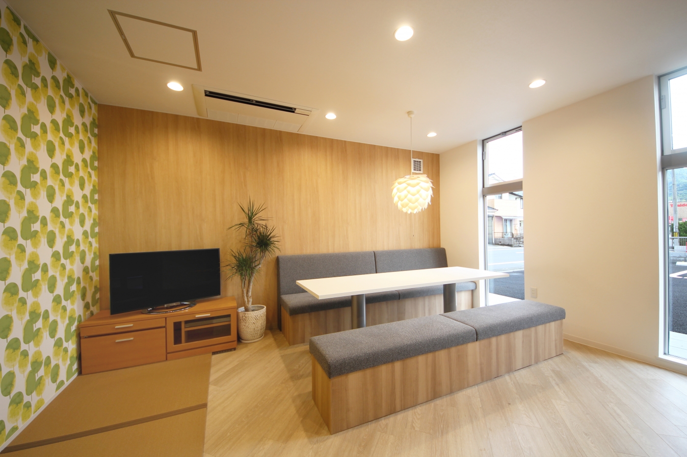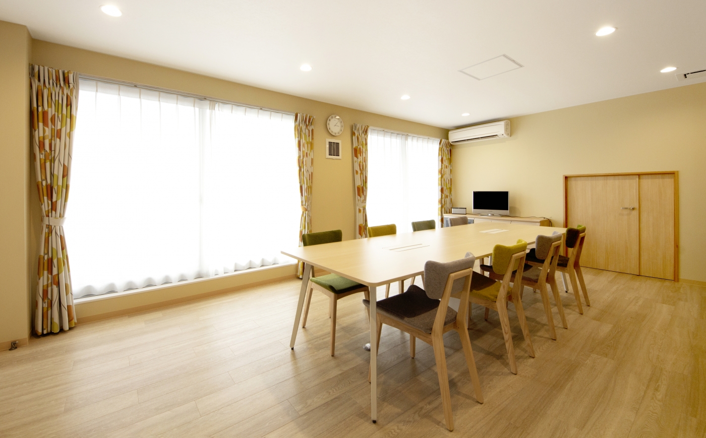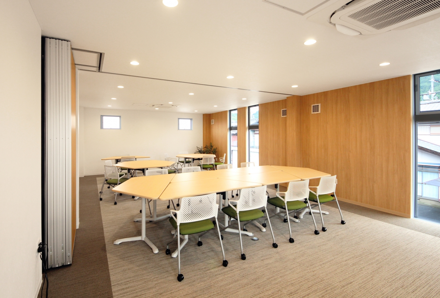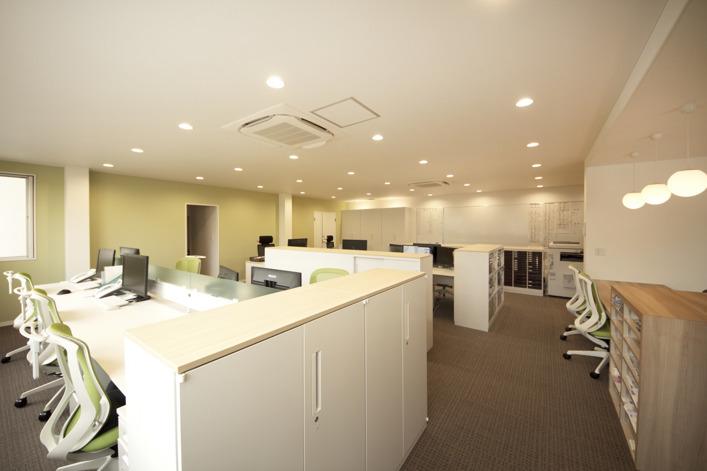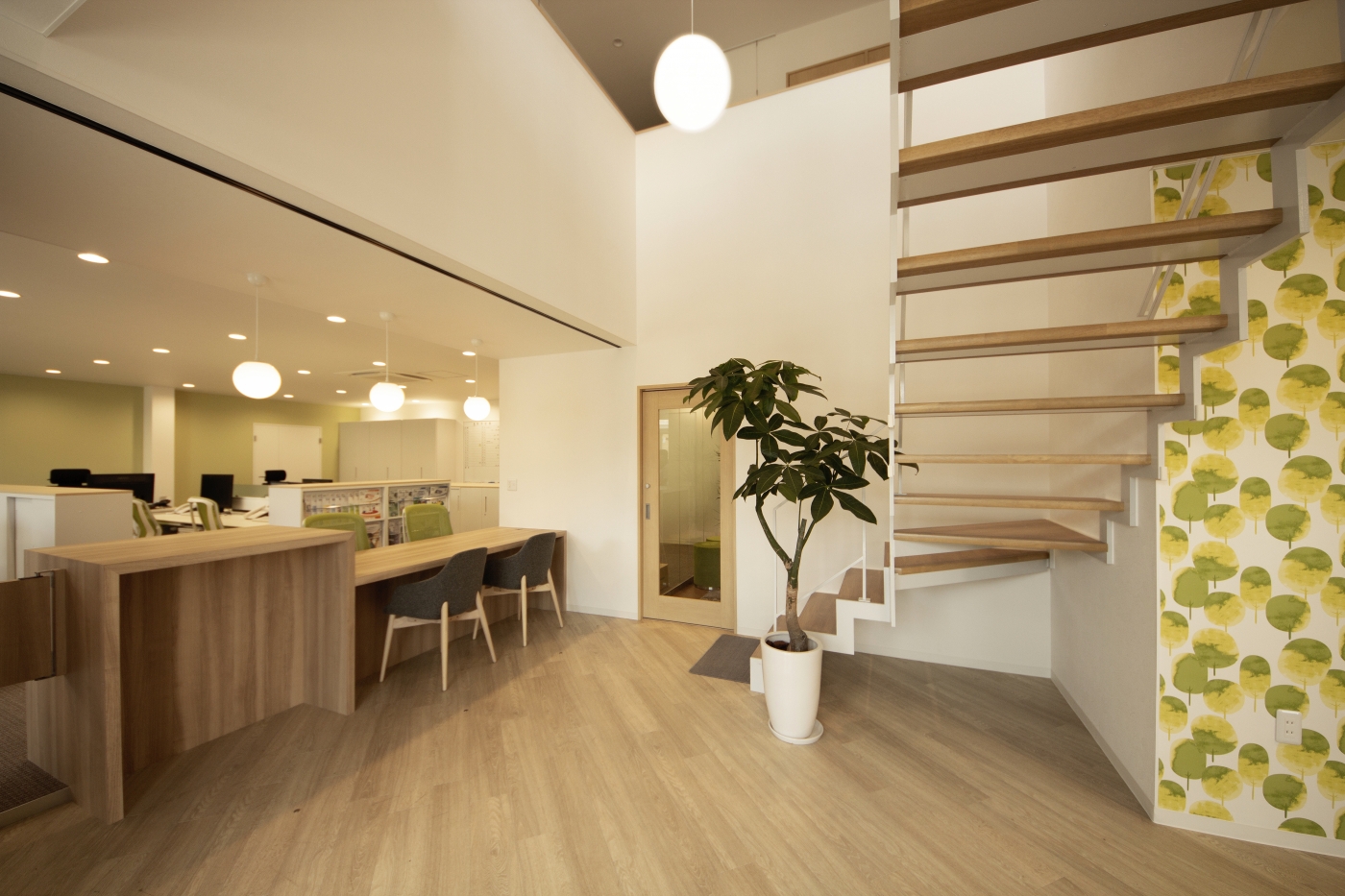 新築ビルの内装設計・施工を任せていただきました。「地域密着型の保険代理店として、人が気軽に集まる場所にしたい」というご要望をいただき、立ち寄りやすく、過ごしやすい空間をデザインしました。色調は木目や白色をベースに構成し、壁やチェアの色にはコーポレートカラーのグリーンを取り入れました。照明はダウンライトにすることで、温かさを感じられる空間を演出しています。