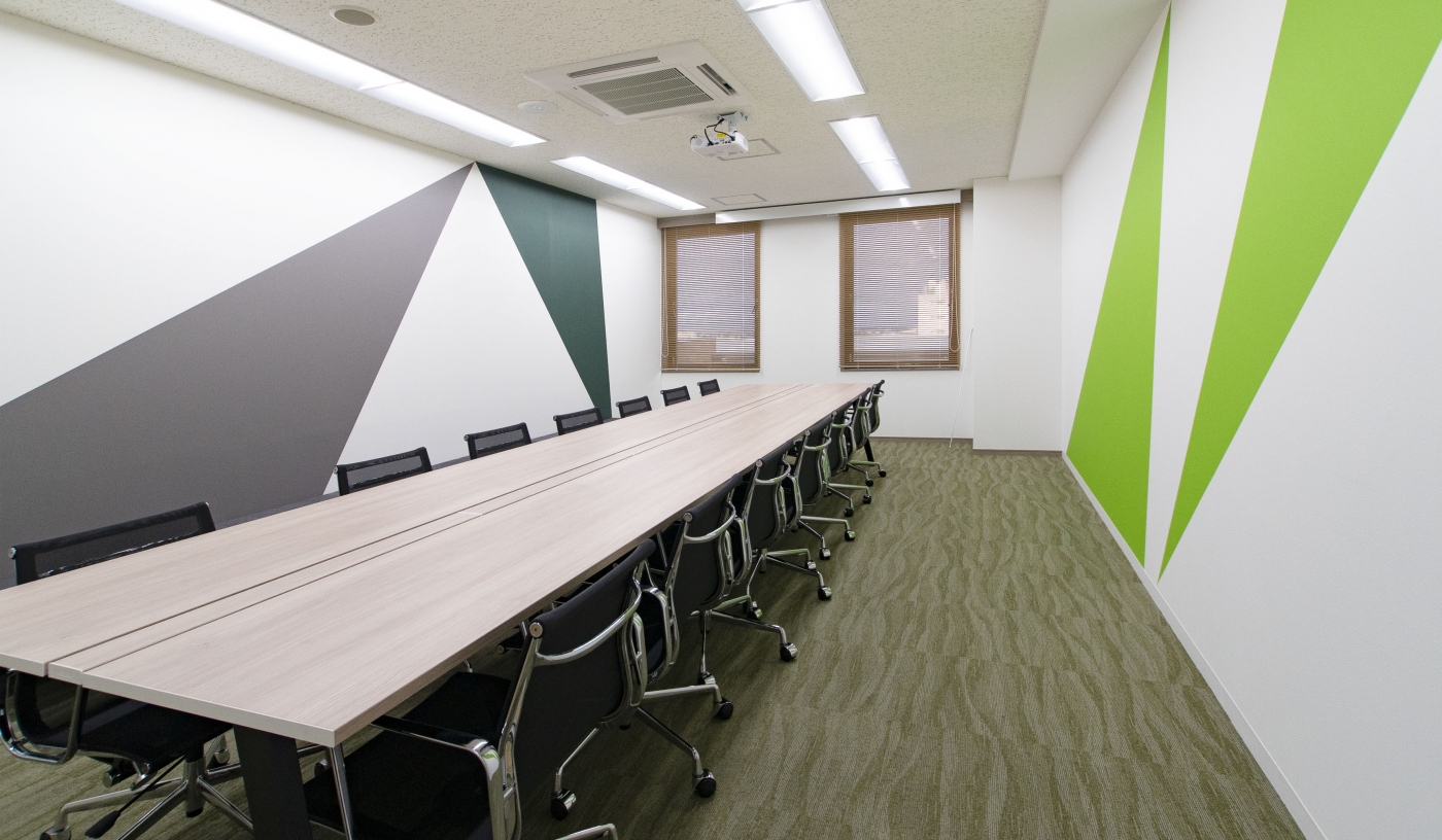 仙台の地から全国へ発信することをテーマにオフィスをつくりました。エントランスはユーメディア様のカラーを感じられる空間。ロゴを壁から床まで使って大きく表現し、中央のサインは仙台市の地図の形を取り入れました。地元仙台からサービスを発信していることを表しています。会議室は色を表現する成分である「シアン、マゼンタ、イエロー」をガラス壁として取り入れ、そのまま会議室名にもしています。フリースペースのある8階は多目的に使える場として「Park」をテーマにデザインしました。低めの椅子でこもり感のある集中ブースや、大人数での会議も可能なひな壇を取り入れるなど、個人が働く場所を選べるABWを実現し、働き方改革を進めるオフィスとなりました。