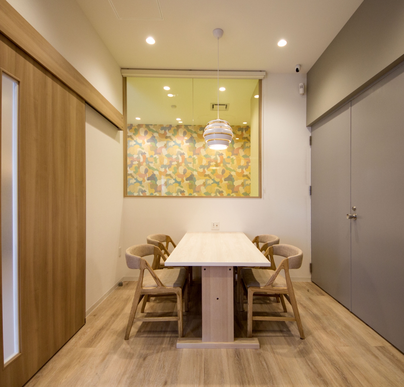 名古屋市・新瑞橋に新たな店舗を開設しました。全体的に木目とブラウンベージュをベースに落ちついた配色にし、特徴的なペンダントライトで空間にアクセントを加えています。温かみのある空間になるよう木目の家具を選定し、居心地がよく明るい空間をつくりました。ファミリーが多い地域でもあるので、お子様のいるお客様が落ち着いて住まいの相談ができるよう、キッズスペース付きの個室を2つ設け、すべてのオープンブースからキッズスペースの様子をうかがえる設計に工夫しています。