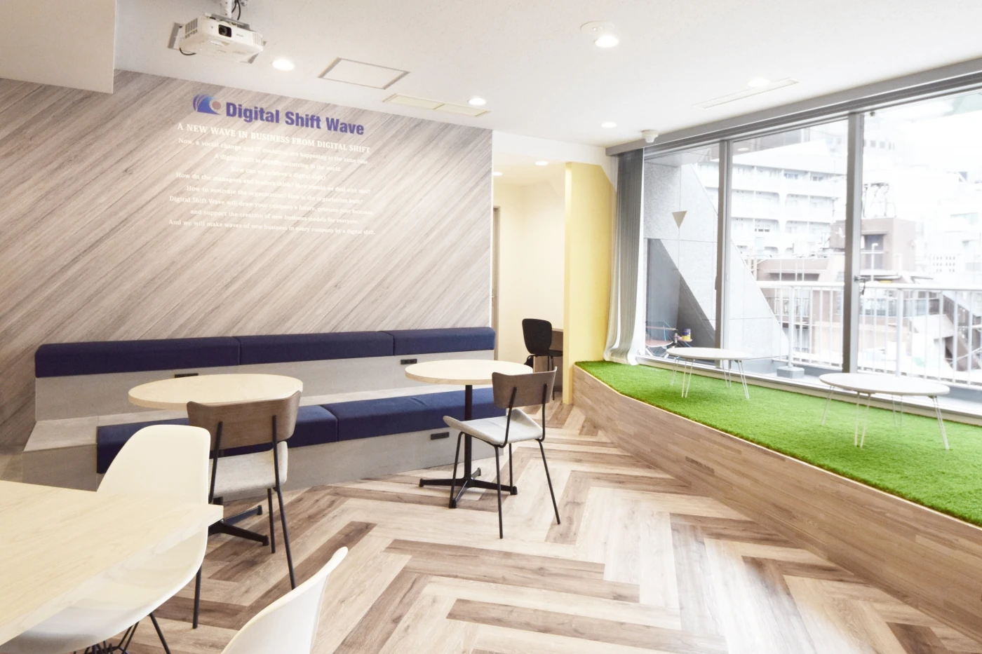 デジタルシフトウェーブ様の新しい働き方を実現できるオフィス空間を最優先に考えました。エントランスから続くフリースペースでは、今まで外部で行っていたセミナーを社内で実施することをメインの目的とし、どの時間帯でも気軽に使える空間を目指しました。使い方に応じて【選べて】、目的に応じて【変えられて】、社内外共に【繋がれる】、このようなキーワードを元に様々な用途の席を設けました。床上げスペースはランチタイムに寛ぐことができ、ひな壇後ろの壁面には社名やビジョンを描くことでフォトスポット(発信場所)となりました。また、カウンター席を設けたことで立食パーティ等でも使えます。様々な高さの家具のバリエーションと斜めに立てた間仕切り壁とが相まって動きのある空間となりました。